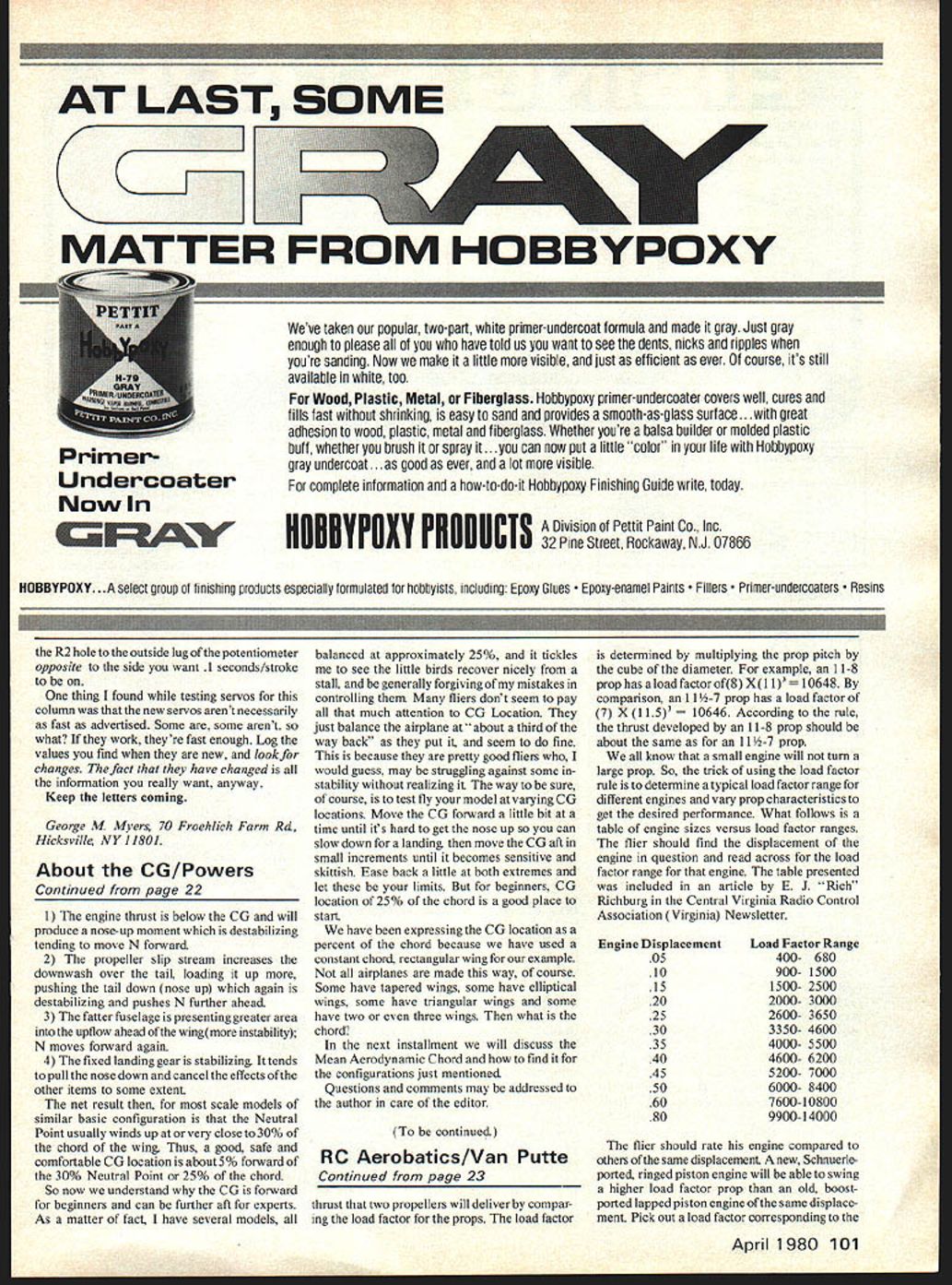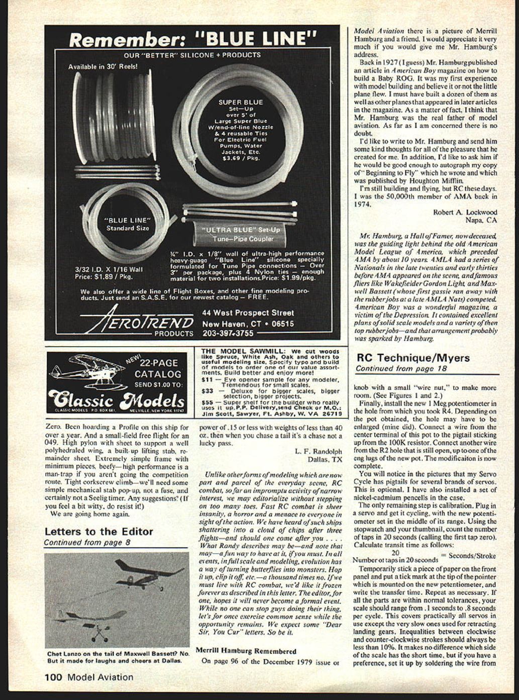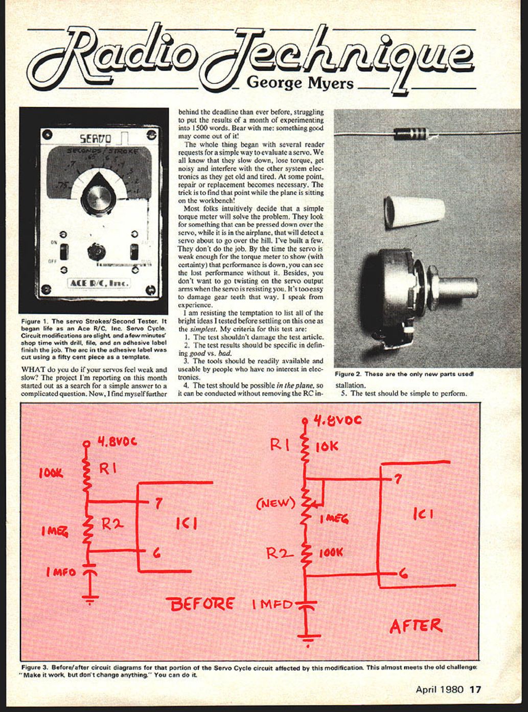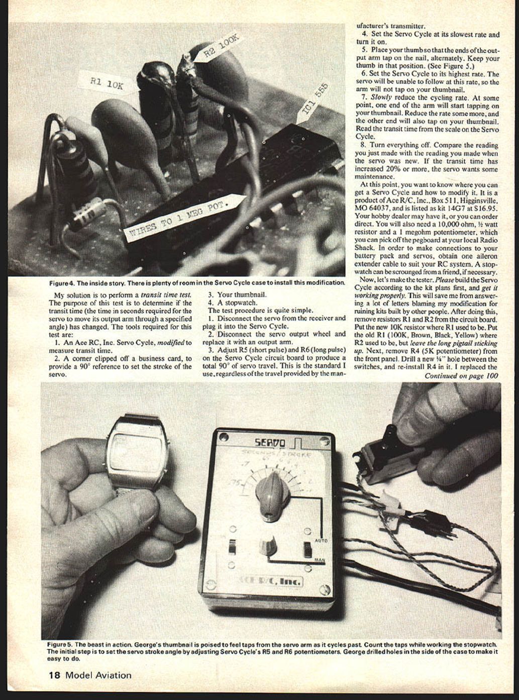 George Myers g behind deadline ever before struggling put results month experimenting 1500 words Bear something good may come out whole thing began several reader requests simple way evaluate servo know slow down lose torque get noisy interfere other system elec tronics get old tired some point repair replacement becomes necessary trick find point plane sitting workbench Most folks intuitively decide simple torque meter will solve problem look something can pressed down over servo airplane will detect servo about go over hill Ive built few dont job time servo weak enough torque meter show certainty performance down can see lost performance Besides dont want go twisting servo output arms servo resisting Its too easy damage gear teeth way speak experience am resisting temptation list bright ideas tested before settling simplest criteria test 1 The test shouldnt damage test article 2 The test results should specific defin ing good vs bad 3 The tools should readily available useable people have no interest elec tronics 4 The test should possible plane can conducted removing RC ind 4 4 d p q8V0L 10K p 7 I4 IJ p pp IMUO S IL 4 Figure 3 Before/after circuit diagrams portion Servo Cycle circuit affected modification almost meets old challenge Make work dont change anything can April 1980 17 RI New Figure 1 servo Strokes/Second Tester began life Ace R/C Inc Servo Cycle Circuit modifications slight few minutes shop time drill file adhesive label finish job arc adhesive label cut using fifty cent piece template WHAT servos feel weak slow project Im reporting month started out search simple answer complicated question Now find myself further 4 lOOK 4 4 1-igure 2 flese new parts used stallation 5 The test should simple perform 7 IC 9 AFTER solution perform transit time test purpose test determine transit time time seconds required servo move its output arm through specified angle has changed tools required test 1 An Ace RC Inc Servo Cycle mod fled measure transit time 2 A corner clipped off business card provide 900 reference set stroke servo 3 Your thumbnail 4 A stopwatch test procedure quite simple 1 Disconnect servo receiver plug Servo Cycle 2 Disconnect servo output wheel replace output arm 3 AdjustR5 shortpulseandR6 longpulse Servo Cycle circuit board produce total 9Q0 servo travel standard use regardless travel provided manufacturers transmitter 4 Set Servo Cycle its slowest rate turn 5 Place thumb ends out put arm tap nail alternately Keep thumb position See Figure 5 6 Set Servo Cycle its highest rate servo will unable follow rate arm will tap thumbnail 7 Slowly reduce cycling rate some point end arm will start tapping thumbnail Reduce rate some other end will also tap thumbnail Read transit time scale Servo Cycle 8 Turn everything off Compare reading just made reading made servo new transit time has increased 20% servo wants some maintenance point want know can get Servo Cycle modify product Ace R/C Inc Box 511 Higginsville MO 64037 listed kit 14G7 $1695 hobby dealer may have can order direct will also need 10000 ohm resistor 1 megohm potentiometer can pick off pegboard local Radio Shack order make connections battery pack servos obtain aileron extender cable suit RC system stop watch can scrounged friend necessary Now lets make tester Please build Servo Cycle according kit plans first get working properly will save answer ing lot letters blaming modification mining kits built other people After doing remove resistors Ri R2 circuit board Put new 10K resistor Ri used Put old Ri lOOK Brown Black Yellow R2 used leave long pigtail sticking up Next remove R4 5K potentiometer front panel Drill new between switches re-install R4 replaced Continued page 100 18 Model Aviation Figure 4 inside story plenty room servo Lycle case instaii mis mooiTicamion rigure 0 ne ueast action Georges thumbnail poised feel taps servo arm cycles past Count taps working stopwatch initial step set servo stroke angle adjusting Servo Cycles R5 R6 potentiometers George drilled holes side case make easy Zero Been hoarding Profile ship over year small-field free flight 049 High pyion sheet support well polyhedraled wing built-up lifting stab re mainder sheet Extremely simple frame minimum pieces beefyhigh performance man-trap arent going competition route Tight corkscrew climbwell need some simple mechanical stab pop-up fuse certainly Seelig timer Any suggestions feel bit witty resist going home again Letters Editor Continued page 8 power of15 less weights less 40 oz chase tail its chase lucky pass L F Randolph Dallas TX Unlike orherforms ofmodeling now part parcel everyday scene RC combat sofaran impromptu activity narrow interest may editorialize stepping too toes Fast RC combat sheer insanity horror menace everyone sight ofthe action have heard such ships shattering cloud chips after three flightsand should come after Randy describes may beand note maya fun way have Wyou must events infullscale modeling evolution has way turning butterflies monsters Hop up clip off etca thousand times no must live PC combat wed like frozen forever described letter editor hopes will never become formal event no can stop guys doing thing lets once exercise common sense opportunity remains expect some Dear Sir Cur letters So Merrill Hamburg Remembered page 96 December 1979 issue oi Model viation picture Merrill Hamburg friend would appreciate very much would give Mr Hamburgs address Back in1927Iguess Mr Hamburgpublished article merican Boy magazine build Baby ROG first experience model building believe little plane flew must have built dozen well other planes appeared later articles magazine As matter fact think Mr Hamburg real father model aviation As far am concerned no doubt Id like write Mr Hamburg send him some kind thoughts pleasure created addition Id like ask him would good enough autograph copy Beginning Fly wrote published Houghton Muffin Im still building flying RC days 50000th member AMA back 1974 Robert Lockwood Napa CA Mr Hamburg 