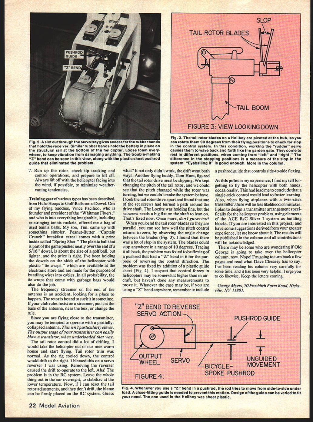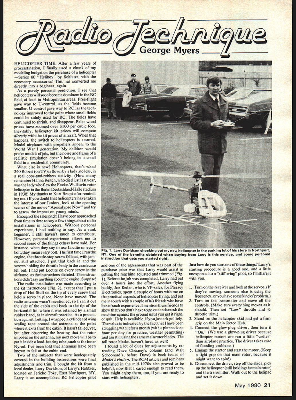corge Myers HELICOPTER TIME After few years procrastination finally used chunk modeling budget purchase helicopter Series 80 Heliboy Schiuter necessary accessories has converted directly beginner again As purely personal prediction see helicopters will soon become dominant RC field least Metropolitan areas Free-flight gave way U-control fields became smaller U-control gave way RC tech nology improved point small fields could safely used RC fields have continued shrink disappear Balsa wood prices have zoomed over $100 per cubic foot Inevitably helicopter kit prices will compete directly kit prices aircraft happens switch helicopters assured Model airplanes propellers appeal World War generation children would prefer models ofjets noise flame realistic simulation doesnt belong small field residential community What else new Helicopters thats what 240 Robert TV flown lady no less real cops-and-robbers activity remember Hanna Reitch died just last year lady flew Focke-Wulftwin-rotor helicopter Berlin Deutschland-Halle stadium 1938 thanks Kurt Reupke remind ing doubt helicopters have taken interest Juniors look opening scenes movie Apocalypse Now try assess impact young minds Enough sales pitch have approached time time say few things about radio installations helicopters Without personal experience nothing say As rank beginner still havent much contribute However personal experience allows second some things others have said instance say use Loctite bolt mean bolt first time Iran engine throttle-stop screw fell out jamnut still attached put back screws holding throttle body crankcase fell out put Loctite screw airframe instructions dictated instruc tions didnt say anything about engine Surprise radio installation made according kit instructions Fig 2 except put drop Hot Stuff tip screw held servo place None have moved radio antenna wasnt mentioned ran out side cabin back tip horizontal fin retained small rubber band aircraft practice As precau tion against fretting wrapped cylinder wing sealing tape around antenna point exits cabin hasnt failed yet after observing beating rotor imposes antenna next move will put inside load-bearing tube such inner Nyrod Ive told antennas have known fail cabin end Two subjects inadequately covered building instructions final adjustments trim bought kit local dealer Lany Davidson Larrys Hobbies located Jericho Tpke East Northport NY Larry accomplished RC helicopter pilot agreements part purchase price Larry would assist getting machine adjusted trimmed Fig 1 Before job completed Larry put over 4 hours effort Another flying buddy Joe Redan VP-sales Plessey Electronics spent couple hours practical aspects helicopter flying put touch couple ofhis friends have lots such experience mention friends show dont have go Out smash machine against ground until get right quit Help available just ask politely value indicated fact have struggling month planned hour per day practice weather permitting am still using same main rotor blades tail rotor blades havent fared well found lot clues adjustments re reading Dave Chesneys column Walt Schoonards before Dave back issues ModelAviation RCM articles seminars published mid-1970s also proved helpful now cared enough read might enjoy too ready start helicopters Just start things Larrys starting procedure good little unexpected stiff-wing pilot Ill share 1 Turn receiver look servos theyre moving someone else using frequency have some kind problem 2 Turn transmitter move controls Make sure everything moves should set Low throttle throttle trim 3 Stand helicopter skid get firm grip Main Rotor Hub 4 Connect glow-plug driver turn use giow-plug driver because helicopter motors run little wetter airplane practice driver takes care flooding problems 5 Engage starter start motor Keep tight grip main rotor because might want spin 6 Disconnect driver step off skids pick up helicopter still holding main rotor transmitter Walk out helipad set down May 1980 21 NY O&i ui uenrniis urnaneo wnen guying arry mis service instruction gets started right 7 Run up rotor check tip tracking control operations prepare lift off Always lift off helicopter facing wind possible minimize weather vaning tendencies Training gear various types has described Hula-Hoops Golf-Balls-on-a-Dowel flying buddies Vince Pacifico founder president Whitman Flyers everything imaginable including re-stringing tennis rackets offered bag used tennis balls son Tim came up something simpler Peanut-Butter Captain Crunch breakfast cereal comes prize inside called Spring Shot plastic ball part game pushes neatly over end 5/16 dowel about size golf ball lighter price right Ive holding dowels skids helicopter plastic ~tie-wraps available electronic store made purpose bundling wires cables probability tie-wraps come garbage bags would also job frequency streamer end antenna accident looking place happen rotor bound suck sometime club rules insist streamer put base antenna near box change rule Since flying close transmitter may tempted operate partiallycollapsed antenna isn tparticularly clever output stage transmitter can easily blow transistor underloaded way tail rotor control did lot drifting would take helicopter out nice warm house start flying Tail rotor trim normal As rig cooled down control would drift right 1 blamed servo reverser using Removing reverser caused drift operate left Aha problem RC system Leave whole thing out car overnight stabilize lower temperature Now can reset tail rotor adjustments dont drift blame can firmly placed RC system Guess what didnt work drift went both ways Another flying buddy Tom Hunt figured tall rotor drive must slipping kept changing pitch tail rotor could see pitch changed rotor turning couldnt make system behave took tail rotor drive apart found set screws burned path around drive shaft Loctite holding fine setscrew needs big flat shaft lean Thats fixed now Once don t guess-test bend tail rotor blades parallel can see well pitch control retur