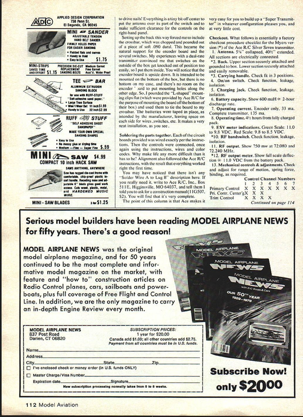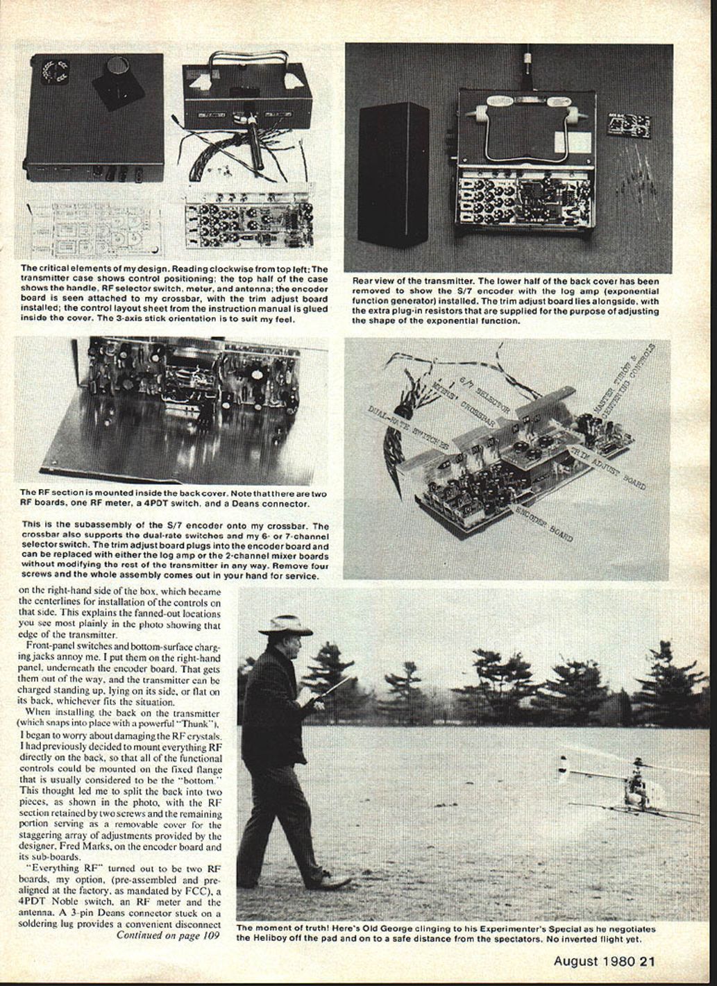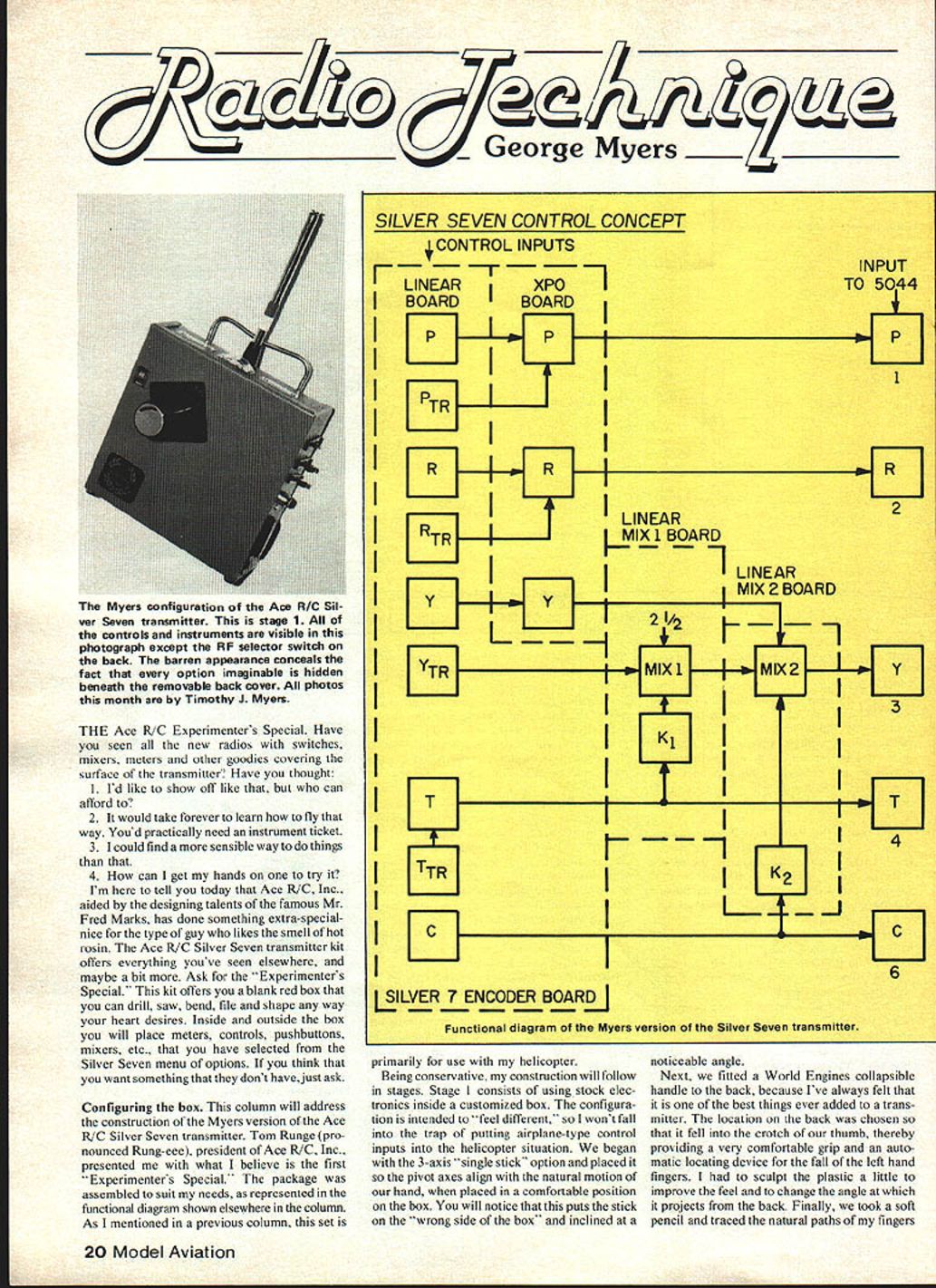 George Myers THE Ace R/C Experimenters Special Have seen new radios switches mixers meters other goodies covering surface transmitter Have thought 1 Id like show off like can afford 2 It would take forever learn fly way Youd practically need instrument ticket 3 I could find sensible way things 4 How can get hands try Im tell today Ace RYC Inc. aided designing talents famous Mr Fred Marks has done something extra-specialnice type guy likes smell hot rosin Ace R/C Silver Seven transmitter kit offers everything youve seen elsewhere maybe bit Ask Experimenters Special kit offers blank red box can drill saw bend file shape way heart desires Inside outside box will place meters controls pushbuttons mixers etc have selected Silver Seven menu options think want something dont havejust ask Configuring box column will address construction Myers version Ace R/C Silver Seven transmitter Tom Runge pro nounced Rung-eee president Ace R/C Inc presented what believe first Experimenters Special package assembled suit needs represented functional diagram shown elsewhere column As mentioned previous column set SILVER SEVEN CONTROL CONCEPT CONTROL INPUTS IBOARDBOARDI II I1IJI TR RTR II II I ILVER 7 ENCODER BOARj INPUT TO 5044 P LINEAR k MIX 1 BOARD LINEAR MIX 2BOARD U 2 -1 Y 4 L4 I-I- primarily use helicopter Being conservative construction will follow stages Stage consists using stock elec tronics inside customized box configura tion intended feel different wont fall trap putting airplane-type control inputs helicopter situation began 3-axis single stick option placed pivot axes align natural motion hand placed comfortable position box will notice puts stick wrong side box inclined noticeable angle Next fitted World Engines collapsible handle back because Ive always felt best things ever added trans mitter location back chosen fell crotch thumb thereby providing very comfortable grip auto matic locating device fall left hand fingers sculpt plastic little improve feel change angle projects back Finally took soft pencil traced natural paths fingers 20 Model Aviation Myers configuration Ace R/C Sil ver Seven transmitter stage 1 controls instruments visible photograph except RF selector switch back barren appearance conceals fact option imaginable hidden beneath removable back cover photos month Timothy J Myers 6 Functional diagram Myers version Silver Seven transmitter critical elements mydesign Reading clockwise top left transmitter case shows control positioning top half case Hear view transmitter ne lower nait back cover nas shows handle RF selector switch meter antenna encoder removed show 5/7 encoder log amp exponential board seen attached crossbar trim adjust board function generator installed trim adjust board lies alongside installed control layout sheet instruction manual glued extra plug-in resistors supplied purpose adjusting inside cover 3-axis stick orientation suit feel shape exponential function RF section mounted inside back cover Notethatthere aretwo RF boards RF meter 4PDT switch Deans connector subassembly 5/7 encoder onto crossbar crossbar also supports dual-rate switches 6- 7-channel selector switch trim adjust board plugs encoder board can replaced either log amp 2-channel mixer boards modifying rest transmitter way Remove four screws whole assembly comes Out hand service right-hand side box became centerlines installation controls side explains fanned-out locations see plainly photo showing edge transmitter Front-panel switches bottom-surface charg ing jacks annoy put right-hand panel underneath encoder board gets out way transmitter can charged standing up lying its side flat its back whichever fits situation installing back transmitter snaps place powerful Thunk began worry about damaging RF crystals previously decided mount everything RF directly back functional controls could mounted fixed flange usually considered bottom thought led split back two pieces shown photo RF section retained two screws remaining portion serving removable cover staggering array adjustments provided designer Fred Marks encoder board its sub-boards Everything RF turned Out two RF boards option pre-assembled pre aligned factory mandated FCC 4PDT Noble switch RF meter antenna 3-pin Deans connector stuck soldering lug provides convenient disconnect Continued page 109 August 198021 moment truth Heres Old George clinging Experimenters Special negotiates Heliboy off pad safe distance spectators No inverted flight yet POSITIVE NO LEAK AND PRESSURE SHUTOFF VALVE PERFECT FOR Smoke systems--anyone plane large enough install separate smoke tank can incorporate super smoker added flying enjoyment Inflight Fuel Shutoffs Pylon Free Flight R/C SUPER SIMPLE AND EASY TO INSTALL valve compact enough mount anywhere -- position requires extra servo operate Du-Bro Super Smoker comes assembled complete 34 neoprene fuel tubing two pressure fittings mounting screws complete instructions CAT NO 255 C 7U 1QJ DU-BAO PRODUCTS INC 480 Banner Bond Wou ondo nos 60084 3000 feet care 4000-ft range present AMA altitude record 3400 feet Unlimited held Jack Hiner World FAT altitude record 4988 feet SOAR club members John Dineen present holder AMA National record 2-meter flight 2050 feet see what could accomplished model size Pegasus Remember accord ing FAI rules total all-up weight model cannot exceed 11 pounds may find does Jack Hiner launching Noon Balloon climbing cloud bases afternoon progresses best way get really high altitudes Locating CG main wing blade safest stable position altitude flight Conclusion Much preceding can applied soaring models have found advice will apply especially large models best suited flying high far thanks go Jack Hiner advice flying model John Dineen help laying up original fuselage other SOAR members cooperation support Last course least appreciation must go both wife mother have over years put up lot mess bother associated hobby yet still capable showing enthusiasm new project takes sky RC Technique/Myers con