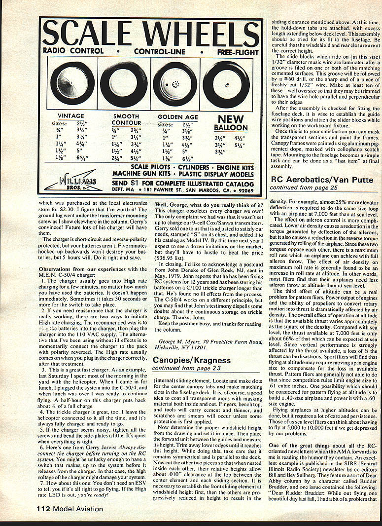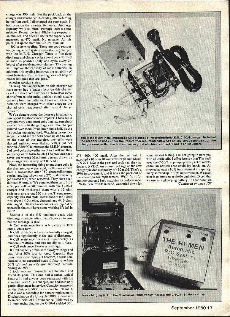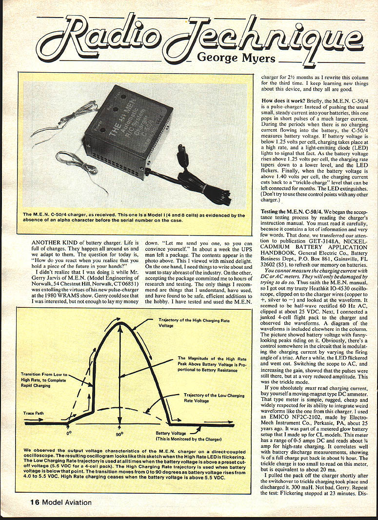 George Myers ANOTHER KIND battery charger Life full changes happen around us adapt question today react realize hold piece future hands didnt realize doing Mr Gerry Jarvis MEN Model Engineering Norwalk 54 Chestnut Hill Norwalk CT 06851 extolling virtues new pulse-charger 1980 WRAMS show Gerry could see interested enough lay money 7 Transition Low High Rate Complete Rapid Charging Trace Path -__ 4 00 r 900 down Let send you can convince yourself about week UPS man left package contents appear photo above viewed mixed delight hand need things write about want stay abreast industry other accepting package committed hours research testing things recom mend things understand have used have found safe efficient additions hobby have tested used MEN Trajectory High Charging Rate Voltage Magnitude High Rate Peak Above Battery Voltage ia Pm portional Battery Resistance Trajectory Low Charging Rate Voltage x Battery Voftage Monitored Chargerl observed output voltage characteristics MEN charger direct-coupled oscilloscope resulting oscillogram looks like sketch High Rate LW flickering Low Charging Rate trajectory used stall times batteryvoltage above preset cut off voltage 55 VDC 4-cell pack High Charging Rate trajectory used battery voltage below point transition moves Oto go degrees battery voltage risestrom 40 55 VDC High Rate charging ceases battery voltage above 55 VDC charger 2 months rewrite column third time keep learning new things about device good does work Briefly MEN C-S 0/4 pulse-charger Instead pushing usual small steady current batteries pops short pulses much larger current During periods no charging current flowing battery C-50/4 measures battery voltage battery voltage below 125 volts per cell charging takes place high rate light-emitting diode LED lights signal fact As battery voltage rises above 125 volts per cell charging rate tapers down lower level LED flickers Finally battery voltage above 1 40 volts per cell charging current cuts back trickle-charge level can left connected months LED extinguishes Dont try use control points other charger Testing MEN C-50/4 began accep tance testing process reading chargers instruction manual must read carefully because contains lot information very few words done transferred atten tion publication GET-3148A NICKELCADMIUM BATTERY APPLICATION HANDBOOK General Electric Co Battery Business Dept PO Box 861 Gainsville FL 32602 $5 refresh memory batteries cannot measure charging current DCorACmeters will damaged trying Thus saith MEN manual got out trusty Heathkit 10-45 30 oscillo scope clipped charger wires copper er ed waveform seemed half-wave rectified 60 Hz AC clipped about 25 VDC Next connected junked 4-cell flight pack charger observed waveforms diagram waveforms included elsewhere column picture showed battery voltage funnylooking peaks riding Obviously theres control somewhere circuit modulat ing charging current varying firing angle triac After LED flickered went out Switching scope AC increasing gain showed pulses still very reduced amplitude trickle mode absolutely must read charging current buy yourself moving-magnet type DC ammeter type meter simple rugged cheap widely respected its ability integrate weird waveforms like charger used EMICO NF2C-2 102 made Electro Mech Instrument Co Perkasie PA about 25 years ago part metered glow battery setup made up CL models meter has range 0-5 amps DC reads about 3/4 amp high-rate charging correlates well battery discharge measurements showing full charge put back about trickle charge too small read meter equivalent about 20 ma pulled pack oil charger shortly after switchover trickle charging took place discharged 300 maH bad Gerry Repeat test Flickering stopped 23 minutes Dis 16 Model Aviation N MEN C-50/4 charger received isa Model 14 8 cells evidenced absence alpha character before serial number case charge 300 maH Put pack back charger went bed Next day after returning home work discharged pack again charger 16 hours Discharge capacity ws 475 maH Perhaps theres some mistake Repeat test Flickering stopped 34 minutes after 16 hours capacity measured 475 maH No mistake point 111 quote C-50/4 manual RC system cycling good reasons cycling RC system never before charged MEN Charger Three five deep discharge charge cycles should performed soon possible cycle 24 hours after receiving charger cycling will improve capacity batteries addition cycling improves reliability batteries Further cycling does help hinder batteries good Another portion states During factory tests charger have never battery kept charger develop short have able clear some shorts cells packs obtain usable capacity batteries However batteries charged other chargers shorted cells reappeared after several charge cycles Weve demonstrated increase capacity about short-circuit repairs took out very old very dead set cells somehow avoided trip garbage can charger grunted over hour half instruction manual advised Watching oscillo scope could see cells come up one start exercise two cells shorted two flat 0 VDC shorted After 90 minutes MEN charger 3 4 cells showed better 1 volt very warm touch previous pack never got warm Maximum current drawn charger 110 VAC Now interesting thing about cells over 4 years old removed transmitter after 750 charge/discharge cycles shown 275 maH capacity rated 600 removed have dormant 9 months punched up 135 volts per cell 90 minutes C-50/4 charger discharged 10 ohm resistor average 320 ma rate measured capacity 400 maH Resistance 3 cells about 1/10th ohm charged 4/10 ohm discharged characteristics typical used cells still have some working life left Section 6 GE handbook deals discharge characteristics wont quote message Cell resistance AA battery 028 ohms new Cell resistance lowest fully charged rises significantly end discharge Cell resistance increases significantly temperature drops less rapidly rises Cell resistance increases age Cell capacity diminishes slowly age use til 50% loss noted Capacity dimini