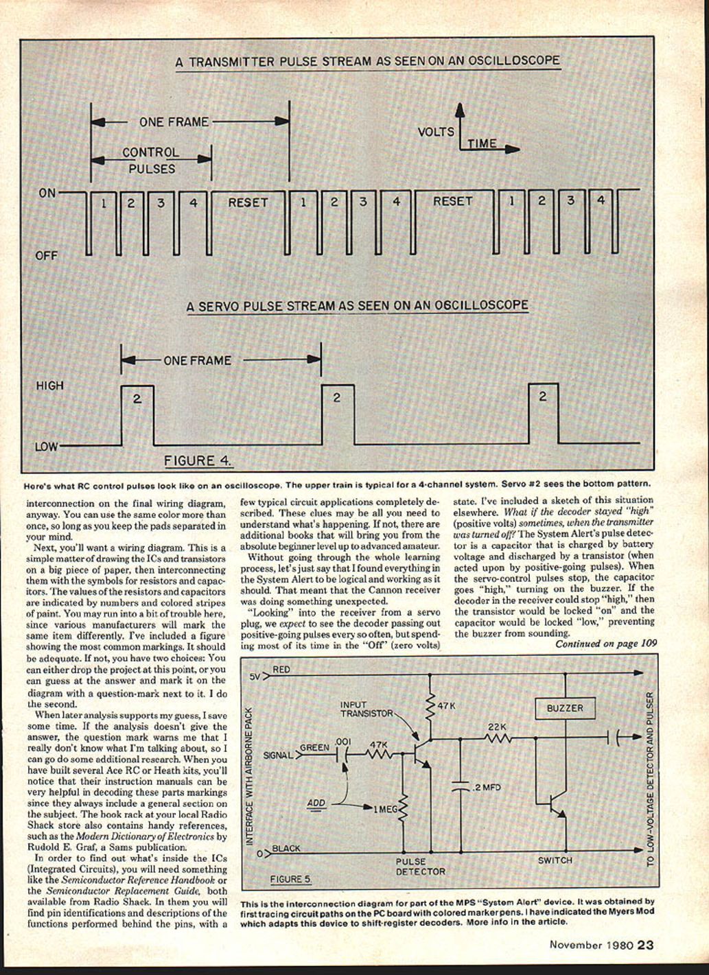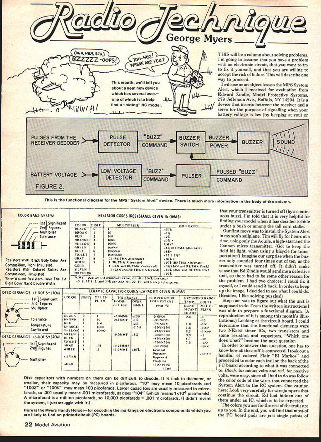 George Myers BZZZZZ-OQPSI Th s month II tell about neat new device has several uses help find hiding RC model THIS will column about solving problems Im going assume have problem electronic circuit want try fix yourself willing accept risk failure will describe way proceed will use object lesson MPS System Alert received evaluation Edward Zindle Model Protective Systems 279 Jefferson Ave Buffalo NY 14204 device inserts between receiver servo purpose signalling battery voltage low beeping COLOR BAJiO SYStEMRESISTOR CODES IRESISTANCE GIVEN IN OHMSI -____ 116 MultiplierBliowN101 TolerancetiEr2100 21 yELLOW 41040GMV ORANGi3100031 Glilli NS1000451 RirM I... ilL E6100004061 VIULEI710000000iZ 26 GIIAY6 01 II ITMA AIIrnaiei301 Resistort Blk Body Color AreHiTE i Aii~tsiOl liE TMA AItenA Coitpositior Non-Insulatedcorp JAN d I1ETMA Prefrrrcdi5 iJAN .d RETMA irei Resistors Colored Bodies Are51L 116 rd RETMA 1rf-rd104 JAN a,d liP TNiA 1r Corrpositon InsulatedNOCoL201 Wre-Wound Rouslors Have IsOM V. .d r 0 100% t Color sand Double Widtn 3 6 i21-2 .d34 r AlA 4 20 0 .d sIpl,a, DISC CERAM CS IS- DOT SYSTEMI Sgnifrcant gu e Temperature Coellicient DISC CERAMICS 13-DOT SYSTEMI - isIP~nificanl CERAMIC CAPACITOR COOLS iCAPACITY GIViN INMMFI 1701 066 piIMl 1 ri-mi RANCPtiMpi-iFATi HiExTi-7NUiD HANG iili-HlOSiMi-0V1CI4011 iiliK% 1TlIiiiCOP Ii r LESSIOMiI c51011P11 1 Ii IlCANTPLIFH FIG 11617 -- - 1 AC0 211MM 201OiNPOi41iliFOANI001MM1133lNl3310 laO211102170NO7Si10-171 JIlANGi boO251ISFNNiSlli15j1*S Yi- l10 410110I -223N221l22- 1110111 (lIEN0SMMP 5133NIllI331 illIi--470iN47047111 VIpiET77S0lN7S75 iv ORAYit11tJSMMT311i03uii1l11 AilIriit11OMMI 101G,rai 511 51716jIlypa. & 010ICO.P11n1 i0011l00 1Ii. Disk capacitors numbers can difficult decode I. inch diameter smaller capacity may measured picofarads 10 may mean 10 picofarads 100Z lOOK may mean 100 picofarads Larger capacitors usually measured micro farads 001 usually means 001 microfarads does 104 means 1x104 picofarads microfarad million picofarads 50 10000 picofarads 001 microfarads didnt invent system just struggle Myers Handy Helperfor decoding markings electronic components likely find printed-circuit PC boards transmitter turned off contin uous buzz Im told very helpful finding model has decided hide under bush among tall corn stalks first move install System Alert sons sailplane Tim will fly hours time using Aquila high- start Cannon micro transmitter Got keep field kit light using bicycle trans portation Imagine surprise buz zer sounded four times out ten transmitter turned off didnt make sense Ed Zindle would send defective unit some other reason problem two choices could fix myself could send back order keep up image decided see what could Besides like solving puzzles Step figure out what unit supposed written instructions able prepare functional diagram reproduction among months illus trations Looking the-circuit board could determine functional elements two NE555 timer ICs two transistors some resistors capacitors Which does what became next question order answer question has know stuff connected took out - handful colored Flair El Markos proceeded color trail back PC board according what connected Black minus volts red positive volts easy since follow color code wires connected System Alert RC system caution Look very carefully wire jumpers continue circuit Ed hidden under IC expected colors use rest trails up end will find PC board pads just single points 22 Model Aviation IZZC BL [MAND Zig functional diagram MPS System Alert device much information body column interconnection final wiring diagram anyway can use same color once long keep pads separated mind Next youll want wiring diagram simple matter drawing ICs transistors big piece paper interconnecting symbols resistors capac itors values resistors capacitors indicated numbers colored stripes paint may run bit trouble since various manufacturers will mark same item differently rye included figure showing common markings should adequate have two choices can either drop project point can guess answer mark diagram question-mark next second later analysis supports guess save some time analysis doesnt give answer question mark warns really dont know what Im talking about can go some additional research have built several Ace RC Heath kits youll notice instruction manuals can very helpful decoding parts markings since always include general section subject book rack local Radio Shack store also contains handy references such Modern Dictionary Electronics Rudold E Graf Sams publication order find out whats inside ICs Integrated Circuits will need something like Semiconductor Reference Handbook Semiconductor Replacement Guide both available Radio Shack will find pin identifications descriptions functions performed behind pins few typical circuit applications completely de scribed clues may need understand whats happening additional books will bring absolute beginner level up advanced amateur Without going through whole learning process lets just say found everything System Alert logical working should meant Cannon receiver doing something unexpected Looking receiver servo plug expect see decoder passing out positive-going pulses often spend ing its time Off zero volts state Ive included sketch situation elsewhere What decoder stayed high positive volts sometimes transmitter turned off System Alerts pulse detec tor capacitor charged battery voltage discharged transistor acted upon positive-going pulses servo-control pulses stop capacitor goes high turning buzzer decoder receiver could stop high transistor would locked capacitor would locked low preventing buzzer sounding Continued page 109 November 198023 Heres what RC control pulses look like oscilloscope upper train typical 4-channel system Servo #2 sees bottom pattern interconnection diagram part MPS System Alert device obtained firsttracing circuit paths PC board colored markerpens have indicatedthe Myers Mod adapts device shift-register decoders info a
