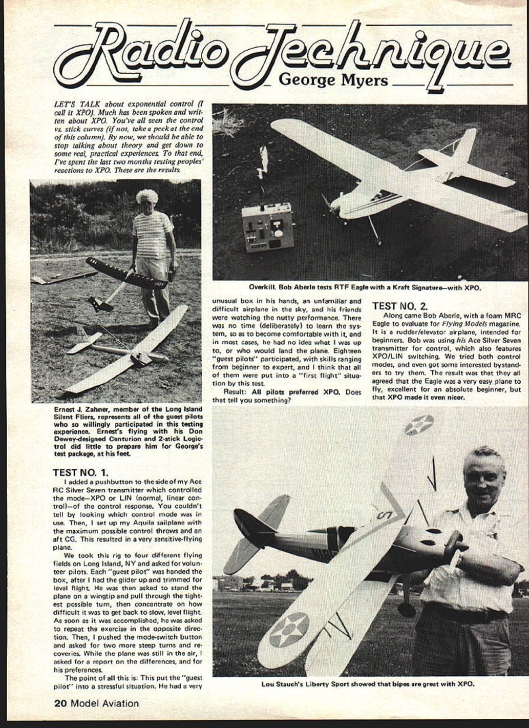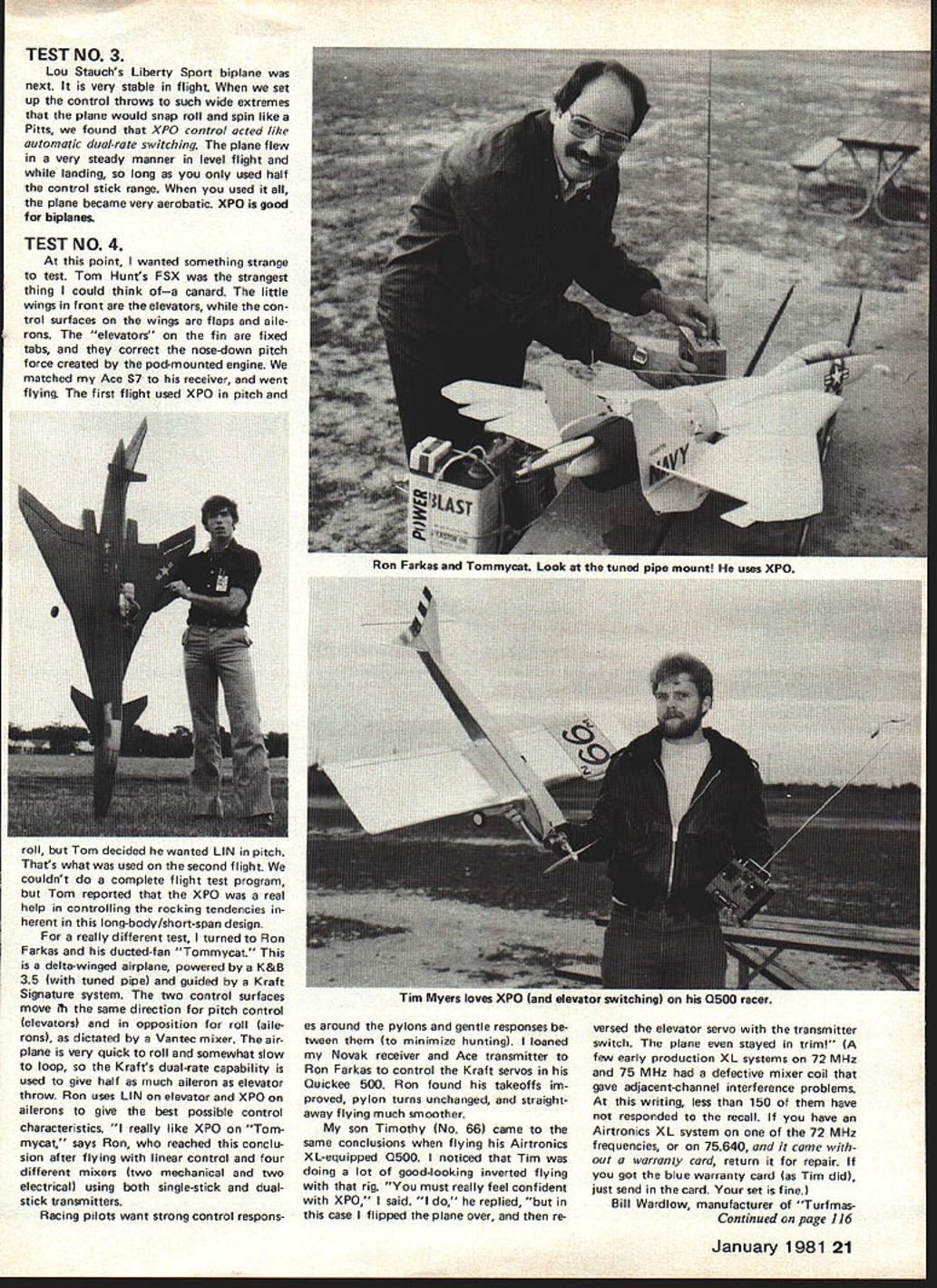 George Myers LETS TALK about exponential control call XPO Much has spoken writ ten about XPO Youve seen control vs stick curves take peek end column now should able stop talking about theory get down some real practical experiences end Ive spent last two months testing peoples reactions XPO results TEST NO 1 added pushbutton thesideof Ace RC Silver Seven transmitter controlled modeXPO LIN normal linear con trolof control response couldnt tell looking control mode use set up Aquila sailplane maximum possible control throws aft CG resulted very sensitive-flying plane took rig four different flying fields Long Island NY asked volun teer pilots guest pilot handed box after glider up trimmed level flight asked stand plane wingtip pull through tight est possible turn concentrate difficult get back slow level flight As soon accomplished asked repeat exercise opposite direc tion pushed mode-switch button asked two steep turns re coveries plane still air asked report differences preferences point put guest pilot stressful situation very unusual box hands unfamiliar difficult airplane sky friends watching nutty performance no time deliberately learn sys tem become comfortable cases no idea what up would land plane Eighteen guest pilots participated skills ranging beginner expert think put first flight situa tion test Result All pilots preferred XPO Does tell something TEST NO 2 Along came Bob Aberle foam MRC Eagle evaluate Flying Models magazine rudder/elevator airplane intended beginners Bob using Ace Silver Seven transmitter control also features XPO/LIN switching tried both control modes got some interested bystand ers try result agreed Eagle very easy plane fly excellent absolute beginner XPO made nicer 20 Model Aviation Overkill Bob Aberle tests RTF Eagle Kraft Signaturewith XPO Ernest J Zahner member Long Island Silent Fliers represents guest pilots willingly participated testing experience Ernests flying Don Dewey-designed Centurion 2-stick Logic trol did little prepare him Georges test package feet Lou Stauchs Liberty Sport showed bipes great XP0 TEST NO3 Lou Stauchs Liberty Sport biplane next very stable flight set up control throws such wide extremes plane would snap roll spin like Pitts found XPO control acted like automatic dual-rate switching plane flew very steady manner level flight landing long used half control stick range used plane became very aerobatic XPO good biplanes TEST NO 4 point wanted something strange test Tom Hunts FSX strangest thing could think ofa canard little wings front elevators con trol surfaces wings flaps aile rons elevators fin fixed tabs correct nose-down pitch force created pod-mounted engine matched Ace S7 receiver went flying first flight used XPO pitch roll Tom decided wanted LIN pitch Thats what used second flight couldnt complete flight test program Tom reported XPO real help controlling rocking tendencies herent long-bodylshort-span design really different test turned Ron Farkas ducted-fan Tommycat delta-winged airplane powered K&B 35 tuned pipe guided Kraft Signature system two control surfaces move 17i same direction pitch control elevators opposition roll aile rons dictated Vantec mixer air plane very quick roll somewhat slow loop Krafts dual-rate capability used give half much aileron elevator throw Ron uses LIN elevator XPO ailerons give best possible control characteristics really like XPO Tom mycat says Ron reached conclu sion after flying linear control four different mixers two mechanical two electrical using both single-stick dualstick transmitters Racing pilots want strong control respons 1mm Myers loves AIU land elevator switching es around pylons gentle responses tween minimize hunting loaned Novak receiver Ace transmitter Ron Farkas control Kraft servos Quickee 500 Ron found takeoffs im proved pylon turns unchanged straight away flying much smoother son Timothy No 66 came same conclusions flying Airtronics XL-equipped Q500 noticed Tim doing lot good-looking inverted flying rig must really feel confident XPO said replied case flipped plane over re versed elevator servo transmitter switch plane stayed triml few early production XL systems 72 MHz 75 MHz defective mixer coil gave adjacent-channel interference problems writing less 150 have responded recall have Airtronics XL system 72 MHz frequencies 75640 came out warranty card return repair got blue warranty card Tim did just send card set fine Bill Wardlow manufacturer Turfmas Continued page 116 60-Size Revenge can sweet new Revenger pattern design can win 65-inch span laminar-flow wing 700 square-inch area helps perform AMA-FAI man euvers new kind smooth ness can read about May 1978 RC Modeler Revenger comes highly prefabricated balsa fuselage assembled sanded Foam wing panels stabilizer presheeted sanded vertical fin Symposium held 1981 Nats Papers will published 1981 Symposium volume whether author able present paper personally Nats Papers should cover some aspect science art Free Flight models including technical studies prac tical design engineering applied models new unusual model aircraft developments historical items Both Indoor Outdoor Free Flight modelingdevelopments included Please send proposed papers Jim Bennett 324 Helfenstein Ave St Louis MO 63119 Send title proposed paper together abstract 200 words or complete paper available Abstracts should submitted soon possible hopefully within month after publication notice editorthis yearwould like have complete list material published December 31 1980 Cargo record August 1980 issue told Roman Ramirez broke Cargo record two-flight total 8342 oz Well did again merely once three times large margin course series 12 flights score 90 oz after three flights 92 ounces after eight flights finally 9416 oz after 11 flights Does entitle him three Certificates National Record World Champs T-shirts few still available drastically reduced price $500 ea postpaid official ones issued NFFS team members managers Order Steve Geraghty 194 Vista Del 