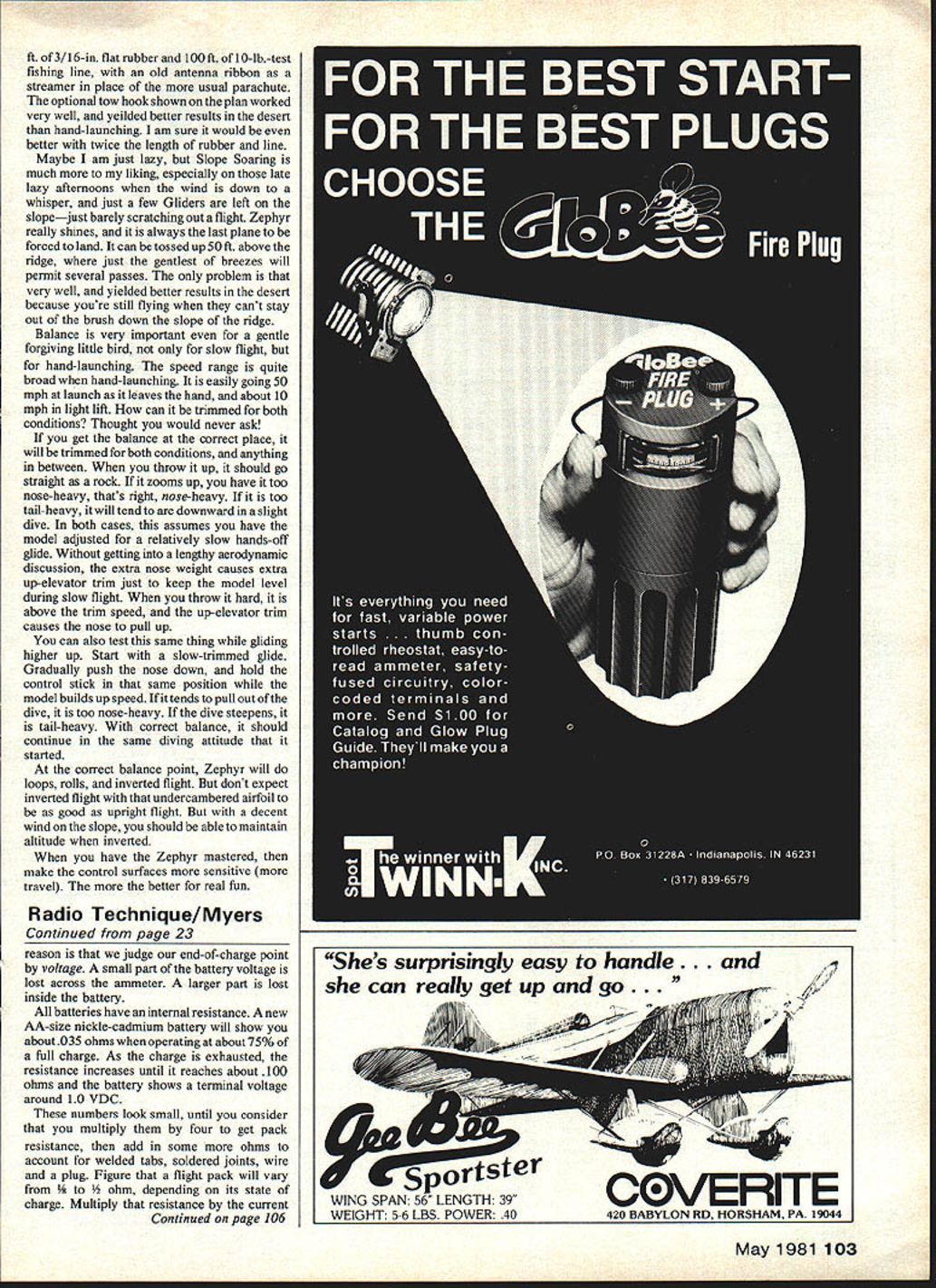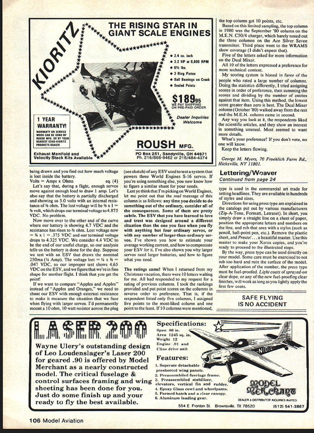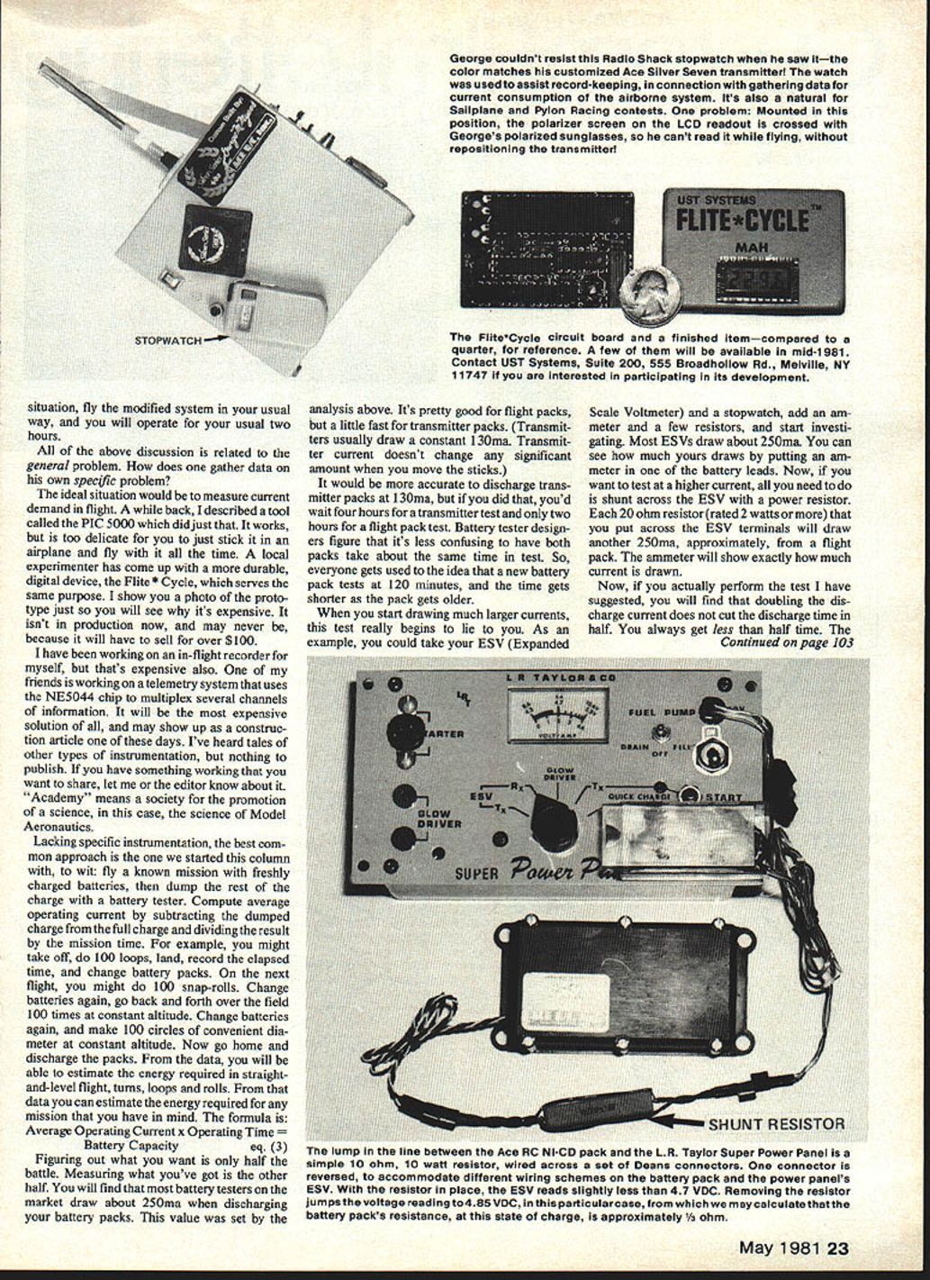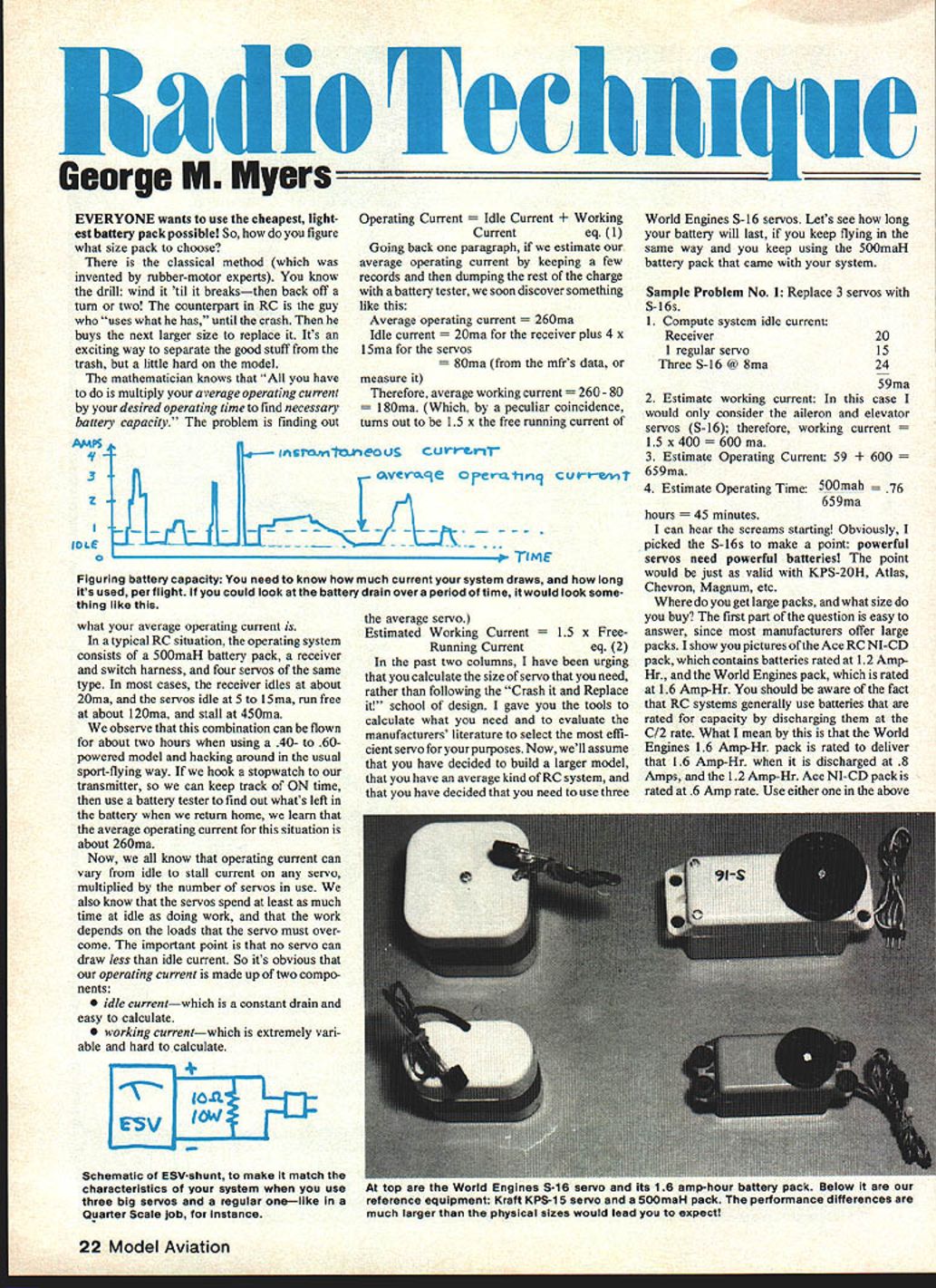 echniquc EVERYONE wants use cheapest lightat battery pack possible So figure what size pack choose classical method invented rubber-motor experts know drill wind til breaksthen back off turn two counterpart RC guy uses what has until crash buys next larger size replace Its exciting way separate good stuff trash little hard model mathematician knows have multiply average operating current desired operating time find necessaty battery capacity problem finding out AMPS 3 IOLE 0 what average operating current typical RC situation operating system consists 500maH battery pack receiver switch harness four servos same type cases receiver idles about 2Oma servos idle 5 15 ma run free about 120ma stall 450ma observe combination can flown about two hours using 40- 60powered model hacking around usual sport-flying way hook stopwatch transmitter can keep track ON time use battery tester find out whats left battery return home learn average operating current situation about 260ma Now know operating current can vary idle stall current servo multiplied number servos use also know servos spend least much time idle doing work work depends loads servo must over come important point no servo can draw less idle current So its obvious operating current made up two compo nents idle currentwhich constant drain easy calculate working currentwhich extremely vari able hard calculate Schematic ESV-shunt make match characteristics system use three big servos regular onelike Quarter Scale job instance Operating Current Idle Current ing Currenteq 1 Going back paragraph estimate average operating current keeping few records dumping rest charge battery tester soon discover something like Average operating current a Idle current receiver plus 4 x iSma servos 8Oma mfrs data measure Therefore average working current 260- 80 l8Oma Which peculiar coincidence turns Out 15 x free running current average servo Estimated Working Current FreeRunning Currenteq 2 past two columns have urging calculate size servo need rather following Crash Replace school design gave tools calculate what need evaluate manufacturers literature select effi cient servo purposes Now well assume have decided build larger model have average kind RC system have decided need use three World Engines S-16 servos Lets see long battery will last keep flying same way keep using SOOmaH battery pack caine system Sample Problem No 1 Replace 3 servos S-I 6s 1 Compute system idle current Receiver 20 1 regular servo 15 Three 5-16 @ 8ma 24 59ma 2 Estimate working current case would consider aileron elevator servos S-16 therefore working current 400 ma 3 Estimate Operating Current 59 659ma 4 Estimate Operating Time SOOmah 59ma hours 45 minutes can hear screams starting Obviously picked S-16s make point powerful servos need powerful batteries point would just valid KPS-20H Atlas Chevron Magnum etc get large packs what size buy first part question easy answer since manufacturers offer large packs show pictures Ace RC NI-CD pack contains batteries rated 12 AmpHr World Engines pack rated 16 Amp-Hr should aware fact RC systems generally use batteries rated capacity discharging C/2 rate What mean World Engines 16 Amp-Hr pack rated deliver 16 Amp-Hr discharged 8 Amps 12 Amp-Hr Ace NI-CD pack rated 6 Amp rate Use either above 22 Model Aviation George M Myers lVisra-vi11keouS CUCrr f-oc1e OJe-1nq CUt4-1 J- TlE Figuring battery capacity need know much current system draws long its used per flight could look battery drain over period time would look some thing like World Engines S-16 servo its 16 amp-hour battery pack Below erence equipment Kraft KPS-15 servo 500maH pack performance differences much larger physical sizes would lead expect George couldnt resist Radio Shack stopwatch saw itthe color matches customized Ace Silver Seven transmitter watch used assist record-keeping connection gathering data current consumption airborne system Its also natural Sailplane Pylon Racing contests problem Mounted position polarizer screen LCD readout crossed Georges polarized sunglasses cant read flying repositioning transmitter situation fly modified system usual way will operate usual two hours above discussion related general problem does gather data own spec fic problem ideal situation would measure current demand flight back described tool called PLC 5000 did just works too delicate just stick airplane fly time local experimenter has come up durable digital device Flite * Cycle serves same purpose show photo proto type just will see its expensive isnt production now may never because will have sell over $100 have working in-flight recorder myself thats expensive also friends working telemetry system uses NE5044 chip multiplex several channels information will expensive solution may show up construc tion article days Ive heard tales other types instrumentation nothing publish have something working want share let editor know about Academy means society promotion science case science Model Aeronautics Lacking specific instrumentation best com mon approach started column wit fly known mission freshly charged batteries dump rest charge battery tester Compute average operating current subtracting dumped charge full charge dividing result mission time example might take off 100 loops land record elapsed time change battery packs next flight might 100 snap-rolls Change batteries agaln go back forth over field 100 times constant altitude Change batteries again make 100 circles convenient dia meter constant altitude Now go home discharge packs data will able estimate energy required straightand-level flight turns loops rolls data can estimate energy required mission have mind formula Average Operating Current x Operating Time ery Capacityeq 3 Figuring out what want half battle Measuring what youve got other half will find battery testers market draw about 250ma discharging battery packs value set analysis above Its pretty good flight packs little fast transmitter packs Transmit ters usually draw