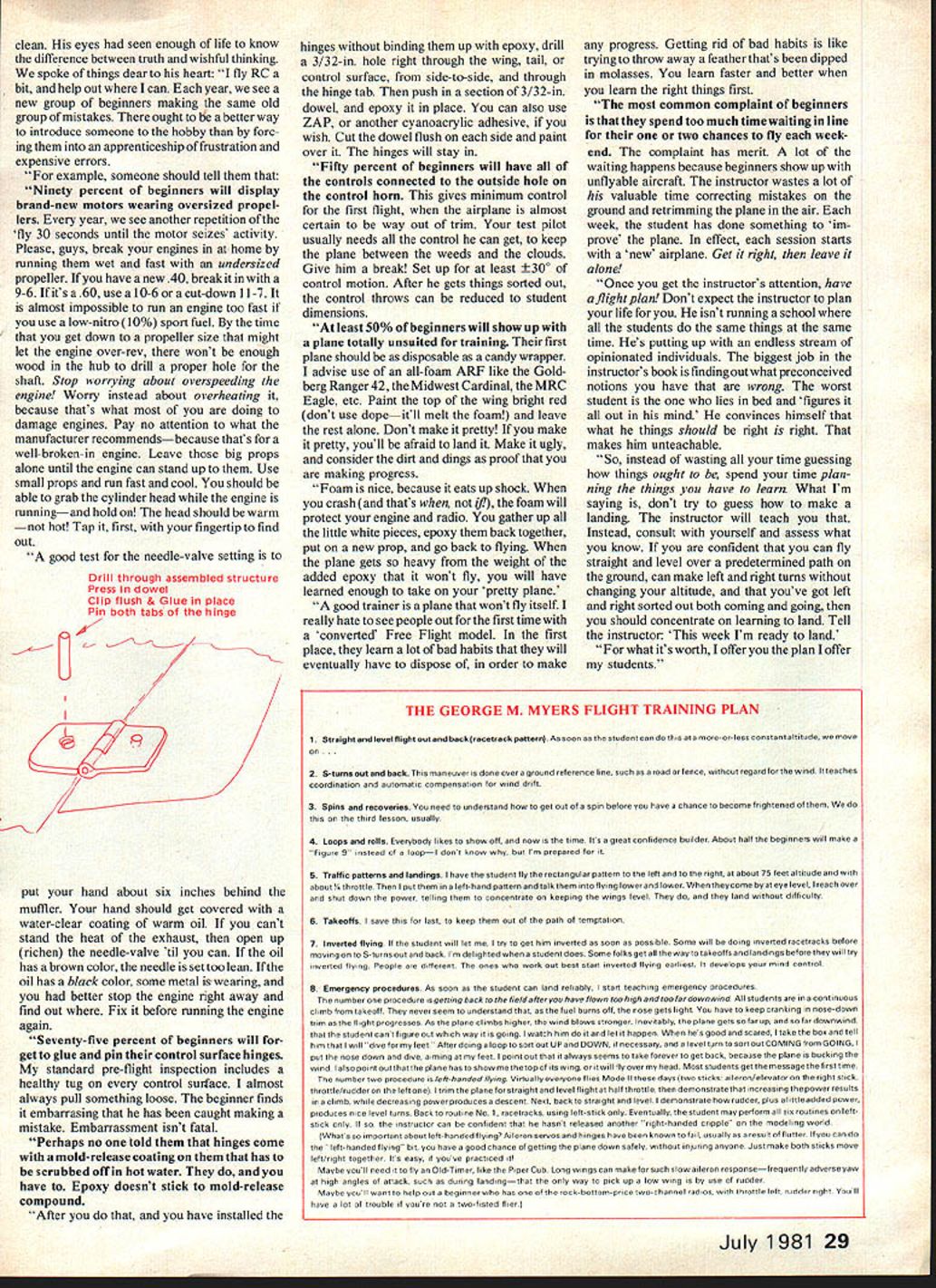 or echnique PROPOSED RCFREQUENCY CHANNEL NORANGEREMARKS 1 though 626995No change Primarily RC cars boats 27255Useful aircraft Canada 4 Watts maximum 71149 MHzPrimarily toys Thermic Sniffler 100 mIN max 122450000f Amateur Radio band Requires special license New 54000 channels being negotiated Ham groups 1000W max Colored Streamers 72080 Use will continued 10 years 75640 goes 75640mixed usage % W max 255072010AIRCRAFT LOW BAND Odd-numbered frequen 72510cies steps 02 MHz Requires new re ceivers other 455 KHz IF % W max 51-7472530AIRCRAFT HIGH BAND Odd-numbered frequen 72990cies steps 02 MHz 455 KHz IF okay Existing receivers may usable new crystals 3A W max 759775410NON-AIRCRAFT BAND Note band 3 75850MHz away Aircraft bands crystalswapping should produce interferences % W max DEFINITIONS PRS onal Radio Service know 7276 MHz MHz MegaHertz Another way say Millions cycles/second IF Intermediate Frequency An internal part receiving process VOR VHF Omni-Range Think radio-compass communications added IT MAY BE few people confused over what AMA frequency allocation proposal encompasses Perhaps explanation will help provide clearer understanding 1 Our present channels 72 76 MHz Personal Radio Service PRS band part scheme has channel assignments 20 KHz apart beginning 72020 continuing 7204072060 72080 72100 etc 72080 being first authorized frequency band radio control models assignments shared high-powered users brown/white rI0o0 0000 NNNN aNNNNN g 0 - Frequency e s 0 uo uJs NOTE These ficticious user names idealized wave-forms Heres RC frequencies 72 MHz bandl look today 2 AMA has proposed splitting existing channels produce new channels 10 KHz intervals beginning 720 10 continuing 72030 72050 72070 through 72990 MHz asking new channels shared high-powered users New Channel Numbers N N~0 5 . 000 0 C co cj00 - Frequency xisting Channel NOTE expect lose two channels existing channel remaining use frequency picture would look likethis AMAs proposal FCC approved shorties RC channelsothers high-power users 3 Whether new channels restricted low-powered users resolved however high-powered users will continue operate even-numbered frequencies permitted under Part 90 FCC rules Therefore can expect higherpower signals have potential interfere odd-numbered channels Meantime ask ing use far channels can use place time virtually certain able find enough channels somewhere within 50 frequencies available purposes throughout United States Based concept predict trans mitters will sprout new frequency-changing knob similar 40-channel knob GB transceivers Frequency management flying sites will become concern requiring better control monitoring sales frequency scanners will likely pick up bit Receivers will probably continue crystalcontrolled interests lightness sim plicity sales crystals will also increase present equipment still has value As time passes will become less valuable because high-powered users public safety land trans portation common carrier industrial will take over even-numbered channels area happens equipment will useless slight possibility will able put new odd-channel crystals receivers get bit use please understand new narrow-band 10 KHz receiver proper solution definite will have buy new narrow-band transmitter because few current generation RC transmitters can comply narrow bandwidth tight frequency tolerance necessary keep RC signal contained within new narrower channels Sure sounds unfair Now let tell about private airplane owner Fifteen years ago FCC split aerial navigation channels order continue use 109 135 MHz VOR VHF Omni-Range radio-navigation system system owner spend about $5000 pair new 360-channel transceivers Some tried get old 90- 180channel equipment didnt work system demanded got new equipment Its result population explosion people try crowd fixed space available way can stand closer together Channel-splitting way stand closer 1985 VOR channels will split again 720 channels might ask doesnt FCC give us exclusive use channels somewhere else band answer quite simple open space left such high frequencies can tafford equipment Members AMA Frequency Committee doing experi mental work band right now could quit flying til get worked out dont think will Besides expect situation will improve As new split channels go effect whether confined lowpowered users seems reasonable predict FCC will require users go narrow-band transmissions existing high-powered users will forced pull skirts will make room us exactly what happened VOR band uses up space allocation Keep reading column writing letters hearty thanks George M Myers 70 Froehlich Farm Rd Hickssille NY 11801 NEW SUBJECT MET him clearing mowed worn flat nothing about him spoke rank profession clothing worn comfortable-looking exactly 28 Model Aviation George M Myers (a 01 5O clean eyes seen enough life know difference between truth wishful thinking spoke things dear heart fly RC bit help out can year see new group beginners making same old group mistakes ought better way introduce someone hobby forc ing apprenticeship frustration expensive errors example someone should tell Ninety percent beginners will display brand-new motors wearing oversized propel lers year see another repetition fly 30 seconds until motor seizes activity Please guys break engines home running wet fast undersized propeller have new 40 break 9-6 its 60 use 10-6 cut-down 11-7 almost impossible run engine too fast use low-nitro 10% sport fuel time get down propeller size might let engine over-rev wont enough wood hub drill proper hole shaft Stop worrying about overspeeding engine Worry instead about overheating because thats what doing damage engines Pay no attention what manufacturer recommendsbecause thats well-broken-in engine Leave big props alone until engine can stand up Use small props run fast cool should able grab cylinder head engine runningand hold head should warm hot Tap first fingertip find out good test needle-valve setting Drill through assembled struct