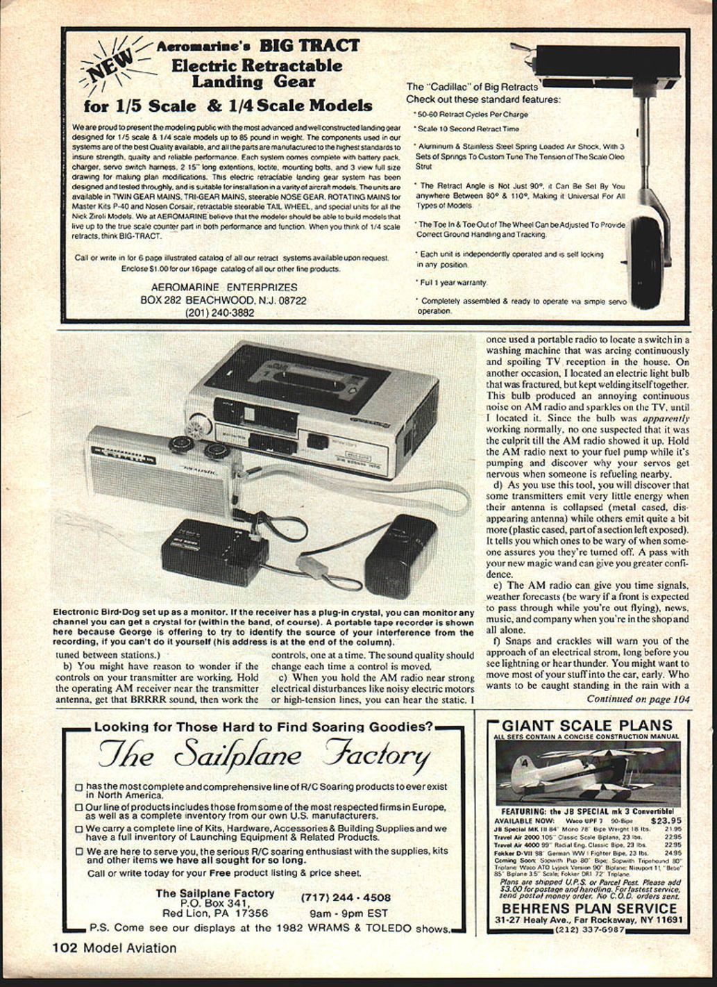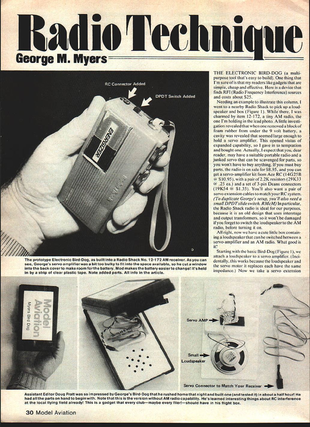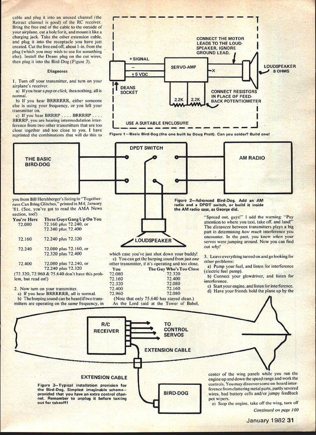 echuiquc THE ELECTRONIC BIRD-DOG multi purpose tool thats easy build thing Im sure readers like gadgets simple cheap effective device finds RFI Radio Frequency Interference sources costs about $25 Needing example illustrate column Went nearby Radio Shack pick up loud speaker boxFigure 1 charmed item 12-172 tiny AM radio Im holding lead photo little investi gation revealed removed block foam rubber under 9 volt battery cavity revealed seemed large enough hold servo amplifier opened vistas expanded capability gave temptation bought Actually expect dear reader may have suitable portable radio junked servo can scavenged parts wont have buy anything must buy parts radio sale $895 can get servo-amplifier kit Ace RC 1 4G25B $1095 pair 22K resistors 29K33 @ 25 ea set 3-pin Deans connectors 19K54 @ $135 Youll also want pair servo extension cables match RC system duplicate Georges setup youll also need small DPDTslide switch RMcM particular Radio Shack radio ideal purposes because old design uses interstage output transformers wont damaged forget switch loudspeaker AM radio before turning right now have cute little box contain ing loudspeaker can switched between servo-amplifier AM radio What good Starting basic Bird-Dog Figure 1 attach loudspeaker servo amplifier Inci dentally works because loudspeaker servo motor replaces have same impedance Now take servo extension Assistant Editor Doug Pratt impressed Georges Bird-Dog rushed homethat nightand built tested abouta half hour parts hand begin Note version AM radio capability Hes learned interesting things about RC interference local flying field already gadget clubmaybe fliershould have flight box 30 Model Aviation George M Myers prototype Electronic Bird-Dog built Fiuio ndii r40 IL I eceiver MS cen see Georges servo amplif ler bit too bulky fit space available cut window back cover make room forthe battery Mod makes battery easierto change Its held strio clear olastic tape Note added parts info article cable plug unused channel Retract channel good RC receiver Bring free end cable outside airplane cut hole mount like charging jack Take other extension cable plug receptacle have just created Cut free end off about 1-in plug may wish use something else Install Deans plug cut wires plug Bird-Dog Figure 3 Diagnoses 1 Turn off transmitter turn airplanes receiver a If hear apop click nothing normal b If hear BRRRRRR either someone else using frequency left transmitter cIfyouBRRRP.. .. BRRRP hearing intermodulation inter ference two other transmitters too close together too close have reprinted combinations will 1 I I SIGNAL DEANS SOCKET CONNECT THE MOTOR LEADS TO THE LOUDI SPEAKER IGNORE GROUND LEAD SERVOLOUDSPEAKER 8 OHMS pIzEJ1 CONNECT RESISTORS 1111 N PLACE OF FEED JJ BACK POTENTIOMETER I L USE SUITABLE ENCLOSUREJ Figure 1Basic Bird-Dog built Doug Pratt Can solder Build Bill Hershbergers listing Together ness Can Bring Glitches printed MA January 81 See youve got read AMA News section too Youre 72080 Guys Gang Up 72160 plus 72240 72240 plus 72400 7216072240 plus 72320 7224072080 plus 72160 72320 plus 72400 7240072080 plus 72240 72240 plus 72320 72320 72960 & 75640 dont have prob lem read 2 Now turn transmitter a If hear BRRRRRR normal b The burping sound can heard two trans mitters operating same frequency Figure 3Typical installation provision Bird-Dog Simplest imaginable scheme provided have extra control chan nel Remember unplug before taxiing out takeoff JEt LOUDSPEAKER case youve just shot down buddy c can get burping sound just other transmitter its operating too close YouThe Guy Whos Too Close 72080 72320 72160 72400 72320 72080 72400 72160 72960 72080 Note 75640 has stayed clean As Lord said Tower Babel EXTENSION CABLE EXTENSION CABLE Figure 2Advanced Bird-Dog Add AM radio DPDT switch build inside AM radio case George did Spread out guys add warning Pay attention taxi take off land distances between transmitters plays big part determining much interference encounter past knew servos jumping around Now can find out 3 Leave everything turned go looking other problems Pump fuel listen interference electric fuel pump b Connect glowdriver listen interference c Start engine listen interference d Have friends hold plane up center wing panels run engine up down speed range work controls may discover some on-board inter ference clattering metal parts partly severed wires bad battery cells and/or jumpy feedback pot wipers e Stop engine take off wing turn off Continued page 100 January 198231 THE BASIC BIRD-DOG DPDT SWITCH -u0 AM RADIO IEGAIN Losing control can night mare wrong response given command can take its toll model nerves wallet Radio South know feel about hobby too avid RC enthusiasts nearly half century combined experience modeling radio repair So avoid inflated repair costs undue service time Radio South fast economical inhouse radio service can depend Radio South customer satisfaction isnt just motto Its way life Let us put back control tO0 1925 E fly Futaba flEiU K. ro Line KRAFT Creighton RoadPensacola FL 32504904/478-6745 Safety Preston Continued page 12 lachymatory tear-producing can cause eye irritation tearing used poorly venti lated places modeler correspondents related experience lung congestion after visits doctor treatment allergies attributed problem use cyanoacrylate glues Satellite City brochure has say about mucous membranes Mucous surfaces can become irritated prolonged exposure cyanoacrylate vapors poorly ventilated areas Vapor irritation eyes mucous mem branes will noticeable under conditions low relative humidity visitor Australia staying us week during summer Some may know himFord Lloyd Australian team captain 1980 Scale World Champ ionships also Scale judge US Nats same year Ford mentioned having ex perienced sinus problems using cyano acrylate glues may have accentuated low humidity Australian climate So lookout such symptoms live Arizona use cyanoacrylates vapors cause problem maybe small fan near workbench would help