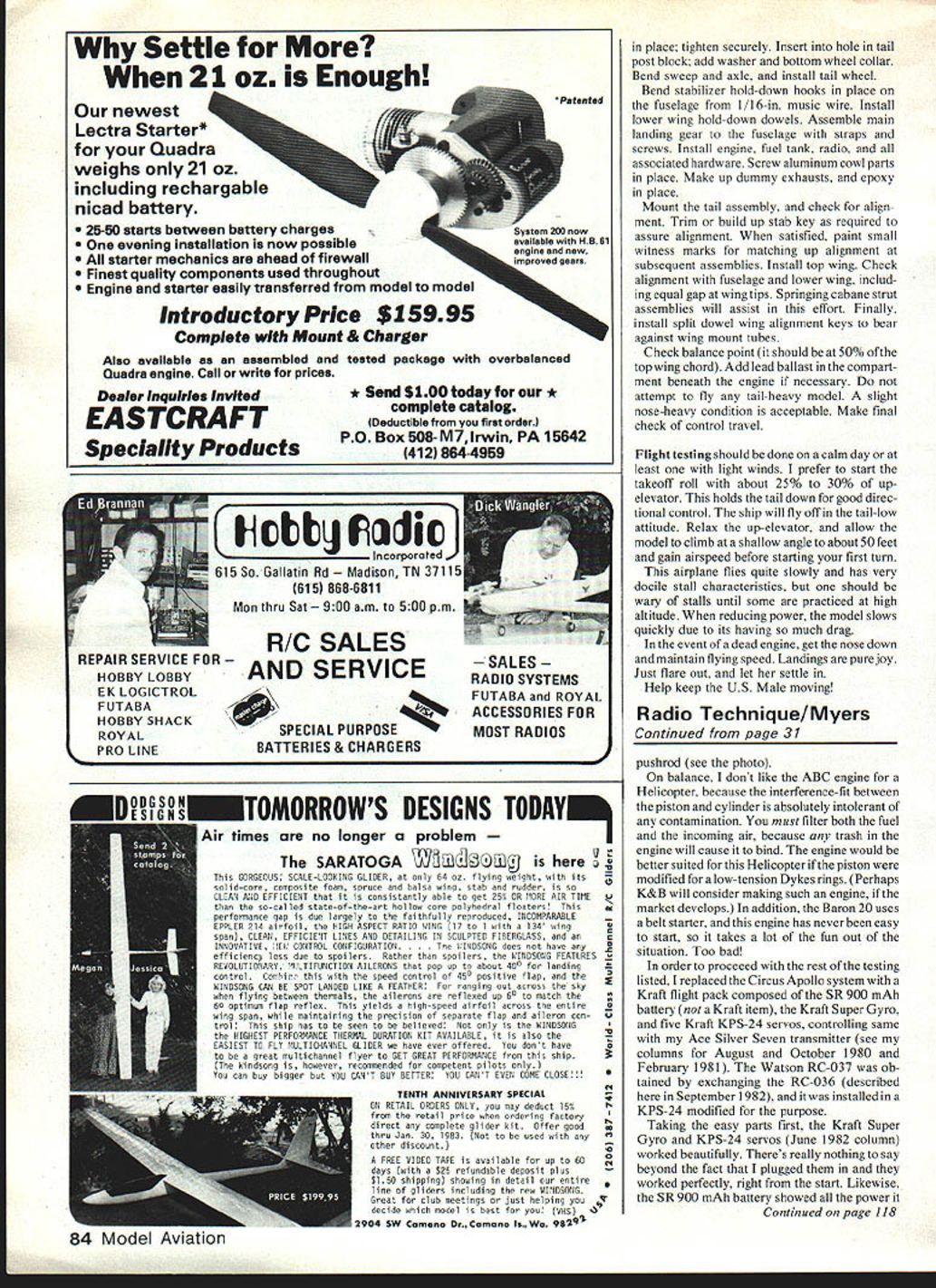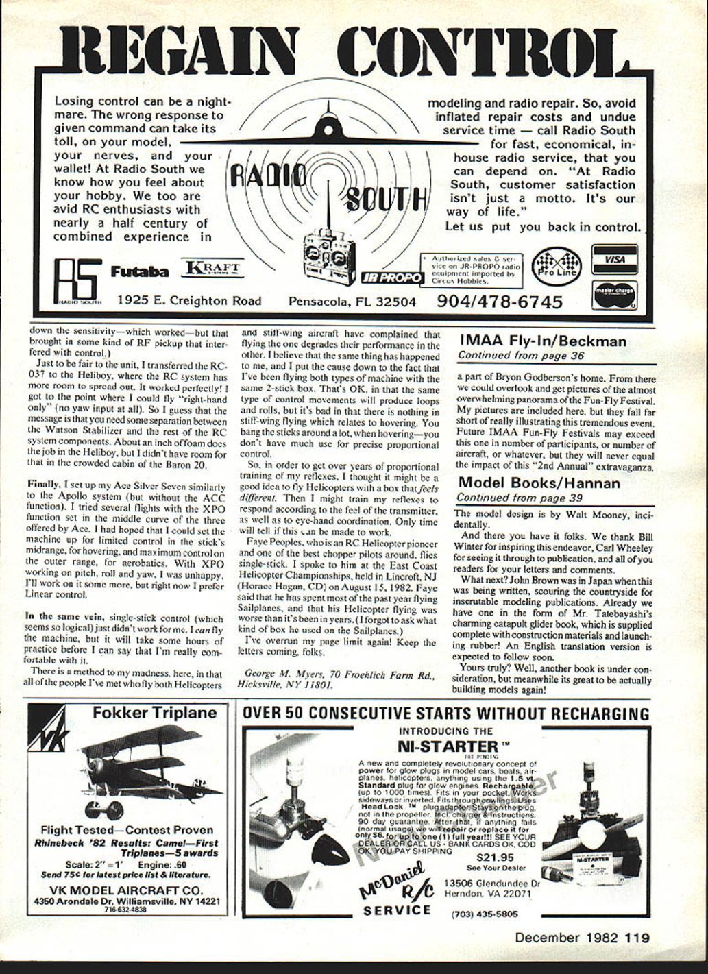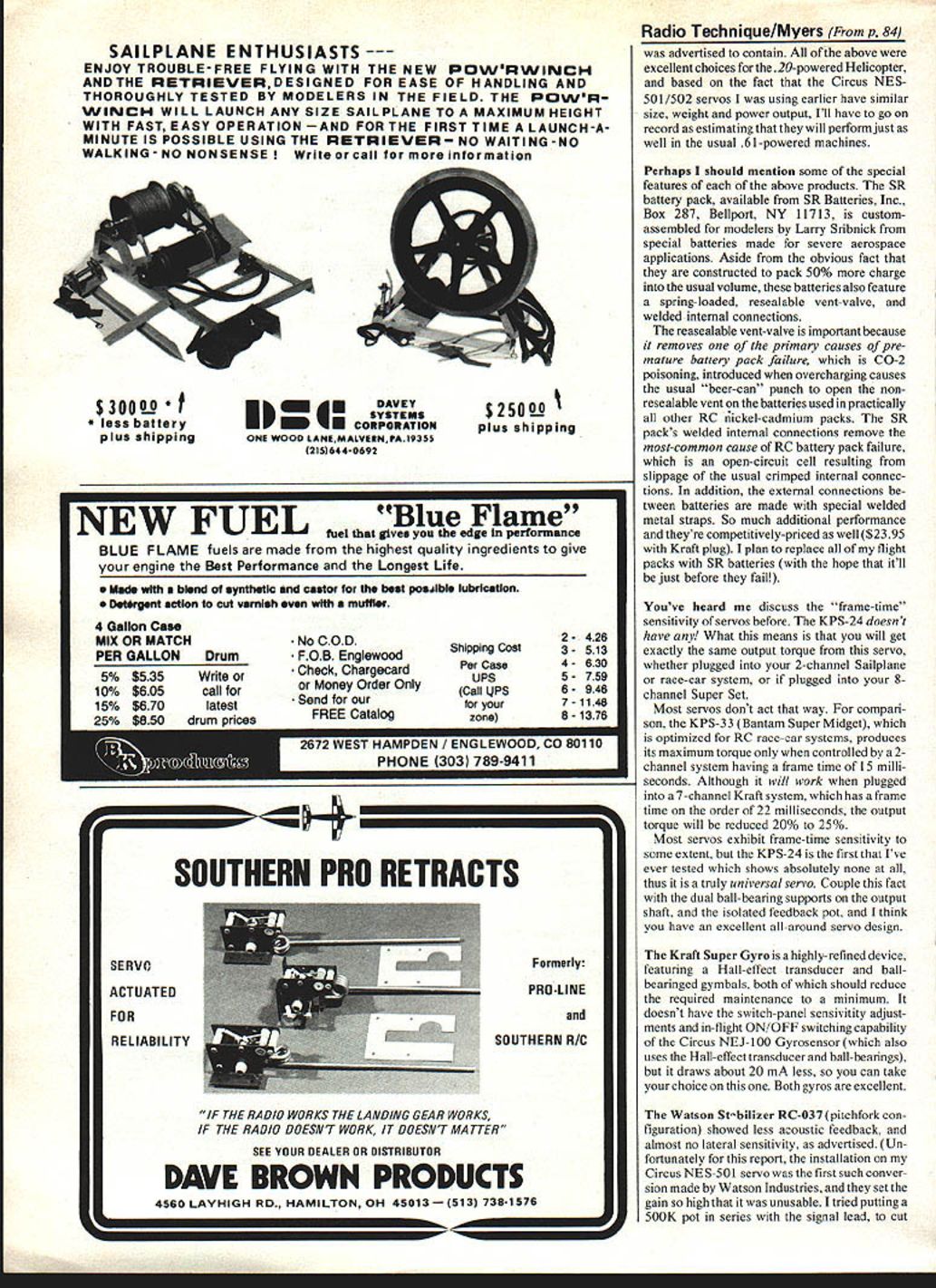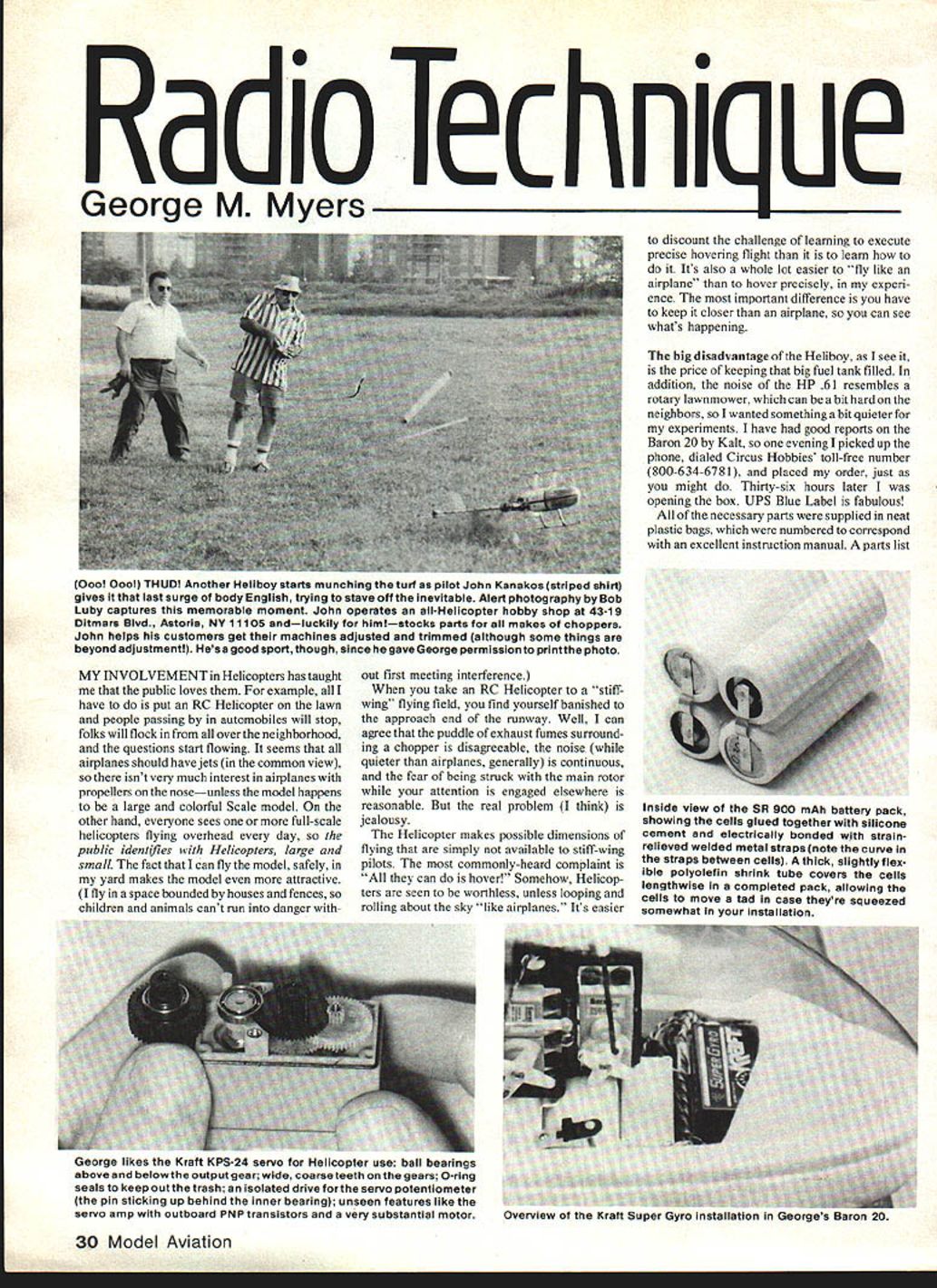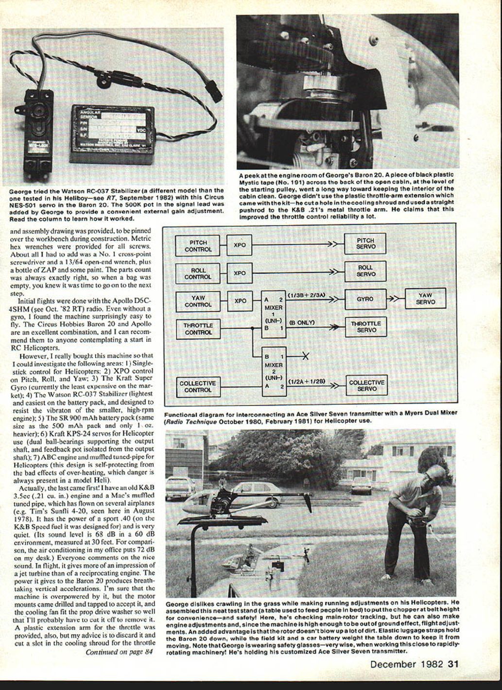 Radio Technique George M Myers MY INVOLVEMENT Helicopters has taught public loves example have put RC Helicopter lawn people passing automobiles will stop folks will flock over neighborhood questions start flowing seems airplanes should have jets common view isnt very much interest airplanes propellers noseunless model happens large colorful Scale model other hand everyone sees full-scale helicopters flying overhead day public identfies Helicopters large small fact can fly model safely yard makes model attractive fly space bounded houses fences children animals cant run danger first meeting interference take RC Helicopter stiff wing flying field find yourself banished approach end runway Well can agree puddle exhaust fumes surround ing chopper disagreeable noise quieter airplanes generally continuous fear being struck main rotor attention engaged elsewhere reasonable real problem think jealousy Helicopter makes possible dimensions flying simply available stiff-wing pilots commonly-heard complaint can hover Somehow Helicop ters seen worthless unless looping rolling about sky like airplanes Its easier discount challenge leaming execute precise hovering flight leam Its also whole lot easier fly like airplane hover precisely experi ence important difference have keep closer airplane can see whats happening big disadvantage Heliboy see price keeping big fuel tank filled addition noise HP 61 resembles rotary lawnmower can bit hard neighbors wanted something bit quieter experiments have good reports Baron 20 Kalt evening picked up phone dialed Circus Hobbies toll-free number 800-634-6781 placed order just might Thirty-six hours later opening box UPS Blue Label fabulous necessary parts supplied neat plastic bags numbered correspond excellent instruction manual parts list 30 Model Aviation 000 000 THUD Another Heliboy starts munching turf pilot John Kanakos striped shirt gives last surge body English trying stave off inevitable Alert photography Bob Luby captures memorable moment John operates all-Helicopter hobby shop 43-ig Ditmars Blvd Astoria NY 11105 andluckily him stocks parts makes choppers John helps customers get machines adjusted trimmed although some things beyond adjustment Hes good sport though since gave George permission prlntthe photo Inside view SR 900 mAh battery pack showing cells glued together silicone cement electrically bonded strainrelieved welded metal straps note curve straps between cells thick slightly flex ible polyolefin shrink tube covers cells lengthwise completed pack allowing cells move tad case theyre squeezed somewhat installation George likes sne rrart IF-4 servo ror Helicopter use baii bearings above belowthe output gear wide coarse teeth gears 0-ring seals keep out trash isolated drive servo potentiometer pin sticking up behind inner bearing unseen features like servo amp outboard PNP transistors very substantial motor Overview Kraft Super Gyro installation Georges Baron 20 assembly drawing provided pinned over workbench during construction Metric hex wrenches provided screws About add No 1 cross-point screwdriver 13/64 open-end wrench plus bottle ZAP some paint parts count always exactly right bag empty knew time go next step Initial flights done Apollo D6C4SHM see Oct 82 RT radio gyro found machine surprisingly easy fly Circus Hobbies Baron 20 Apollo excellent combination can recom mend anyone contemplating start RC Helicopters However really bought machine could investigate following areas 1 Singlestick control Helicopters 2 XPO control Pitch Roll Yaw 3 Kraft Super Gyro currently least expensive mar ket 4 Watson RC-037 Stabilizer lightest easiest battery pack designed resist vibraton smaller high-rpm engine 5 SR 900 mAb battery pack same size 500 mAh pack 1 oz heavier 6 Kraft KPS-24 servos Helicopter use dual ball-bearings supporting output shaft feedback pot isolated output shaft 7 ABC engine muffled tuned-pipe Helicopters design self-protecting bad effects over-heating danger always present model Heli Actually last came first have old K&B 35cc 21 cu engine Macs muffled tuned pipe has flown several airplanes eg Tims Sunfli 4-20 seen August 1978 has power sport 40 K&B Speed fuel designed very quiet Its sound level 68 dB 60 dB environment measured 30 feet compari son air conditioning office puts 72 dB desk Everyone comments nice sound flight gives impression jet turbine reciprocating engine power gives Baron 20 produces breath taking vertical accelerations Im sure machine overpowered motor mounts came drilled tapped accept cooling fan fit prop drive washer well Ill probably have cut off remove plastic extension arm throttle provided also advice discard cut slot cooling shroud throttle Continued page 84 J PITCHSERVO CONTROL CONTROL 113B213AYAW MIXER 2 COLLECTIVEUNI 112A 112B fiIVE CONTROLA2 December 1982 31 George trieo sne Watson RC-037 Stabilizer different model tested Heliboysee RT September 1982 Circus NES-SOl servo Baron 20 500K pot signal lead added George provide convenient external gain adjustment Read column learn worked peek engine room Georges Baron 20 piece black plastic Mystic tape No 191 across back open cabin level starting pulley went long way toward keeping interior cabin clean George didnt use plastic throttle-arm extension camewith kithe cuts hole thecooling shroud useda straight pushrod 186 21s metal throttle arm claims improved throttle control reliability lot Functional diagram interconnecting Ace Silver Seven transmitter Myers Dual Mixer Radio Technique October 1980 February 1981 Helicopter use George dislikes crawling grass making running adjustments Helicopters assembledthis neatteststand stable usedtofeed people bedtoputthechopperatbeltheight convenienceand safety hes checking main-rotor tracking can also make engineadjustmentsand since machine high enough outof ground effect flightadjust ments An added advantage isthatthe rotordoesnt blow up lot dirt Elastic luggage straps hold Baron 20 down field kit car battery weight table down 