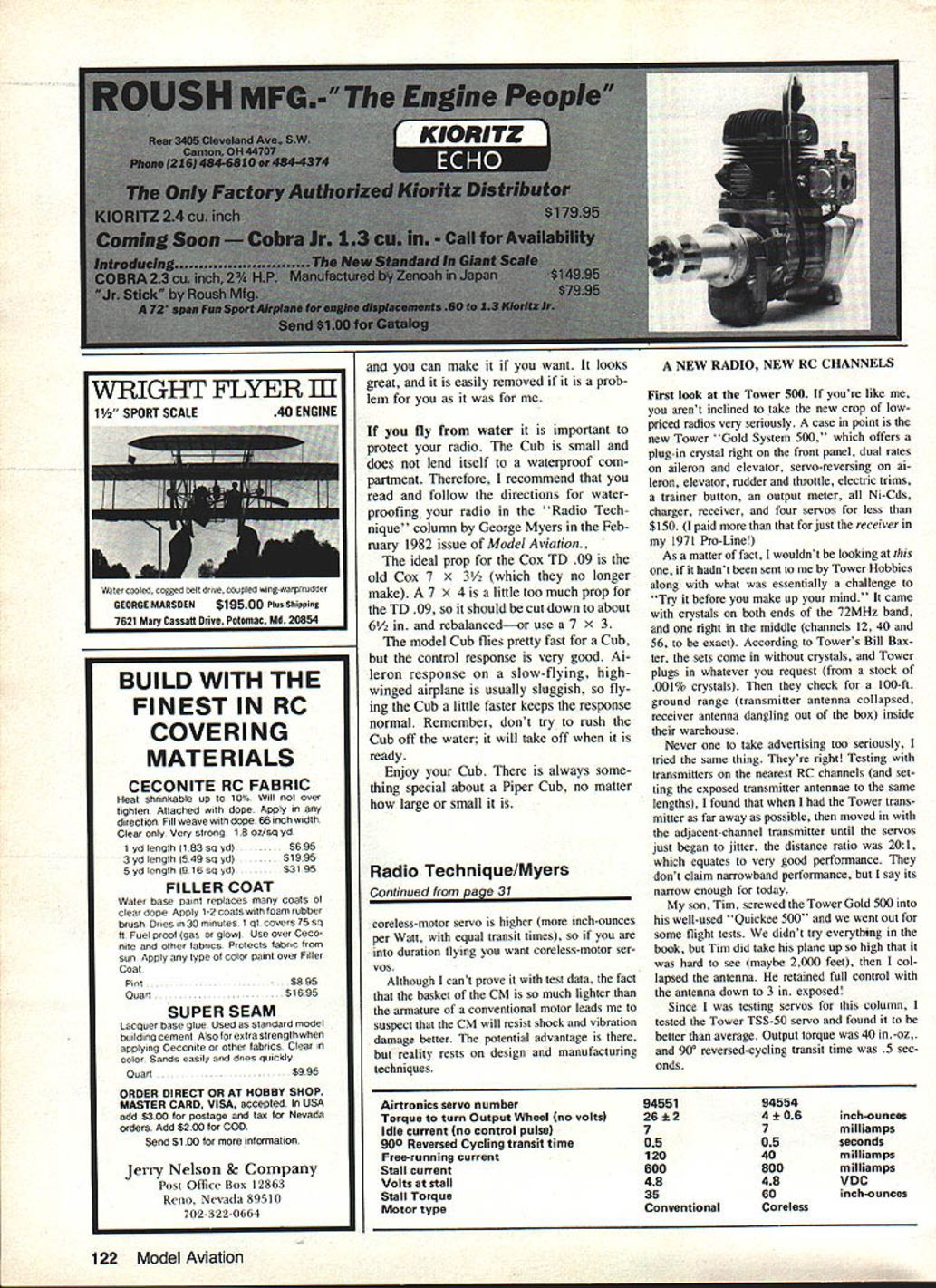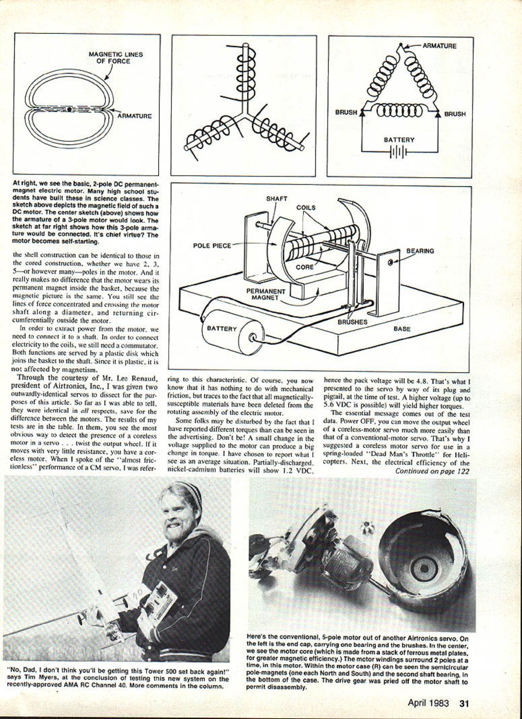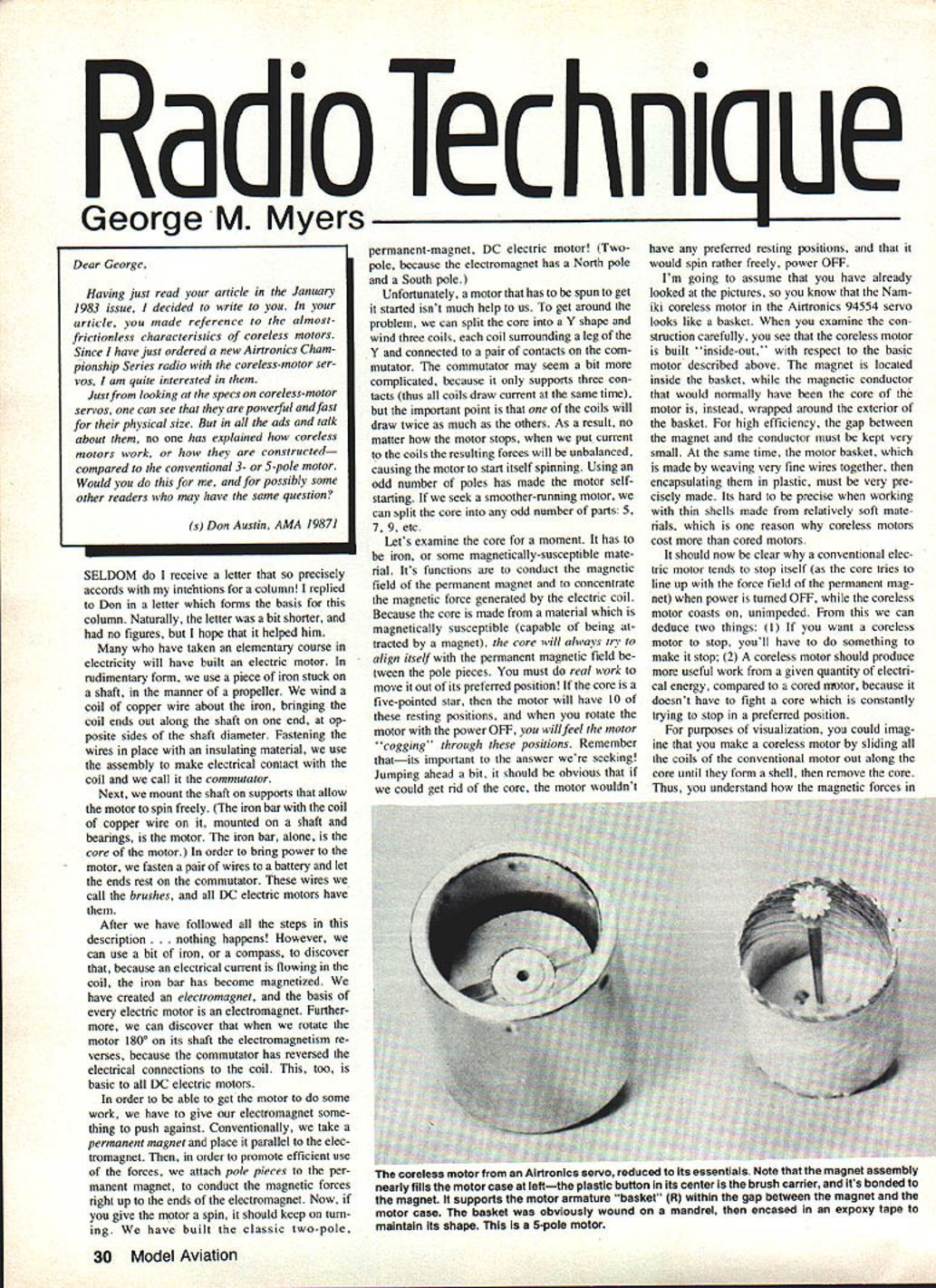 a loec ni ue George M Myers SELDOM receive letter precisely accords intentions column replied Don letter forms basis column Naturally letter bit shorter no figures hope helped him have taken elementary course electricity will have built electric motor rudimentary form use piece iron stuck shaft manner propeller wind coil copper wire about iron bringing coil ends Out along shaft end op posite sides shaft diameter Fastening wires place insulating material use assembly make electrical contact coil call commutator Next mount shaft supports allow motor spin freely iron bar coil copper wire mounted shaft bearings motor iron bar alone core motor order bring power motor fasten pair wires battery let ends rest commutator wires call brushes DC electric motors have After have followed steps description thing happens However can use bit iron compass discover because electrical current flowing coil iron bar has become magnetized have created electromagnet basis electric motor electromagnet Further can discover rotate motor 1800 its shaft electromagnetism re verses because commutator has reversed electrical connections coil too basic DC electric motors order able getthe motor some work have give electromagnet some thing push against Conventionally take permanent magnet place parallel elec tromagnet order promote efficient use forces attach pole pieces per manent magnet conduct magnetic forces right up ends electromagnet Now give motor spin should keep tum ing have built classic two-pole permanent-magnet DC electric motor Two pole because electromagnet has North pole South pole Unfortunately motor has spun get started isnt much help us get around problem can split core Y shape wind three coils coil surrounding leg Y connected pair contacts com mutator commutator may seem bit complicated because supports three con tacts thus coils draw current same time important point coils will draw twice much others As result no matter motor stops put current coils resulting forces will unbalanced causing motor start itself spinning Using odd number poles has made motor selfstarting seek smoother-running motor can split core odd number parts 5 7 9 etc Lets examine core moment has iron some magnetically-susceptible mate rial Its functions conduct magnetic field permanent magnet concentrate magnetic force generated electric coil Because core made material magnetically susceptible capable being tracted magnet core will always try align itself permanent magnetic field tween pole pieces must real work move out its preferred position core five-pointed star motor will have 10 resting positions rotate motor power OFF will feel motor cogging through positions Remember thatits important answer seeking Jumping ahead bit should obvious could get rid core motor wouldnt have preferred resting positions would spin rather freely power OFF Im going assume have already looked pictures know Nam iki coreless motor Airtronics 94554 servo looks like basket examine con struction carefully see coreless motor built inside-out respect basic motor described above magnet located inside basket magnetic conductor would normally have core motor instead wrapped around exterior basket high efficiency gap between magnet conductor must kept very small same time motor basket made weaving very fine wires together encapsulating plastic must very pre cisely made Its hard precise working thin shells made relatively soft mate rials reason coreless motors cost cored motors should now clear conventional elec tric motor tends stop itself core tries line up force field permanent mag net power tumed OFF coreless motor coasts unimpeded can deduce two things want coreless motor stop youll have something make stop 2 coreless motor should produce useful work given quantity electri cal energy compared cored rmtor because doesnt have fight core constantly trying stop preferred position purposes visualization could imag ine make coreless motor sliding coils conventional motor out along core until form shell remove core Thus understand magnetic forces 30 Model Aviation Dear George Having just read article January 1983 issue decided write article made reference almost frictionless characteristics coreless motors Since have just ordered new Airtronics Cham pionship Series radio coreless-motor ser vos am quite interested Just looking specs coreless-motor servos can see powerful fast physical size ads talk about no has explained coreless motors work constructed compared conventional 3- S-pole motor Would possibly some other readers may have same question s Don Austin AMA 19871 coreiess motor trom Ririronics servo reduced its essentials Note magnet assembly nearly tills motor case leftthe plastic button its center brush carrier its bonded magnet supports motor armature basket R within gap between magnet motor case basket obviously wound mandrel encased expoxy tape maintain its shape 5-pole motor right see basic 2-pole DC permanentmagnet electric motor high school stu dents have built science classes sketch above depicts magnetic field such DC motor center sketch above shows armature 3-pole motor would look sketch far right shows 3-pole arma ture would connected Its chief virtue motor becomes self-starting shell construction can identical cored construction whether have 2 3 5or however manypoles motor really makes no difference motor wears its permanent magnet inside basket because magnetic picture same still see lines force concentrated crossing motor shaft along diameter returning cir cumferentially outside motor order extract power motor need connect shaft order connect electricity coils still need commutator Both functions served plastic disk joins basket shaft Since plastic affected magnetism Through courtesy Mr Lee Renaud president Airtronics Inc given two outwardly-identical servos dissect pur poses article So far able tell identical respects save difference between motors results tests table see obvious way detect presence cureless motor servo ist output wheel moves v