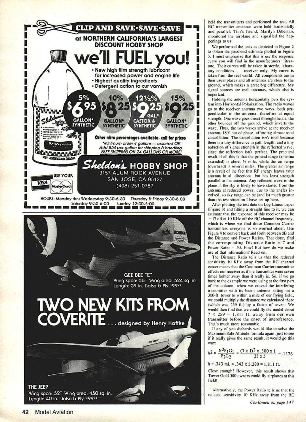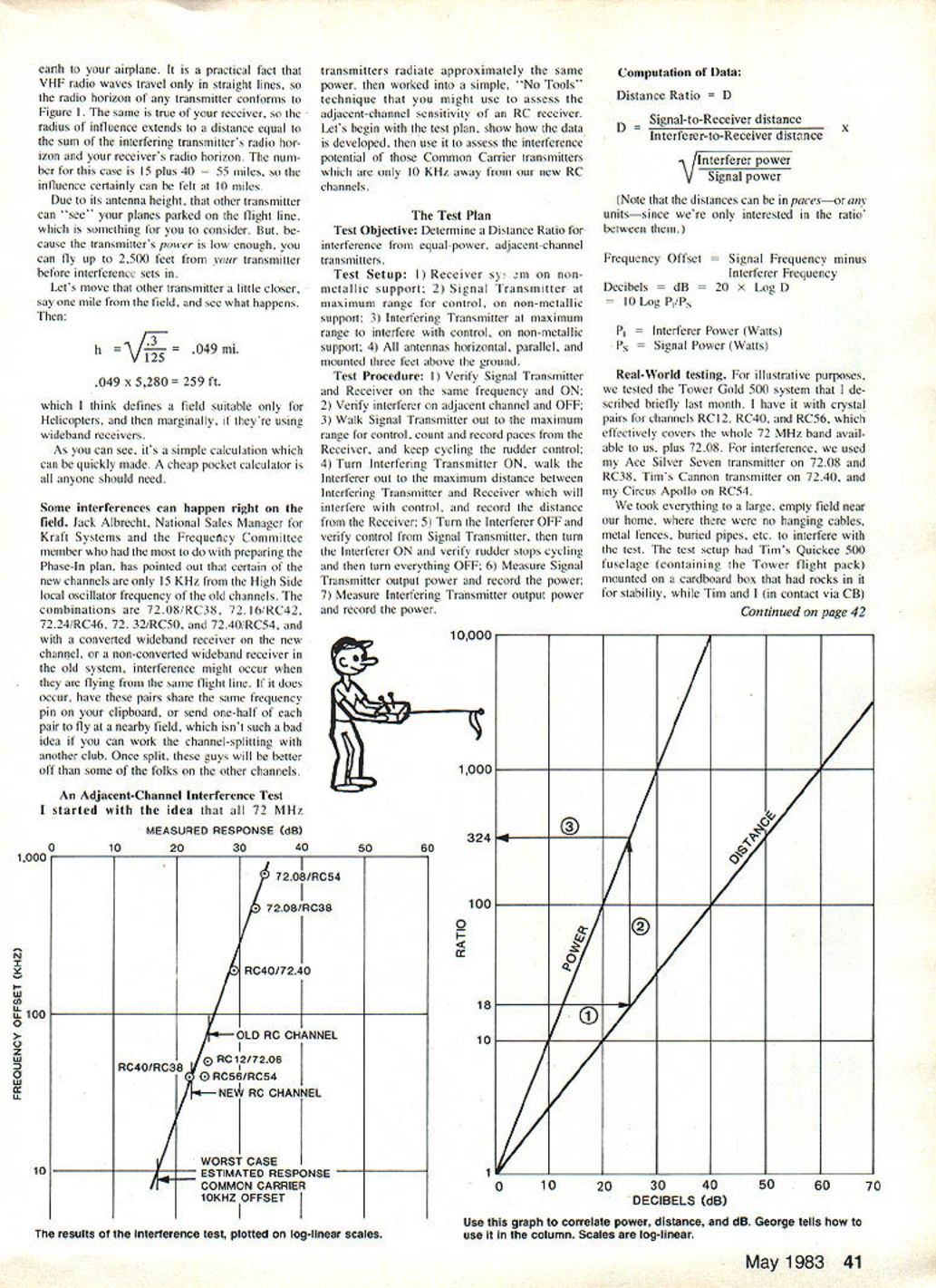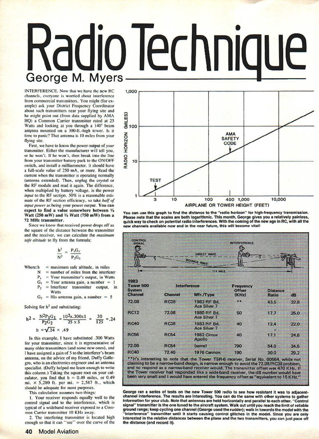 a loec ni ue George M Myers INTERFERENCE Now have new RC channels everyone worried about interference commercial transmitters might ex ample ask District Frequency Coordinator about such transmitters near flying site might point out data supplied AMA HQ Common Carrier transmitter rated 25 Watts looking through 1400 beam antnna mounted 300-ft-high tower time panic antenna 10 miles flying site First have know power output transmitter Either manufacturer will tell wont wont break line transmitter battery pack ON/OFF switch install milliammeter should have full-scale value 250 mA Read current transmitter operating normally antenna extended unplug crystal RF module read again difference multiplied battery voltage power input RF section 50% reasonable esti mate RF section efficiency take half input power being power output can expect find value somewhere between 1/4 Watt 250 mW 750 mW 72 MHz transmitter Since know received power drops off square distance between transmitter receiver can calculate maximum safe altitude fly formula h2 — PG N2P2G2 Whereh N P1 P2 maximum safe altitude miles number miles interferer Your transmitters output Watts Your antenna gain number Interferer transmitter output Watts His antenna gain number lving h2 substituting h2N2P1G1102x300x1 _ 30 P2G225x5 h 49 example 1 have substituted 300 Watts transmitter since representative older transmitters some new ones have assigned gain 5 interferers beam antenna advice friend Duffy Galle gro electronics engineer antenna specialist Duffy helped learn enough write column Taking square root cal culator find h 049 miles 049 mi X 5280 ft per mi ft should adequate purposes calculation assumes two things receiver responds equally well control signal interference typical wideband receiver exposed Com mon Carrier transmitter 10 KHz away 2 interfering transmitter located high enough can see over curve AMA SAFETY CODE TEST 100400 1000 AIRPLANE OR TOWER HEIGHT FEET 40 Model Aviation 1000 Co w -J z 0 N 0 0 10 1 310 10000 can use graph find distance radio horizon high-frequency transmission Please note scales both logarithmic month George gives relatively painless quick way check potential radio interferences coming new age RC new channels available now near future will become vital George ran series tests new Tower 500 radio see resistant adjacentchannel interference results interesting can same other systems gather information club Note antennas held horizontally parallel other Control signal transmitter tuned aircraft system Walk Out until reach limit reliable ground range keep cycling channel George used rudder walk towards model interference transmitter until starts causing control glitches model Since interested relative distances between plane two transmitters can just pace oft distance record earth airplane practical fact VHF radio waves travel straight lines radio horizon transmitter conforms Figure same true receiver radius intluence extends distance equal sum interfering transmitters radio hor izon receivers radio horizon num ber case 15 plus 40 55 miles influence certainly can felt 10 miles Due its antenna height other transmitter can see planes parked flight line something consider cause transmitters power low enough can fly up 2500 feet xour transmitter before interferencc sets Lets move other transmitter little closer say mile field see what happens h 049mi 125 049 x 5280 ft think defines field suitable Helicopters marginally theyre using wideband receivers As can see its simple calculation can quickly made cheap pocket calculator anyone should need Some interferences can happen right field Jack Albrecht National Sales Manager Kraft Systems Frequency Committee member preparing Phase-In plan has pointed out certain new channels IS KHz High Side local oscillator frequency old channels combinations 72081RC38 72 l6/RC42 7224/RC46 72 32/RC5O 7240/RC54 converted wideband receiver new channel non-converted wideband receiver old system interference might occur flying same flight line does occur have pairs share same frequency pin clipboard send one-half pair fly nearby field isnt such bad idea can work channel-splitting another club Once split guys will better off some folks other channels An Adjacent-Channel Interference Test started idea 72 MHz 010 MEASURED RESPONSE dB 203040 RC4O/RC3 / 7208/RC54 7208/RC38 RC4O/7240 LD RC CH NNEL 2/7208 RC5i NE /RC54 RC CHAN tEL WORST CASE ESTIMATED RESPONSE COMMON CARRIER 10KHZ OFFSET transmitters radiate approximately same power worked simple No Tools technique might use assess adjacent-channel sensitivity RC receiver Lets begin test plan show data developed use assess interference potential Common Carrier transmitters 10 KHz away new RC channels Test Plan Test Objective Determine Distance Ratio interference equal-power adjacent-channel transmitters Test Setup Receiver sy m non metallic support 2 Signal Transmitter maxtmum range control non-metallic support 3 Interfering Transmitter maximum range interfere control non-metallic support 4 antennas horizontal parallel mounted three feet above ground Test Procedure Verify Signal Transmitter Receiver same frequency ON 2 Verify interferer adjacent channel OFF 3 Walk Signal Transmitter out maximum range control count record paces Receiver keep cycling rudder control 4 Turn Interfering Transmitter ON walk Interferer out maximum distance between Interfering Transmitter Receiver will interfere control record distance Receiver 5 Tum Interferer OFF verify control Signal Transmitter tum Interferer ON verify rudder stops cycling tum everything OFF 6 Measure Signal Transmitter output power record power 7 Measure Interfering Transmitter output power record power 50 results interference test plotted log-linear scales 60 Computatton Data Distance Ratio Signal-to-Receiver distance Interferer-to-Receiver distence x Interferer power Signal power Note distances can pacesor untts since interested ratio between Frequency Offset al Frequency minus Interferer Frequency D