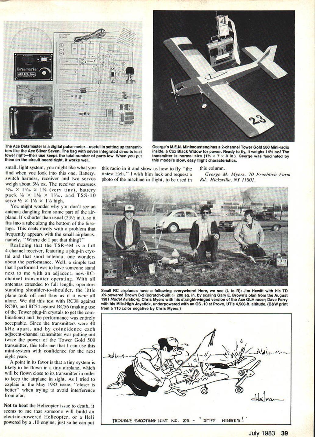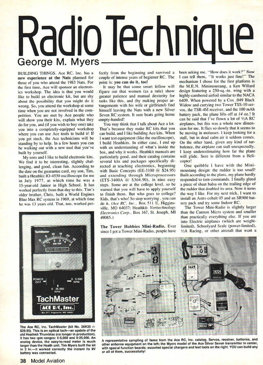 a loec ni ue George M Myers BUILDING THINGS Ace RC Inc has new experience Nats planned attend 1983 Nats first time Ace will sponsor electron ics workshop idea would like build electronic kit shy about possibility might wrong So attend workshop some time involved com petition met Ace people will show kits explain what you wish buy take completely-equipped workshop can use Ace tools build get stuck Ace technicians will standing help few hours can walking out new tool youve built yourself sons like build electronic kits find interesting slightly chal lenging good clean fun According date guarantee card son Tim built Heathkit 10-4530 oscilloscope July 1977 time 15-year-old Junior High School has worked perfectly day Tims older brother Chris built World Engines Blue Max RC system 1969 time 13 years old too worked perfectly beginning survived couple intense years beginner RC point can too may some smart fellow will figure out women rule show greater patience manual dexterity tasks like making proper ar rangements wife girlfriend find himself leaving Nats new Silver Seven RC system sure beats going home empty-handed may think talk about Ace lot Thats because make RC kits can build like building Ace kits want test equipment like oscilloscope build Heathkits either case end up understanding whats inside box works Heathkit manuals particularly good catalog contains several kits packages specifically di rected teaching electronics beginning Basic Concepts EE-3 100 Ca $2495 extending through Microprocessors ETS-3400A $30490 nine easy steps Some college level warned will have apply yourself finish goes college Kids thats So stop worrying can Ace RC Inc Box 511 E Higgins ville MO 64037 Heathkit Veritechnology Electronics Corp. Box 167 St Joseph MI 49085 Tower Hobbies Mini-Radio Ever since got Tower Mini-Radio people have asking does work Now can tell works just fine mechanism chose first platform MEN Minimoustang Ken Willard design featuring 250-sq-in wing highly-cambered airfoil similar NACA 6409 powered Cox 049 Black Widow carrying two Tower TSS-l0 ser vos TSR-4M receiver 100 mAh battery pack plane lifts off 14 oz can said Ive flown lot /2A RC airplanes whole new dimen sion flies slowly seems moving molasses keep looking stall dead calm air seldom comes other hand given kind tur bulence airplane can stall unexpectedly keep underestimating far plane will glide Sure different Heli copter quibble have Mini moustang design rudder too small Built according plans plane hardly responded turn commands finally glued piece sheet balsa trailing edge rudder doubled its area Now turns way like next trick want install Astro cobalt 05 5R900 bat tery pack try some Indoor RC Tower Mini-Radio slightly larger Cannon Micro system smaller practically everything else Electric airplanes weightlimited Schoolyard Scale power-limited /2A Racing other aircraft want 38 Model Aviation Ace RC Inc TachMaster kit No 26K25 Cu $2995 optical tachan update old Heathkit Thumbtac no longer production has two rpm ranges 0-5000 0-25000 An analog device easy-to-read meter much larger Heath unit Tim Myers built kit 2 hrit worked correctly instant its gV battery connected representative sampling items Ace RC Inc catalog Servos receiver batteries other airborne equipment left Myers model Ace Silver Seven transmitter center special function boards assorted special chargers test tools right YOU can build successfully small light system might like what find look Battery switch harness receiver two servos weigh about 3/4 oz receiver measures 116 X 6 X l/x very tiny battery pack X 1116 TSS-l0 servo X 1 high might wonder dont see antenna dangling some part air plane Its shorter usual 23 fits tube along bottom fuse lage deals nicely problem frequently appears small airplanes namely put thing Realizing TSR-4M full 4-channel receiver featuring plug-in crys tal short antenna wonders about performance Well simple test performed have someone stand next adjacent new-RC channel transmitter operating antennas extended full length operators standing shoulder-to-shoulder little plane took off flew alone did test RC38 against RC4O RC54 against RC56 making use Tower plug-in crystals get com binations performance entirely acceptable Since transmitters 40 kHz apart coincidence adjacent-channel transmitter putting out twice power Tower Gold 500 transmitter tells can use mini-system confidence next eight years point its favor tiny system likely flown tiny airplane will flown close its transmitter order keep airplane sight As tried explain May 1983 issue closer better trying avoid interference afar beat Helicopter issue death seems someone will build electric-powered Helicopter Heli powered 10 engine just can put radio show us fly tiniest Heli' wish him luck request photo machine flight used TOU~LE sXrlNe I-lINT NO 23 -STIFF RlNGt July 1983 39 Ace Datamaster digital pulse meteruseful setting up transmit ters like Ace Silver Seven bag seven integrated Circuits lower righttheir use keeps total number parts low put circuit board right works well Georges MEN Minimoustang has 2-channel Tower Gold 500 Mini-radio inside Cox Black Widow power Ready fly weighs 14 ozI transmitter normal size 1/4 x 7 x 8 George fascinated models slow easy flight characteristics column George M Myers 70 Froehlich Farm Rd Hicksville NY 1180] Small RC airplanes have following everywhere see L R Jim Hewitt TD 09-powered Brown B-2 scratch-built Cu 200 sq scaling Gary E Browns plan August 1981 Model Aviation Chris Myers straight-winged version Ace GLH racer Dave Perry Mile-High Joystick underpowered 05 10 Provo UTs 4500-ft altitude B&W print 110 color negative Chris Myers