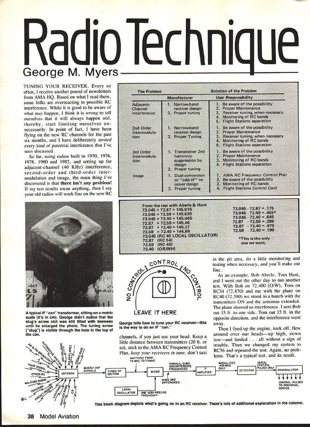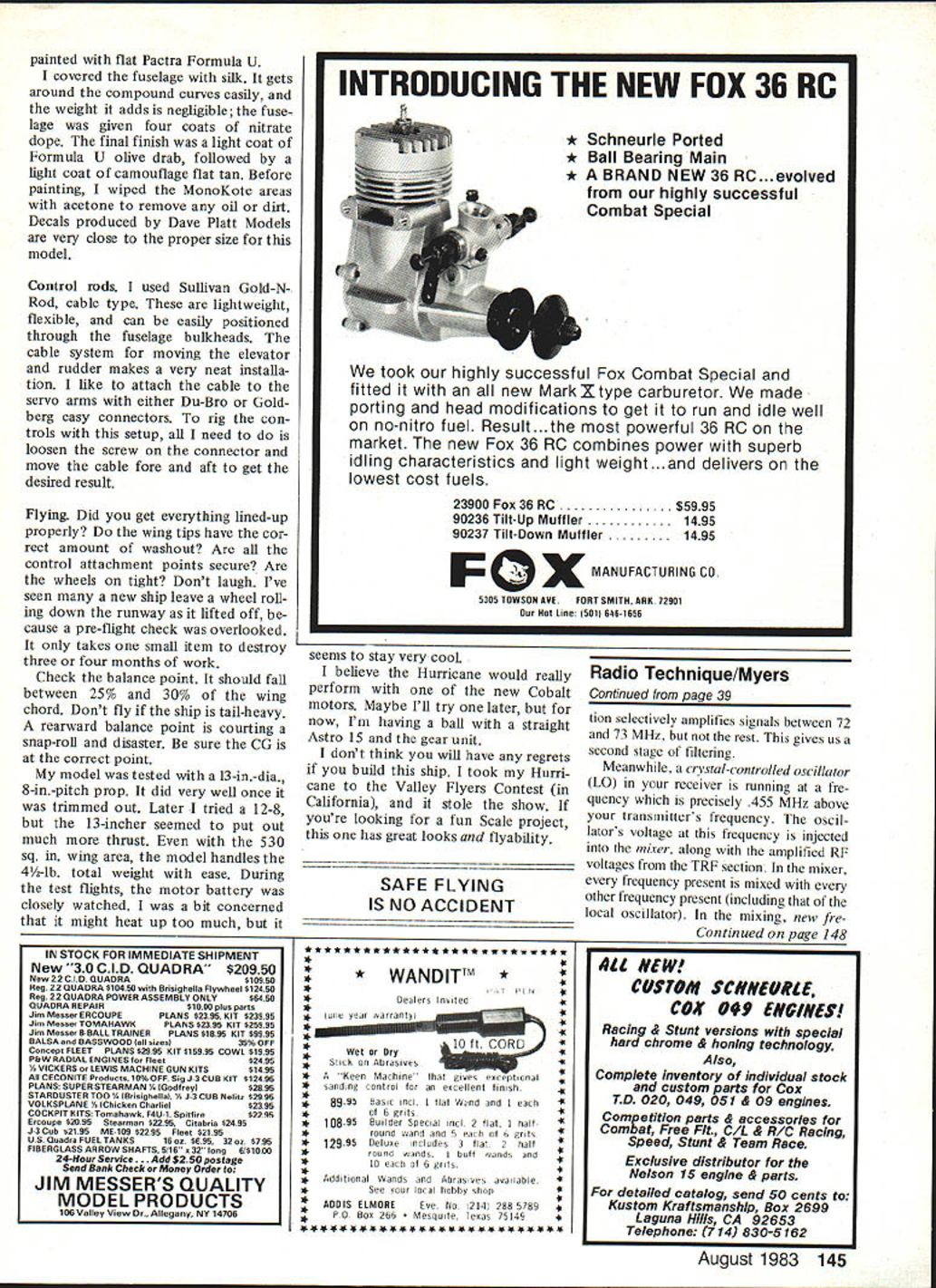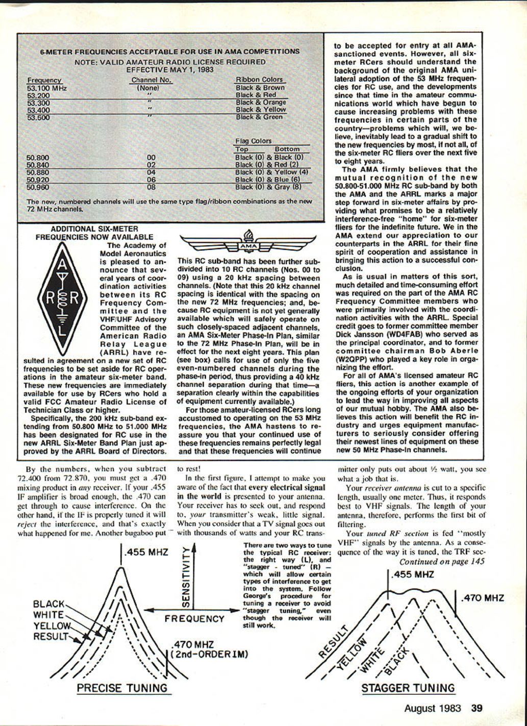 a loec ni ue George M Myers TUNING YOUR RECEIVER often receive another pound newsletters AMA HQ Based what read some folks overreacting possible RC interference good aware what may happen think wrong tell ourselves will always happen thereby start limiting ourselves un necessarily point fact have flying new RC channels past six months have deliberately invited kind potential interference Ive seen discussed So far using radios built 1970 1976 1978 1980 1982 setting up adjacent-channel 40 KHz interference second-order third-order intermodulation image main thing Ive discovered isnt problem test results mean anything say old radios will work fine new RC Problem AdjacentChannel Interference 2nd Order Intermodula tion 3rd Order Intermodula tion Image 7304o 730464 730454 7287 4 7287 7259 7 73045 7259 7240 CoNTRoL Ov 0 0 0 z LEAVE IT HERE George tells tune RC receiverthis isthewaytodoaniF can As example Bob Aberle Tom Hunt went out other day run another test Bob 72400 0/W Tom RC54 72870 plane RC4O 72590 stood bunch transmitters ON antennas extended plane showed us interference sent Bob out 15 ft side Tom out 15 ft opposite direction interference went away fired up engine took off flew around over headsup high down lowand landed gn trouble changed system RC56 repeated test Again no prob lems Thats typical test its result channels just use head Keep little distance between transmitters 20 ft .% sosticktotheAMARCFrequencyControl Plan keep receivers tune dont taxi QV THING FROM 72MHZ TO 73 MHZ 0SIGNALS SUMSMODULATEDSERIAL MOSTLY VHFAND DIFFRENCE455 MHZCONTROL -FREQUENCIESIFONLYPULSES ORIY SIGNALSTUNED RFMIXERAMPUFIEROETECTORDEMODULATOR OThER RCANTENNASECTION MS AI4D tAILIAI RAD DIFFERENSCONTROL PULSES TO INDIVIDUAL c0 q CALSERVOS OSCILLATORONE VERY PRECISE FREQUENCY block diagram depictS whats going RC receiver Theres lots additional explanation column 38 Model Aviation istho wasi pit area little monitoring testing necessary youll make out fine typical IF can transformer sifting metric scale Its cm George didnt notice slugs screw slot still filled beeswax until enlarged photo tuning screw slug visible through hole top can FREQLINCIES NOW AVAILABLE Academy Model Aeronautics pleased nounce sev eral years coor dination activities S Sbetween its RC Frequency Com mittee VHF/UHF Advisory Committee American Radio Relay League ARRL have re suIted agreement new set RC frequencies set aside RC oper ations amateur six-meter band new frequencies immediately available use RCers hold valid FCC Amateur Radio License Technician Class higher Specifically 200 kHz sub-band ex tending 50800 MHz 51000 MHz has designated RC use new ARRL Six-Meter Band Plan just ap proved ARRL Board Directors RC sub-band has further sub divided 10 RC channels Nos 00 09 using 20 kHz spacing between channels Note 20 kHz channel spacing identical spacing new 72 MHz frequencies cause BC equipment yet generally available will safely operate such closely-spaced adjacent channels AMA Six-Meter Phase-In Plan similar 72 MHz Phase-In Plan will effect next eight years plan see box calls use five even-numbered channels during phase-in period thus providing 40 kHz channel separation during timea separation clearly within capabilities equipment currently available amateur-licensed RCers long accustomed operating 53 MHz frequencies AMA hastens re assure continued use frequencies remains perfectly legal frequencies will continue accepted entry AMAsanctioned events However sixmeter RCers should understand background original AMA uni lateral adoption 53 MHz frequen cies RC use developments since time amateur commu nications world have begun cause increasing problems frequencies certain parts countryproblems will lieve inevitably lead gradual shift new frequencies six-meter RC fliers over next five eight years AMA firmly believes mutual recognition new 50800-51000 MHz RC sub-band both AMA ARRL marks major step forward six-meter affairs pro viding what promises relatively interference-free home six-meter fliers indefinite future AMA extend appreciation counterparts ARRL fine spirit cooperation assistance bringing action successful con clusion As usual matters sort much detailed time-consuming effort required part AMA RC Frequency Committee members primarily involved coordi nation activities ARRL Special credit goes former committee member Dick Jansson WD4FAB served principal coordinator former committee chairman Bob Aberle W2QPP played key role orga nizing effort AMAs licensed amateur RC fliers action another example ongoing efforts organization lead way improving aspects mutual hobby AMA also lieves action will benefit RC dustry urges equipment manufac turers seriously consider offering newest lines equipment new 50 MHz Phase-In channels numbers subtract rest 72400 72870 must get 470 first figure attempt make mixing product receiver 455 aware fact electrical signal IF amplifier broad enough 470 can world presented antenna get through cause interference receiver has seek out respond other hand IF properly tuned will transmitters weak little signal reject interference thats exactly consider TV signal goes out what happened Another bugaboo put thousands watts RC trans MHZ BLACK____ WHITE YELLOW*\FREQUENCY RESULT HZ 1/2nd-ORDERIM ISE TUNING two ways tune typical RC receiver right way L stagger tUned RI will allow certain types interference get system Follow Georges procedure tuning receiver avoid stagger tuning though receiver will still work mitter puts out about /2 watt see what job receiver antenna cut specific length usually meter Thus responds best VHF signals length antenna therefore performs first bit filtering tuned RF section fed mostly VHF signals antenna As conse quence way tuned TRF seeContinued page 145 / //4 /$d\\ STAGGER TUNING August 1983 39 AMA painted flat Pactra Formula U covered fuselage silk gets around compound curves easily weight adds negligible fuse lage given four coats nitrate dope final finish light coat Formula U olive drab followe