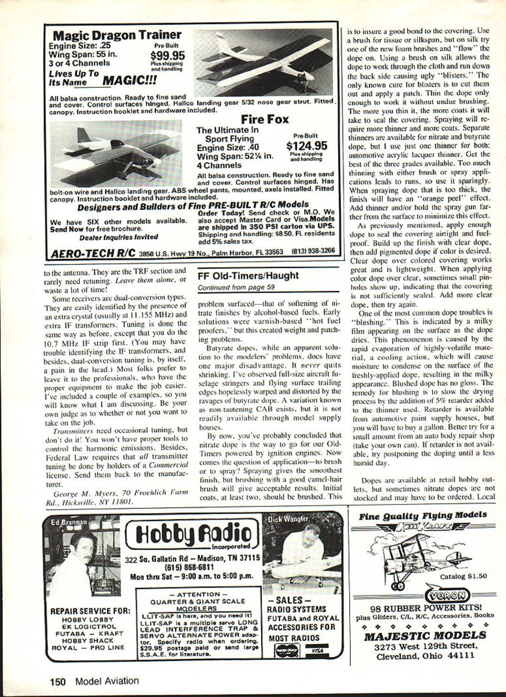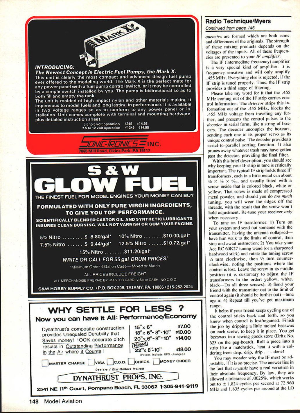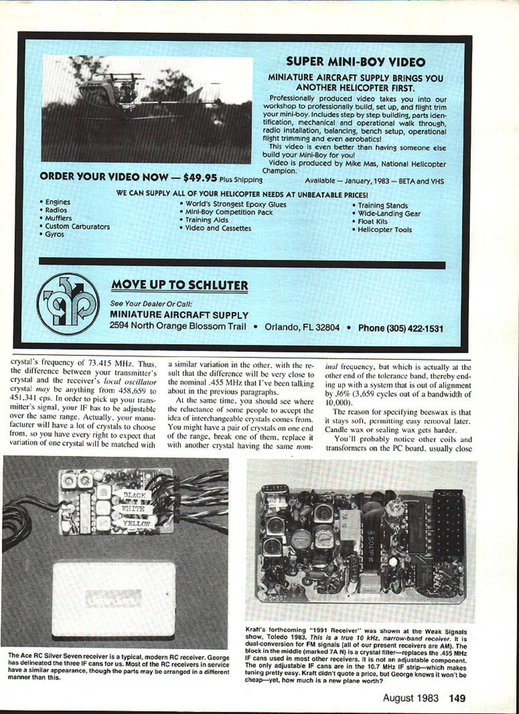 a loec ni ue George M Myers TUNING YOUR RECEIVER often receive another pound newsletters AMA HQ Based what read some folks overreacting possible RC interference good aware what may happen think wrong tell ourselves will always happen thereby start limiting ourselves un necessarily point fact have flying new RC channels past six months have deliberately invited kind potential interference Ive seen discussed So far using radios built 1970 1976 1978 1980 1982 setting up adjacent-channel 40 KHz interference second-order third-order intermodulation image main thing Ive discovered isnt problem test results mean anything say old radios will work fine new RC Problem AdjacentChannel Interference 2nd Order Intermodula tion 3rd Order Intermodula tion Image 7304o 730464 730454 7287 4 7287 7259 7 73045 7259 7240 CoNTRoL Ov 0 0 0 z LEAVE IT HERE George tells tune RC receiverthis isthewaytodoaniF can As example Bob Aberle Tom Hunt went out other day run another test Bob 72400 0/W Tom RC54 72870 plane RC4O 72590 stood bunch transmitters ON antennas extended plane showed us interference sent Bob out 15 ft side Tom out 15 ft opposite direction interference went away fired up engine took off flew around over headsup high down lowand landed gn trouble changed system RC56 repeated test Again no prob lems Thats typical test its result channels just use head Keep little distance between transmitters 20 ft .% sosticktotheAMARCFrequencyControl Plan keep receivers tune dont taxi QV THING FROM 72MHZ TO 73 MHZ 0SIGNALS SUMSMODULATEDSERIAL MOSTLY VHFAND DIFFRENCE455 MHZCONTROL -FREQUENCIESIFONLYPULSES ORIY SIGNALSTUNED RFMIXERAMPUFIEROETECTORDEMODULATOR OThER RCANTENNASECTION MS AI4D tAILIAI RAD DIFFERENSCONTROL PULSES TO INDIVIDUAL c0 q CALSERVOS OSCILLATORONE VERY PRECISE FREQUENCY block diagram depictS whats going RC receiver Theres lots additional explanation column 38 Model Aviation istho wasi pit area little monitoring testing necessary youll make out fine typical IF can transformer sifting metric scale Its cm George didnt notice slugs screw slot still filled beeswax until enlarged photo tuning screw slug visible through hole top can FREQLINCIES NOW AVAILABLE Academy Model Aeronautics pleased nounce sev eral years coor dination activities S Sbetween its RC Frequency Com mittee VHF/UHF Advisory Committee American Radio Relay League ARRL have re suIted agreement new set RC frequencies set aside RC oper ations amateur six-meter band new frequencies immediately available use RCers hold valid FCC Amateur Radio License Technician Class higher Specifically 200 kHz sub-band ex tending 50800 MHz 51000 MHz has designated RC use new ARRL Six-Meter Band Plan just ap proved ARRL Board Directors RC sub-band has further sub divided 10 RC channels Nos 00 09 using 20 kHz spacing between channels Note 20 kHz channel spacing identical spacing new 72 MHz frequencies cause BC equipment yet generally available will safely operate such closely-spaced adjacent channels AMA Six-Meter Phase-In Plan similar 72 MHz Phase-In Plan will effect next eight years plan see box calls use five even-numbered channels during phase-in period thus providing 40 kHz channel separation during timea separation clearly within capabilities equipment currently available amateur-licensed RCers long accustomed operating 53 MHz frequencies AMA hastens re assure continued use frequencies remains perfectly legal frequencies will continue accepted entry AMAsanctioned events However sixmeter RCers should understand background original AMA uni lateral adoption 53 MHz frequen cies RC use developments since time amateur commu nications world have begun cause increasing problems frequencies certain parts countryproblems will lieve inevitably lead gradual shift new frequencies six-meter RC fliers over next five eight years AMA firmly believes mutual recognition new 50800-51000 MHz RC sub-band both AMA ARRL marks major step forward six-meter affairs pro viding what promises relatively interference-free home six-meter fliers indefinite future AMA extend appreciation counterparts ARRL fine spirit cooperation assistance bringing action successful con clusion As usual matters sort much detailed time-consuming effort required part AMA RC Frequency Committee members primarily involved coordi nation activities ARRL Special credit goes former committee member Dick Jansson WD4FAB served principal coordinator former committee chairman Bob Aberle W2QPP played key role orga nizing effort AMAs licensed amateur RC fliers action another example ongoing efforts organization lead way improving aspects mutual hobby AMA also lieves action will benefit RC dustry urges equipment manufac turers seriously consider offering newest lines equipment new 50 MHz Phase-In channels numbers subtract rest 72400 72870 must get 470 first figure attempt make mixing product receiver 455 aware fact electrical signal IF amplifier broad enough 470 can world presented antenna get through cause interference receiver has seek out respond other hand IF properly tuned will transmitters weak little signal reject interference thats exactly consider TV signal goes out what happened Another bugaboo put thousands watts RC trans MHZ BLACK____ WHITE YELLOW*\FREQUENCY RESULT HZ 1/2nd-ORDERIM ISE TUNING two ways tune typical RC receiver right way L stagger tUned RI will allow certain types interference get system Follow Georges procedure tuning receiver avoid stagger tuning though receiver will still work mitter puts out about /2 watt see what job receiver antenna cut specific length usually meter Thus responds best VHF signals length antenna therefore performs first bit filtering tuned RF section fed mostly VHF signals antenna As conse quence way tuned TRF seeContinued page 145 / //4 /$d\\ STAGGER TUNING August 1983 39 AMA painted flat Pactra Formula U covered fuselage silk gets around compound curves easily weight adds negligible fuse lage given four coats nitrate dope final finish light coat Formula U olive drab followe
