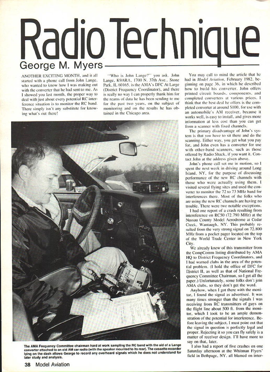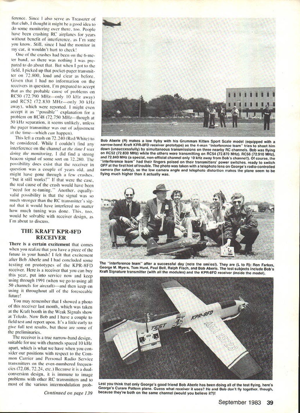 d loec ni ue George M Myers ANOTHER EXCITING MONTH started phone call John Lange wanted know making out converter sent As showed last month proper way deal just about potential RC inter ference situation monitor RC hand simply isnt substitute know ing whats out John Lange' ask John Lange K9ARA 1700 N 37th Ave Stone Park IL 60165 AMAs DEC Large District Frequency Coordinator really no way can properly thank him reams data has sending past two years subject monitoring results has ob tained Chicaco area may call mind article Model Aviufion February 1982 ginning page 36 described build converter John offers printed circuit boards components completed converters various prices think best deal offers com pleted converter around S 100 use automobiles AM receiver because works well easy install gives information less cost can get scanner fixed channels primary disadvantage Johns sys tem von have sit ou get what pay scanning Either way John has converter use other-band scanners such offered Radio Shack want Con tact John address civen above Johns phone call set motion spent next week driving around Long Island NY purpose discussing performance new RC channels actually usine visited several tlying sites used con verter monitor 72 73 MHz band interferences Most folks using new RC channels having no trouble two notable exceptions report crash resulting intereference RC5O 72790 MHz Nassau County Model Aerodrome Cedar Creek Wantaugh NY probably re sulted very strong signal 72800 MHz pocket pager located top World Trade Center New York City already knew transmitter CompComm listing distributed AMA HQ District Frequency Coordinators warned clubs area poten tial problem hold office DFC District II well National Fre quency Committee Chairman get paper Unfortunately some folks dont join AMA clubs dont get word Anyhow got moni tor found signal advertised times stronger signals receiving RC transmitters guys flight line about 500 ft moni tor took ample demon stration potential interference fore leaving subject must point out signal question perfectly legal proper Rejecting can fly safely matter receiver design Ill have say later also report five crashes Saturday afternoon Whitman Flyers field Bethpage NY blamed inter38 Model Aviation AMA Frequency Committee chairman hard work sampling RC band aid Lange converter attached old AM car radio speaker mounted its rear cassette recorder lying dash allows George record overheard signals does understand later study analysis ference Since also serve Treasurer club thought might good idea some monitoring over too People have crashing RC airplanes years benefit interference Im sure know Still since monitor car wouldnt hurt check crashes 6-me ter band nothine pre pared about got field picked up pocket-pager transmit ter 72800 loud clear before Given no information receivers question Im prepared accept probable cause problems RC5O 72790 MHzonly 10 kH away RC52 72830 MHionly 30 kHz away reported might accept 'possible' explanation problem RC48 72750 MHzthough 50 kHz separation seems unlikely unless pager transmitter out adjustment timewhich can happen left crash 72240 Red White considered couldnt find interference channel time wao doing lnonibarim did find strong beacon signal some son 72280 possibility does exist receiver question couple years old might have gone through few crashes 'but still works' case real cause crash would have 'need re-tunine' Another equallyvalid possibility signal much stronger RC transmitters siiz nal would have interfered no matter much tuning done too would solvable receiver design Im about discuss THE KRAFT KPR-8FD RECEIVER certain excitement comes realize have piece future hands felt excitement after Bob Aberle concluded some testing prototypes KPR-8FD receiver receiver can buy year put service now keep using through 1991 go using 50 channels aircraft--and keep using throughout foreseeable future may remember showed photo receiver last month taken Kraft booth Weak Signals show Toledo Now Bob have couple field test report upon Its little early give full test results some preliminaries receiver true narrow-band design suitable use channels spaced 10 kHz apart what have con sider positions respect Com mon Carrier Personal Radio Service transmitters even-numbered frequen cies 7208 7224 etc Because dual conversion design immune image problems other RC transmitters various intermodulation prob continued page 139 September 1983 39 Bob Aberle R makes low flyby Grumman Kitten Sport Scale model equipped narrow-band Kratt KPR-8FD receiver prototype 4-man interference team tries shoot him down unsuccessfully simultaneous transmissions three nearby RC channels Bob flying RC52 72830 MHz others transmitting RC54 72870 MHz RC56 72910 MHz 72840 MHz special non-official channel 10 kHz away Bobs channel course interference team fingers poised transmitters power switches ready switch OFF first hint trouble photo taken telephoto lens Georges radio-controlled camera safety low camera angle telephoto distortion makes plane seem flying much higher actually interference team after successful day note smiles L H Ron Farkas George M Myers Tom Hunt Paul Bell Ralph Fisch Bob Aberle test subjects include Bobs Kraft Signature transmitter modules KPR-8FD receiver inside model Lest think Georges good friend Bob Aberle has doing ot test flying heres Georges Curare Pattern plane Guess what receiver uses Bob dont fly together though because theyre both same channel would believe nose gets too high tail waggles prototype vertical fin replaced larger swoopy-looking thing have learned stab wing blank out fin high angles tack produces fish tail about 50 side side everything under controL model isnt going drop wing snap-roll just waggles tail sassy sort wayand goes merry way Hurst Bowers upon learning models fish tailing wrote has built three different Luton Minors over years tail-waggle characteristic seems perfect example model duplicating idiosyn cracy full-sized aircraft cannot 