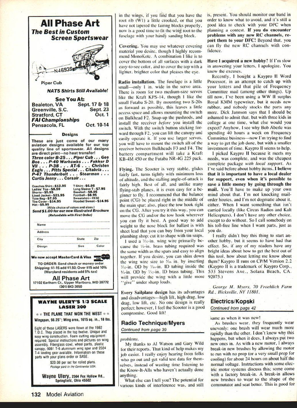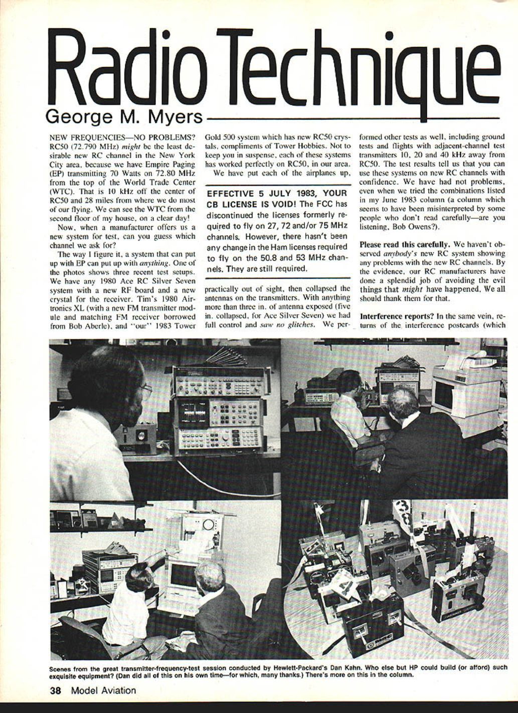a loec ni ue George M Myers NEW FREQUENCIESNO PROBLEMS RC5O 72790 MHz might least de sirable new RC channel New York City area because have Empire Paging EP transmitting 70 Watts 7280 MHz top World Trade Center WTC 10 kHz off center RC5O 28 miles flying can see WTC second floor house clear day Now manufacturer offers us new system test can guess channel ask way figure system can put up EP can put up anything photos shows three recent test setups have 1980 Ace RC Silver Seven system new RF hoard new crystal receiver Tims 1980 Air tronics XL new FM transmitter mod ule matching FM receiver borrowed Bob Aberle 1983 Tower Gold 500 system has new RC5O crys tals compliments Tower Hobbies keep suspense systems has worked perfectly RC5O area have put airplanes up EFFECTIVE 5 JULY 1983 YOUR CB LICENSE IS VOID FCC has discontinued licenses formerly re quired fly 27 72 and/or 75 MHz channels However hasnt change Ham licenses required fly 508 53 MHz chan nels still required practically out sight collapsed antennas transmitters anything three antenna exposed five collapsed Ace Silver Seven full control saw no glitches performed other tests well including ground tests flights adjacent-channel test transmitters 10 20 40 kHz away RC5O test results tell us can use systems new RC channels confidence have problems tried combinations listed June 1983 column column seems have misinterpreted some people dont read carefullyare listening Bob Owens Please read carefully havent ob served anybodys new RC system showing problems new RC channels evidence RC manufacturers have done splendid job avoiding evil things might have happened should thank Interference reports same vein re turns interference postcards 38 Model Aviation Scenes great transmitter-frequency-test session conducted Hewlett-Packards Dan Kahn else HP could build afford such exquisite equipment Dan did own timefor thanks Theres column included June July 1983 issues Model Aviation have slow Apparently folks actually went out bought new systems old ones converted have found weve got fantastically good deal new RC channels So far postcards Ive received District II members Im still District Frequency CoordinatorDFCthere have reported troubles old channels exactly what expected AMA accepted FCCs kind offer new 'interstitial channels owe big debt gratitude Don Camp bell proposing Mike Gilber tson demonstrating could used RC Thank Don Mike significant test results big foursegment photo montage shows Dan Kahn Electronic Equipment Specialist local Hewlett-Packard office hard work after business hours testing group transmit ters Bob Aberle able collect moments notice Dan tested super-sophisticated HP8566A Programmable Spectrum Analyzer digital system controlled HP9836 desk-top computer machine can read transmitter RE accurately presence modulation analog analyzers cant measures accuracy Hertz zero span collection included 18 transmitters ranging expensive sophisti cated 1983 FM set ancient 1970 transmitter recently serviced its manufacturer sets ranged price $6995 dry-battery two-chan nel Kraft Signature Bobs five modules four interchangeable RF boards five interchangeable crystals 14 soldered-in crystals found interchangeable modules RF boards too sets actively Service collected testing over data analyzed found following I The cheapest set best overall performance 2 Average precision RF 0020% 20% better current FCC perform ance requirement 0025% Now re member some sets built meet older less-stringent requirements 3 Sidebands spurious emissions controlled within current FCC specifi cations case 4 Interchangeable crystals gave best group performance Meanwhile out Greenwood IN Gary Wild testing 31 transmitters club using Hewlett-Packard 141T 8555A RF section 8552B IF section Three transmitters emissions outside current FCC speci fications knows built treated What telling think finding practice transmitters taken active service good enough operate new RC channels co operatively different direction Al Watson Assistant DEC AMA District XI liv ing Seattle WA has sent com pilation frequency combinations worked derived five successful Pylon races Now know folks Seat tle area have some very specific problems certain channels result govern ment radios pocket pagers Thus certain channels automatically excluded Racing matrix rest New RC channels playing together no October 1983 39 pile RC5O test vehicles Georges lawn worked perfectly Read column see what feat Georges area Now puzzle photographers audience photo shown full-frame taken Dan Kahn modeler too Marks Models Wanderer Sailplane Dan likes beginners model strong easy build fly easy repair necessary Dans World Expert transmitter tested showed excellent properties Continued page 132 Contributing Editor ueorge M myers snown working playIng witn ma new toy Icorrection TOOL looks like reading manual else fails read directions trying figure out make go picture taken info column Phase Art Best Custom Screen Sportswear \~kl 4893SNu Piper Cub NATS Shirts Still Available See Bealeton VASept 17 8 18 Greenville SCSept 23 Stratford CTOct 1 FAI Championships Pensacola FLOct 10-14 Designs just come aviation designs available top quality line sportswear designs direct printno heat transfer Three color B-25. Piper Cub. Bee. P40 Warha wks kker D VII. P-3. AT-6. Christen Eagle. Pitts Special. Citabria. P47 Thunderbolt earman Curtis enny. Corsair. coaches shirtS1295TShirt$695 LadiCs TopSSSOLong Sleeve T$795 Shorts$5SSBesebell$S95 Lined JacketS2195Football$S95 Tote Bag$9SSweetshirt$950 Tire coverS1495Hooded Sweot$1495 HatS595 Wide choice colors aizesi Send $100 new illustrated Brochure Refundable First Order Name Address cityStateZip DesignSize Color now accept MasterCard & Visa TO ORDER Send check money order Shipping $1-is add 5150 Over $15 add 10% Maryland residents add 5% taxI Phase Art 17102 Earlham Ct Upper Marlboro MD 20772 1301 8433050 wings find have root rib WI little crooked have tapered fairing blocks properly now good timc fi