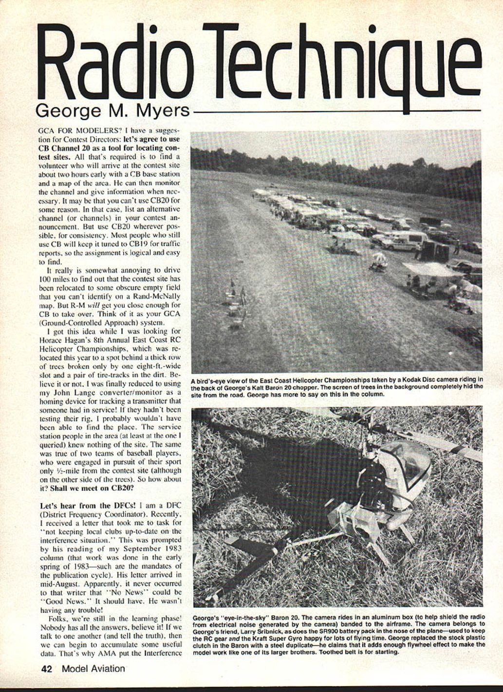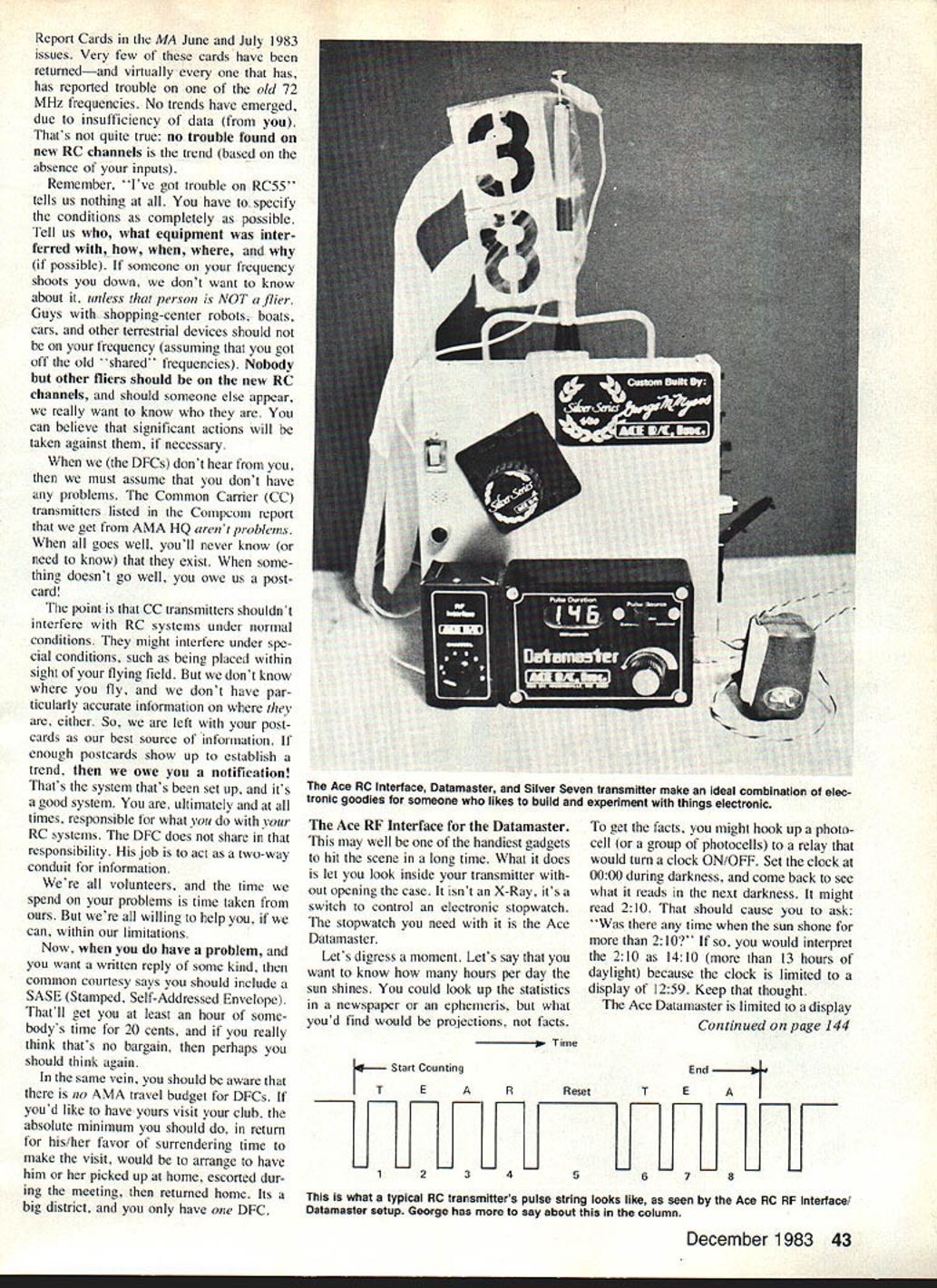 a loec ni ue George M Myers GCA FOR MODELERS have sugges tion Contest Directors lets agree use CB Channel 20 tool locating con test sites thats required find volunteer will arrive contest site about two hours early CB base station map area can monitor channel give information nec essary may cant use CB2O some reason case list alternative channel channels contest nouncement use CB2O wherever pos sible consistency Most people still use CB will keep tuned CBI9 traffic reports assignment logical easy find really somewhat annoying drive 100 miles find out contest site has relocated some obscure empty field cant identify Rand-McNally map R-M will get close enough CB take over Think GCA Ground-Controlled Approach system got idea looking Horace Hagans 8th Annual East Coast RC Helicopter Championships re located year spot behind thick row trees broken eight-ft-wide slot pair tire-tracks dirt lieve finally reduced using John Lange converter/monitor homing device tracking transmitter someone service hadnt testing rig probably wouldnt have able find place service station people area least queried knew nothing site same true two teams baseball players engaged pursuit sport /-mile contest site although other side trees So about Shall meet CB2O Lets hear DFCs am DEC District Frequency Coordinator Recently received letter took task keeping local clubs up-to-date interference situation prompted reading September 1983 column work done early spring 1983such mandates publication cycle letter arrived mid-August Apparently never occurred writer No News could Good News should have wasnt having trouble Folks still learning phase Nobody has answers believe talk another tell truth can begin accumulate some useful data Thats AMA put Interference 42 Model Aviation birds-eye view East Coast Helicopter Championships taken Kodak Disc camera riding back Georges Kalt Baron 20 chopper screen trees background completely hid site road George has say column Georges eye-in-the-sky Baron 20 camera rides aluminum box help shield radio electrical noise generated camera banded airframe camera belongs Georges friend Larry Sribnick does SF1900 battery pack nose planeused keep RC gear Kraft Super Gyro happy lots flying time George replaced stock plastic clutch Baron steel duplicatehe claims adds enough flywheel effect make model work like its larger brothers Toothed belt starting Report Cards MA June July 1983 issues Very few cards have returnedand virtually has has reported trouble old 72 MHz frequencies No trends have emerged due insufficiency data Thats quite true no trouble found new RC channels trend based absence inputs Remember ive got trouble RC55 tells us nothing have specify conditions completely possible Tell us what equipment inter ferred possible someone frequency shoots down dont want know about unless person NOT flier Guys shopping-center robots boats cars other terrestrial devices should frequency assuming got off old shared frequencies Nobody other fliers should new RC channels should someone else appear really want know can believe significant actions will taken against necessary DFCs dont hear must assume dont have problems Common Carrier CC transmitters listed Compcom report get AMA HQ arent problems goes well youll never know need know exist some thing doesnt go well owe us post card point CC transmitters shouldnt interfere RC systems under normal conditions might interfere under spe cial conditions such being placed within sight flying field dont know fly dont have par ticularly accurate information either So left post cards best source information enough postcards show up establish trend owe notification Thats system thats set up its good system ultimately times responsible what RC systems DEC does share responsibility job act two-way conduit information volunteers time spend problems time taken willing help can within limitations Now have problem want written reply some kind common courtesy says should include SASE Stamped Self-Addressed Envelope ThatIl get least hour some bodys time 20 cents really think thats no bargain perhaps should think again same vein should aware no AMA travel budget DFCs youd like have yours visit club absolute minimum should return his/her favor surrendering time make visit would arrange have him picked up home escorted dur ing meeting returned home Its big district have DEC Ace RF Interface Datamaster may well handiest gadgets hit scene long time What does let look inside transmitter out opening case isnt X-Ray its switch control electronic stopwatch stopwatch need Ace Datamaster Lets digress moment Lets say want know hours per day sun shines could look up statistics newspaper ephemeris what youd find would projections facts K- Start Counting IT get facts might hook up photo cell group photocells relay would turn clock ON/OFF Set clock 0000 during darkness come back see what reads next darkness might read 210 should cause ask time sun shone 210 would interpret 210 1410 13 hours daylight because clock limited display 1259 Keep thought Ace Datamaster limited display Continued page 144 End EResetTEA AR 12345678 what typical RC transmitters pulse string looks like seen Ace FiC RF Interface Datamaster setup George has say about column December 1983 43 k Ace RC Interface Datamaster Silver Seven transmitter make ideal combination elec tronic goodies someone likes build experiment things electronic Manufacturers Super Fli 84S18995 92$19995 Zlin Z5OL 84S15995 92$18995 Beagle Pup 85 QuadraS18995 Softglas Filler Sealer Primer one$12SOIcan Fast Threads Brass inserts 4-406132 8132 /-20S098 Fast Tape Wing Sheeting 3x50$1095 1 x50$595 Mister 5 X 5 Casted Resin PilotS1295 Starter Kits Canopy cowl LG Plans kits Send $100 catalog China Clipper/Chappell Continued page 147 Happy flying China Clipper Material List ICarl Goldberg Skylane 62 wing kit 4Aluminum soft drink cans cowls 4OS 10 engines 27-4 Props starboard side 27-6 Props pon side 4~90o Belicranks throttles 3Vs-in Balsa sheet 3 x 36 8-in Bals
