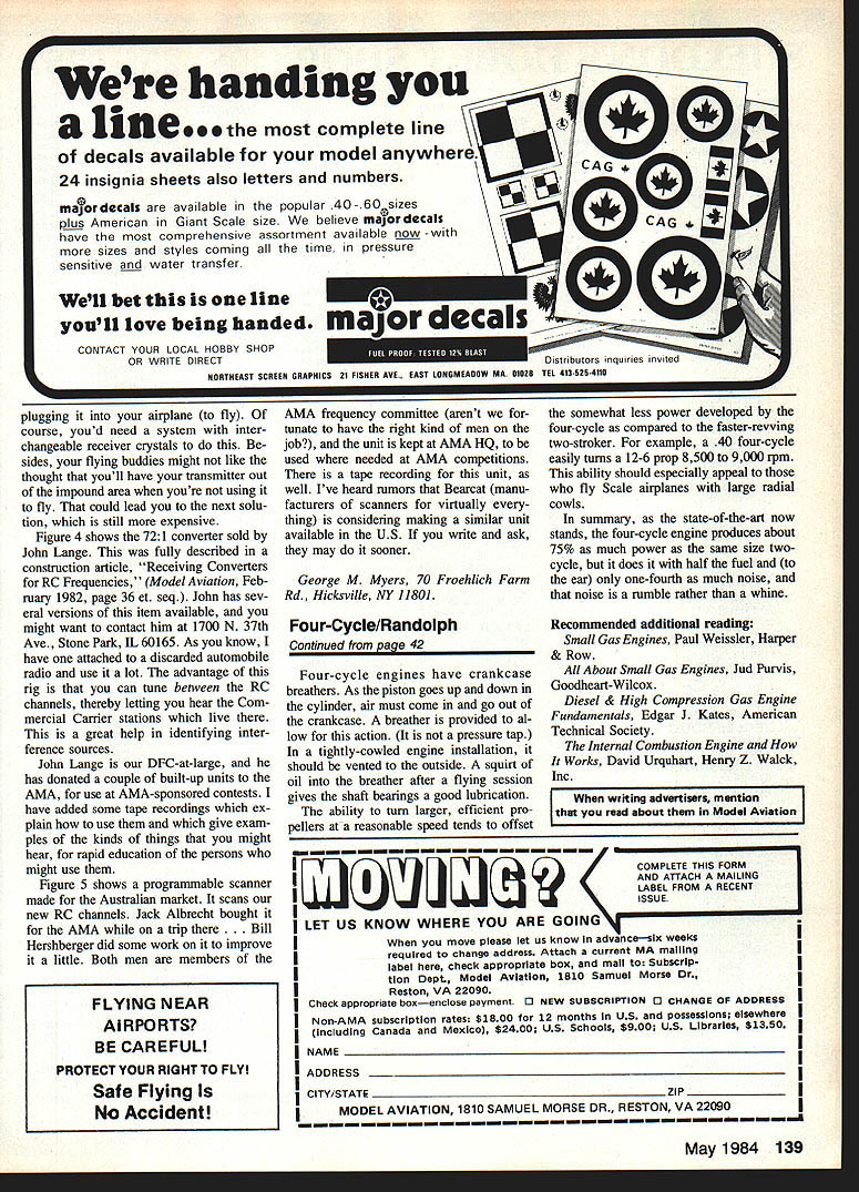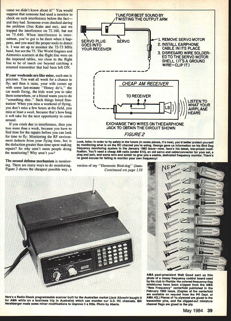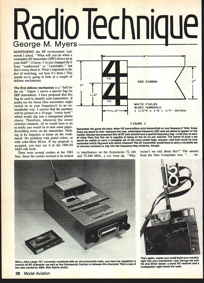 Radio Technic George M Myers MONITORING RF environment Last month asked What will switchable-RF transmitter SRF shows up field know Ive just changed S synthesized switchable dont wony about Whats important fact switching its done month going look couple defense mechanisms first defense mechanism bell cat Figure 1 shows special flag SRF transmitters have proposed flag used identify such transmitters points out threat transmitter might switch frequency un mistakable way assume numbers will printed 10-page comic book would slip transparent plastic sleeve Therefore whenever owner switched channels would have to notify would turn some pages Everything stores transmitter Noth ing forgotten home work bench No problems pastel colors color-blind RCers proposal accepted may see 1984-85 AMA rule book several crashes 1983 Nats Since crashes seemed related Ii Jr Fl FD 41 RED RIBBON WHITE FiELDS BLACK NUMERALS 1 212H x 1W x ue jL 1/4 Stroke FIGURE 1 Remember good old days RC transmitters transmitted frequency Well times about endbecause new switchable-frequency SF sets about appear market George has proposed SF sets should have special frequency flaga red warn other fliers set capable being air channel owner such set would unable carry complete set tha color-coded flags anywayand could ever remember flag went channel SF transmitter would have carry complete set channel numbers slip frequency-flag windows though interference frequencies 72160 75640 MHz cry went up werent told about answer Nats Committee hn Lange 721 converter combined old automobile radio have capability monitor RC channelsas well Commercial Carriers between channels two sets owned AMA Bob Aberle photo again maybe could build monitor right transmitterlike George did Ace Silver Seven small RC receiver loudspeaker right inside case 38 Model Aviation cause didnt know about would suppose someone used monitor check such interference before fact Someone checked during problem Dan Kahn trapped interference 72160 75640 interference inter mittent youve got hap pens need proper tools detect set up monitor 72-73 MHz band 75 World Engines Airtronics scanners flight line impound tables too close flight line much use beyond catching returned transmitter left ON weekends like precious wait week chance fly rains wife comes up some last-minute Honey dos car needs fixing kids want take somewhere friend wants something else Such things breed frus tration miss weekend flying dont miss few hours field miss least week because thats long will take next opportunity come around crash due interference lose week because have find time repairs before can look time fly Monitoring RF environ ment deducts flying time deduction greater time spent making repairs So arent people doing monitoring arent second defense mechanism monitor ing ways monitoring Figure 2 shows cheapest possible way Look folks order fly safely future some places its now youd better protect yourself monitoring what RC channel youre using George gave us information Bird Dog frequency monitoring system January 1982 issuenow hems latest low-priced modi fication Youll need cheap AM radio under $10 old servo cabie/connector set plug jack some wIre solder give usable dedicated frequency monitor Thems no good excuse failing monitor own frequencyl version Electronic Bird-dog Janu Continued page 138 May 1984 39 _ CHEAP AM RECEIVER TO RECEIVER 1 N I________________ EXCHANGE TWO WIRES ON THE EARPHONE JACK TO OBTAIN THE CIRCUIT SHOWN FIGURE 2 H) ) ) LISTEN TO WHAT YOUR AIRPLANE HEARS TUNE FOR BEST SOUND BY TWISTING THE OUTPUT ARM 1 REMOVE SERVO MOTOR SERVO PLUGSERVO2 INSTALL EARPHONE YOUR RECEIVERCABLE IN ITS PLACE 3 DISREGARD WIRE SOLDER ED TO THESERVO MOTOR SHELL ITS GROUND WIRECLIP IT / Heres Radio Shack programmable scanner built Australian market Jack Aibrecht bought AMA business trip Australia can monitor US RC channels Bill Hershberger made some minor modifications Improve little Photo Aberie AMA past-president Walt Good sent us photo classy frequency control board used club Florida colored frequency-flag miniatures have clipped AMA New Frequency centerfold published Febmary 1983 issue Copies centerfold available request PR Dept AMA HO Pieces 1M plywood glued transmitter pins clipped-out miniature channel flags glued ply ILZUZL a/c 361 Iso RoadSan Antonio TX 73216 512 414712 FUTABA 7FGKFM23395 6FGK FMSOLD OUT 7FGK18495 6FGK16495 5FGK15495 6FG15495 4FG14995 4L3-5/2810495 2F2/S-28-R4H7495 S-28SERVO1895 5-32SERVO2595 COVERINGS Monokote Opaque 3 Rolls1695 Monokoge Trans. 3 Rolls1695 Monokote Met. 3 Rolls2095 CYANOACRYLATE Hot Stuff HS-t e169 Itol Stuff HSTl /z Ounce169 Hot Stuff HS-4 2 Ounce589 Hot Stuff HST-4 2 Ounce539 Slot Shot245 Jet Ouncet79 Super Jet e179 Jet 2 Ounce599 Super Jet 2 Ounce599 EPOXY GLUE Deveon 30 Minute 9 Ounce595 Devrou 5 Minute 9 Ounce595 Hobbypoxy 113 Ounce359 tiobbypoxy IV 3 Ounce559 Hobbypoxy III 3 Ounce295 SULLIVAN HT #600 Starter2795 HTD #601 Starter3095 HTD24 #602 Starter3295 PLEASE NOTE Prices subject change manufacturers prices change items subject availability time sale Prices effect until next Model Aviation Issue Show room prices may slightly higher Visit show room San Antonio jW discount price list refunded first order Shipping& Handling Prepaid orders S300 COD Credit Card orders 5595 Overseas orders add estimated shipping 25% deposit re4uired first lime COD 55% sates tax required Texas residents Personal checks delay shipping 15 days Cavalier/Laycock Continued oaae 135 hole get below engine mount better have too much paint enough ready cover fuselage now time add main landing gear After covering add tail wheel assembly wing tail hold-down dowels tray method radio installation has worked fine Use epoxy mount tray Incidentally tray strengthens center fuselage sure about getting center gravity CG lo cated correctly install radio tray last move fore aft get proper balance position Wing Once ribs cut wing panels assemble quite fast Incidentally four ribs can cut 3 x 36-in sh