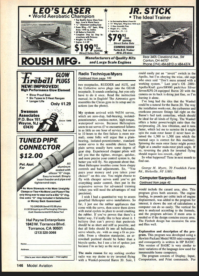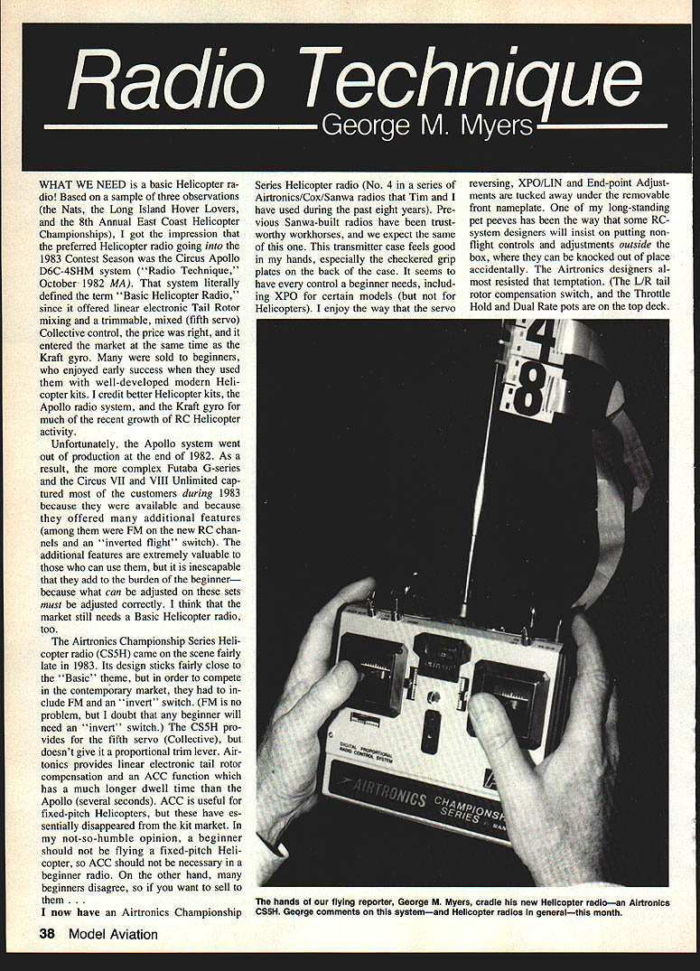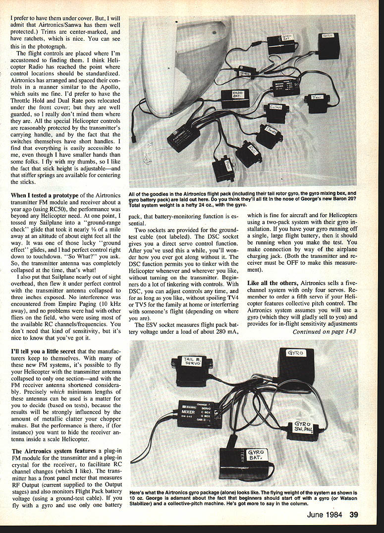 WHAT WE NEED basic Helicopter ra dio Based sample three observations Nats Long Island Hover Lovers 8th Annual East Coast Helicopter Championships got impression preferred Helicopter radio going 1983 Contest Season Circus Apollo D6C-4SHM system Radio Technique October 1982 MA system literally defined term Basic Helicopter Radio since offered linear electronic Tail Rotor mixing trimmable mixed fifth servo Collective control price right entered market same time Kraft gyro sold beginners enjoyed early success used well-developed modern Heli copter kits credit better Helicopter kits Apollo radio system Kraft gyro much recent growth RC Helicopter activity Unfortunately Apollo system went out production end 1982 As result complex Futaba 0-series Circus VII VIII Unlimited cap tured customers during 1983 because available because offered additional features among FM new RC chan nels inverted flight switch additional features extremely valuable can use inescapable add burden beginner because what can adjusted sets must adjusted correctly think market still needs Basic Helicopter radio too Airtronics Championship Series Heli copter radio CS5H came scene fairly late 1983 Its design sticks fairly close Basic theme order compete contemporary market clude FM invert switch FM no problem doubt beginner will need invert switch CS5H pro vides fifth servo Collective doesnt give proportional trim lever Airtonics provides linear electronic tail rotor compensation ACC function has much longer dwell time Apollo several seconds ACC useful fixed-pitch Helicopters have es sentially disappeared kit market not-so-humble opinion beginner should flying fixed-pitch Heli copter ACC should necessary beginner radio other hand beginners disagree want sell now have Airtronics Championship Series Helicopter radio No 4 series Airtronics/Cox/Sanwa radios Tim have used during past eight years Pre vious Sanwa-built radios have trust worthy workhorses expect same transmitter case feels good hands especially checkered grip plates back case seems have control beginner needs includ ing XPO certain models Helicooters eniov way servo reversing XPO/LIN End-point Adjust ments tucked away under removable front nameplate long-standing pet peeves has way some RC system designers will insist putting nonflight controls adjustments outside box can knocked out place accidentally Airtronics designers al resisted temptation L/R tail rotor compensation switch Throttle Hold Dual Rate pots top deck 38 Model Aviation hands flying reporter George M Myers cradle new Helicopter radioan Airtronlcs CS5H GeQrge comments systemand Helicopter radios generalthis month prefer have under cover will admit Airtronics/Sanwa has well protected Trims center-marked have ratchets nice can see photograph flight controls placed Im accustomed finding think Heli copter Radio has reached point control locations should standardized Airtronics has arranged spaced con trols manner similar Apollo suits fine Id prefer have Throttle Hold Dual Rate pots relocated under front cover well guarded really dont mind special Helicopter controls reasonably protected transmitters carrying handle fact switches themselves have short handles find everything easily accessible though have smaller hands some folks fly thumbs like fact stick height adjustableand stiffer springs available centering sticks tested prototype Airtronics transmitter FM module receiver about year ago using RC5O performance beyond Helicopter need point tossed Sailplane ground-range check glide took nearly /8 mile away altitude about eight feet way lucky ground effect glides perfect control right down touchdown So What ask So transmitter antenna completely collapsed time thats what also put Sailplane nearly out sight overhead flew under perfect control transmitter antenna collapsed three inches exposed No interference encountered Empire Paging 10 kHz away no problems other fliers field using available RC channels/frequencies dont need kind sensitivity its nice know youve got Ill tell little secret manufac turers keep themselves new FM systems its possible fly Helicopter transmitter antenna collapsed sectionand FM receiver antenna shortened considera bly Precisely minimum lengths antennas can used matter decide based tests because results will strongly influenced amount metallic clatter chopper makes performance instance want hide receiver tenna inside scale Helicopter Airtronics system features plug-in FM module transmitter plug-in crystal receiver facilitate RC channel changes like trans mitter has front panel meter measures RF Output current supplied Output stages also monitors Flight Pack battery voltage using ground-test cable fly gyro use battery pack battery-monitoring function es sential Two sockets provided groundtest cable labeled DSC socket gives direct servo control function After youve used youll won der ever got along DSC function permits tinker Helicopter whenever wherever like turning transmitter Begin ners lot tinkering controls DSC can adjust controls time long like spoiling TV4 TV5 family home interfering someones flight depending ESV socket measures flight pack bat tery voltage under load about 280 mA fine aircraft Helicopters using two-pack system gyro stallation have gyro running off single large flight battery should running make test make connection way airplane charging jack Both transmitter re ceiver must OFF make measure ment Like others Airtronics sells fivechannel system four servos Re member order fifth servo Heli copter features collective pitch control Airtronics system assumes will use gyro will gladly sell provides in-flight sensitivity adjustments Continued page 143 June 1984 39 goodies Airtronics flight pack including tail rotor gyro gyro mixing box gyro battery pack laid out think theyll fit nose Georges new Baron 20 Total system weight hefty 24 oz gyro Heres what Airtronics gyro package alone looks like flying weIght system shown 10 oz George adamant about fact beginners should start
