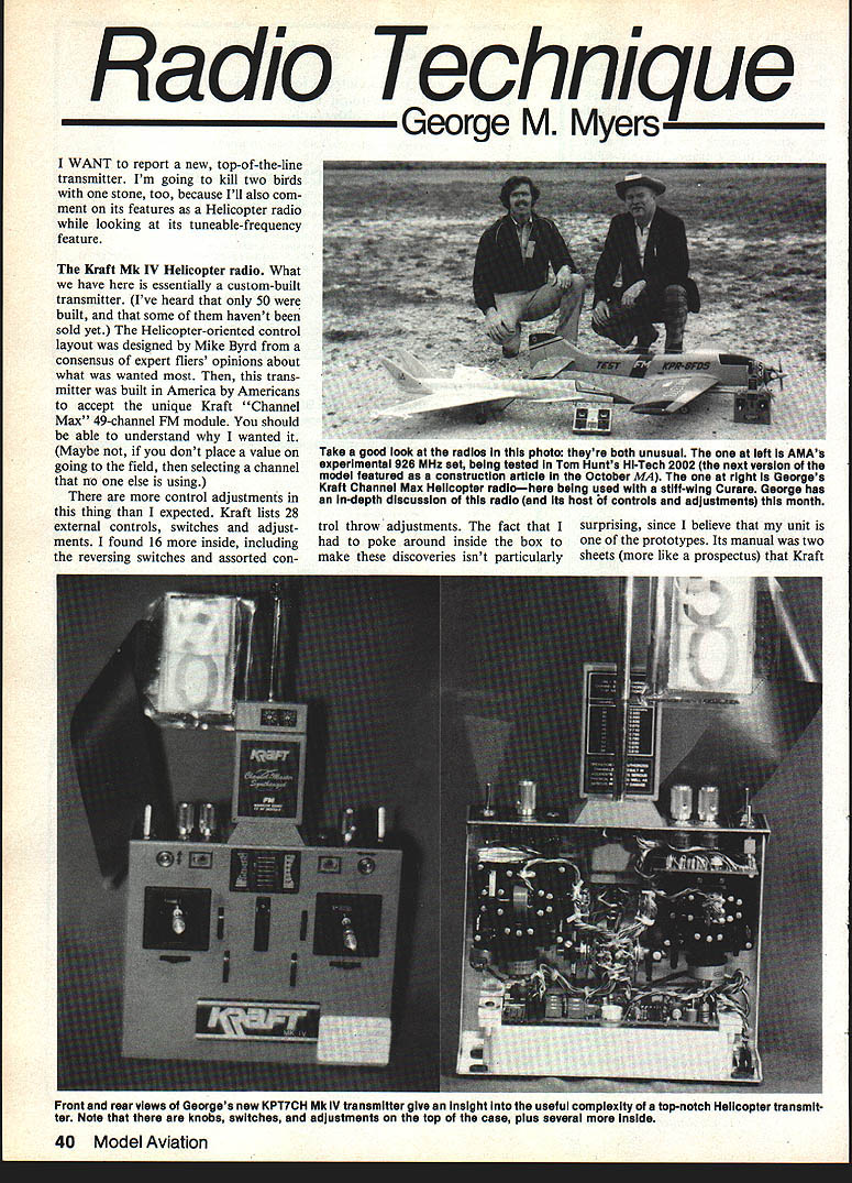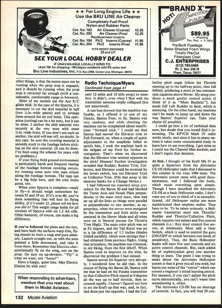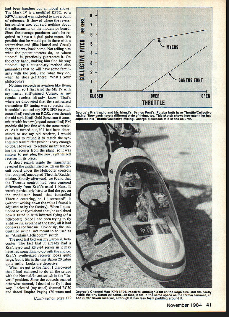 Radio Technique George M Myers WANT report new top-of-the-line transmitter Im going kill two birds stone too because Ill also com ment its features Helicopter radio looking its tuneable-frequency feature Kraft Mk IV Helicopter radio What have essentially custom-built transmitter Ive heard 50 built some havent sold yet Helicopter-oriented control layout designed Mike Byrd consensus expert fliers opinions about what wanted trans mitter built America Americans accept unique Kraft Channel Max 49-channel FM module should able understand wanted Maybe dont place value going field selecting channel no else using control adjustments thing expected Kraft lists 28 external controls switches adjust ments found 16 inside including reversing switches assorted control throw adjustments fact poke around inside box make discoveries isnt particularly surprising since believe unit prototypes Its manual two sheets like prospectus Kraft 40 Model Aviation Take good look radios photo theyre both unusual left AMAS experimental 926 MHz set being tested Tom Hunts Hi-Tech 2002 next version modei featured construction articie October MA right Georges Kraft Channei Max Heiicopter radiohere being used stiff-wing Curare George has in-depth discussion radio its host controis adjustments month Front rear views Georges new KPT7CH Mk IV transmitter give insight useful complexity top-notch HelIcopter transmit ter Note knobs switches adjustments top case plus several inside handing out model shows Mark IV modified KP7C KP7C manual included give point reference showed revers ing switches said nothing about adjustments modulator board Since average purchaser cant re quired have digital pulse meter its possible would get screwdriver like Hansel Gretel forget way back home telling him what potentiometers home practically guarantees other hand making him find way home cut-and-try method also guarantees will have some famili arity pots what does get Whats philosophy Nothing succeeds aviation like flying thing first tried Mk IV trusty stiff-winged Curare regular readers already know Thats discovered synthesized transmitter RF tuning precise couldnt control KPR-8FD crystal controlled receiver RC52 though old-style Kraft Gold Spectrum 6 trans mitter its new crystal-controlled FM module did just fine same receiv er As turned out deter mined use old receiver would have retune match syn thesized transmitter easy enough However retune meant remov ing receiver plane simpler just plug new synthesized receiver its place short search inside transmitter revealed unidentified switch cir cuit board under Helicopter controls coupled/uncoupled Throttle/Rudder mixing Shortly afterward found Throttle control centered differently Krafts usual 1 4Oms wasnt particularly hard find pot modulator board controlled Throttle centering corrected writing down value found adjusted factory ques tioned Mike Byrd about explained fitted inverted flying helicopter Since trying fly stiff-wing airplane time done confuse Obviously uni dentified switch isnt meant used Airplane/Helicopter switch next test bed Baron 20 heli copter fact already Kraft gyro KPS-24 servos may have something choice Krafts synthesized receiver looks quite large fits tiny Baron 20 cabin quite easily Looks deceptive got field discovered managed setups Normal/Invert switch vert position Since controls seemed otherwise normal decided fly way selected usual channel RC5O dared Empire Paging 75 watts Continued page 132 November 1984 41 8 25 EM 3 EM SANTOS FONT 1 U CLOSED ROPEN THROTTLE Georges Kraft radio friends Santos Fonts Futaba both have ThrottielCoiiective mixing have different styie flying too sketch shows flier has adjusted ThrottlelColictive mixing George discusses coiumn Georges Channel Max KPR-SFDS receiver although bit large size still fits neatly inside tiny Baron 20 cabinin fact fits same space former tennant Ace Silver Seven receiver although has less foam padding around other things motor must running prop stop engaged should running prop stop retracted far enough con siderable comfortable range between Most models use Ace R/G glider skid case Spectra necessary cut skid material half two Y4-in-wide pieces arrange around air exit holes oper ation cutting can bit testy can done anchor skid material very securely very nose some /2-in-wide brass dont use such anchor skid will tear off no doubt case sure covering material securely stuck fuselage before stick ing skid material can done Ive using scheme years no problems flying field ground environment particularly harsh frequent tearing fuselage bottom covering occurs try running some auto trim tape stripes along fuselage bottom tape can big help trim looks good too Spectra completeready flyit should weigh somewhere tween 35 39 oz its over 40 youve done something will hurt its flying ability its under 35 please tell did weight range holds versions Spectra six 12 Ah cells Other batteries course can make big difference youve followed plans text have built surfaces warp-free fly ing should both snap pure pleas ure Launch straight out nose pointed little downward take Remember Electrics char acteristically fly wing prop Go easy up-elevator Fly what want horse Have happy quiet time May Electric Elation * * Long Engine Life * * Use BRU LINE Air Cleaner Completely Fuel Proof Nylon Rubber Parts Cat No 102 Air Cleaner Coarse Cat No 202 Air Cleaner Fine Replacement Inserts Cat No 104 Pkl2 Inserts Coarse Cat No 204 PkJ2 Inserts Fine $225 $225 $195 $195 Radio TechniquslMyor Continued page 41 12 miles 10 kHz away inter fere didnt flew transmitter antenna totally collapsed unscrewed test hop showed machine flyable offered friends Santos Font fly Santos very cautious checking machine out complained about insuffi cient forward stick could see Santos moved Elevator trim Full Forward couple quick adjustments snaplinks failed satisfy him took machine back tailgate Ford further vestigation Thats discovered Elevator trim worked opposite stick Hmmm Further inve