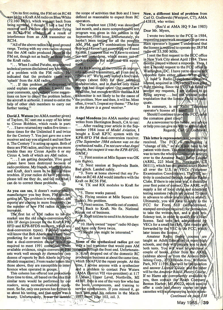cRdio SOME ANSWERS begin letter Mark Scheda Rochester NY Mr George M Myers AMA Dist #2 Frequency Coordi Dear Mr Myer noteyour attenti situation whicWyou might take est During May June experienced severe interference problems three different occasions using RC44 western NY flying brandnew seven-channel Airtronics Champion ship Series FM transmitter receiver Heres description incidents 1 Flying Grand Island about five miles north Buffalo Severe interference produced crash time convinced interference plane new yet trimmed 2 & 3 Flying Niagara Falls about 15 miles north Buffalo Two sets inter ferencesno crashes 4 Flying Barker about 45 miles northeast Buffalo No interferences After 3 pulled entire system aircraft returned Airtronics did complete check found nothing wrong changed system RC4O note returned radio asking TV4 transmitter Buffalo answer yes note explained TV4 can interfere Airtronics receiver RC44 Since change RC 40 have single problem summer fall 1984 probab ly 10 hours flight time folks Airtronics extremely helpful courteous times both speaking phone written corres nde east com f note oth problIf anio onpart Recheda Fir requires specia edd AMA its official journalI Aviation exist give AMA meopportunity ha wiat tby vase o was created &servis 38 ModeI Aviation Technique rmation e TR 0 used scoring 1983 hays Soaringd continuous op Le ndon threea location adjacent im area aw no evidence re d interference witacknow th 4 Likportabled co ercial ii interfe w C e n d t vi o cassette reco ers ha atAirt oni s abl cou eo s epo ntialto n tingint nd helpful / f enc wi esse y situa reaso TV4 inte wi man tion di t Interference channels th t C rece h pens absolu ly pr table ope te n superhetrodyneen listed few ossib principle rhetrodyne radio oper- ference combinations m col s ates mixing two radio frequencies to- May Juuie 1983 got gether can extract information mail decided lay back d sums differences TV4 sound let nature take its course has FM centered 714 MHz deviating Dual-conversion receivers sh uld n t 10075MHz normal operation have problem TV4 pr blem RC receiver receives TV4 peculiar old-style single-co ersio sound carrier high enough level TV4 superhetrodyne receiver tha ses 455 sound can intermodulate receiv- kHz IF amplifier du rsion ers local oscillator transmissions receivers might have similar oble other RC transmitters way other TV channels Please n te said produces detectable interference might have problems use monitor often hear case doubt turn receiver pulse-modulated TV4 sound track first watch whil e what some RC channel RC happenswhich should no n smitter operating vicinity monitor have demonstrated Next Peter Jacobitz 14113 several clubs using either Airtronics East Boston MA writes monitor others like Lange converter What really frightening about am two-year no RC ask operating RC FM transmit- questions find en ne ter usually AC channel dWferent doesnt know answer hey ge rally being intetfered have say Dont worry abou wh example used Tower Gold 500 re mean dont kn urn transmitter AM RC4O demonstrate TV4 sound FM Or/Wh 72400 ha Tower Gold 500 ystem MHz Airtronics Scanner AM RC48 turn pow RX hadnt noticed RC44 could interfere TX th ervos buzz hatter itself apparently others have twitch Standin feet aw TX As Mark Scheda has correctly observed antenna fully exte ed ru ing hands effect strongest fly close over case ortappi auses avariety TV transmitter less 20 miles awi drops off insignificance greater distances like 45 miles i e s t 1 e e Marks experience have also observe sfl loose insi e interference effect stronger whe r dti1i e eable cryst operating TV set vicini e h somethin within 20 feet tuned TV4 T due fact operating supe tight Faili hetrodyne receiver like TV radiat broken b t something its local oscillator wa before y its antenna observe effect whe th folks try tune two pocket AM radios ow t w same station whistle make i t o u c deduce someone operates TV ourself ed sugges s receiver vehicle flying field send b camper instance might produce interference situation other- A 8 s wise free glitches ton writes .. h tw Personal computers operating h both Futaba is se -c n field have same potential mak JC48 FM othe T n 0 glitches although must report th 1AM Ietsco ir-this 120 &ofl its first outing FM set RC48 Kraft AM radio Blue/White 72160~Jz wagjt back beings Ithough7Ih bad FM receivuntfl7llow c b ember flying RC#M lt interference K1 transmitter RC54 above radios hl good around range Testing own AM radio producec FM set though Kraft radio called Futaba apis technical person disclaimed problem FM radi indicated probable splash AM ra .. could explain sc commentsme tions to problem aircraft airborne 1 intend enlist tne help other club members carry out further testing David J Watson no AMA number given Taylors SC sent copy letter Circus Hobbies reads part . have returned radios five times three times Unlimited 8 twice Century 7 just gave new receiver say aligned test flew Century 7 acting up again Both FM radios give trouble Circus Apollo 6 Circus 4 both A4 radios .. am getting desper\te Five good planes have destroyed becaus radio problems fri dsw uba Kraft dont seem i th se troubles radios p lei4s please tell t m ha can correct proble . scope activities Bob haveNow different kind problem defined reasonable expect RCCarl G Godlewski Westport CT AMA operators43818 writes simplest test 31M desc ecd AMA HQ 9 Jan 1985 last month comprehe e tes Dear Mr Myers program given mn September 984 issue ortunately e e two letters FC ha/ent een tes pos le requestin aprw 4M combinations use am operators lic ] aven need license ired operate avetoextend ra53300 MHz - I sent first request the] about April 1 onths p ed respor miii u e i rs nt co requesttotheFC edflr smitter 1 can n DC have yet toi e e te e afewtr fr m eithe about 600 f eir dio atpteristics jn f dli ns acquired 1 illegal s rs Ouflu t t ning Since ow tha M 5 er requests imitter likely cause ing anay. bu - problem Now will Most