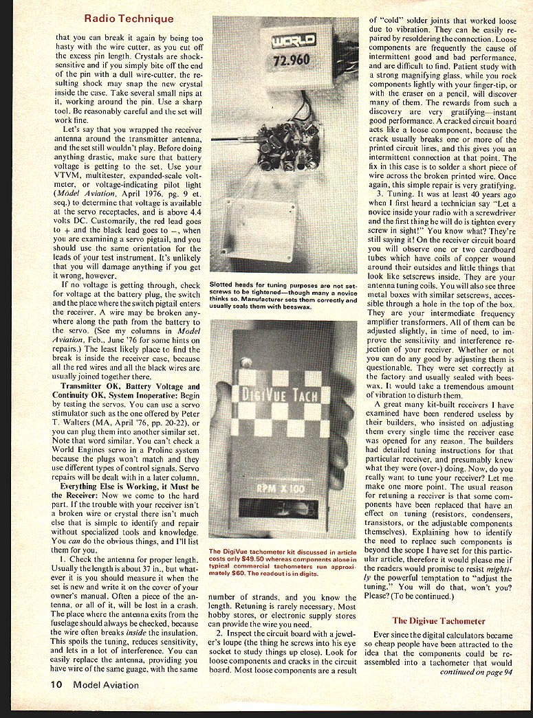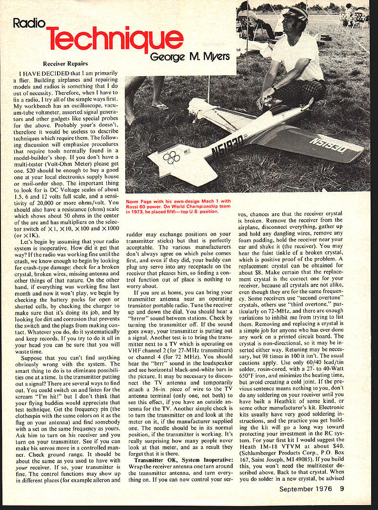 Technique George NI Myers Receiver Repairs HAVE DECIDED am primarily flier Building airplanes repairing models radios something out necessity Therefore have fix radio try simple ways first workbench has oscilloscope vacu um-tube voltmeter assorted signal genera tors other gadgets like special probes above Probably yours doesnt therefore would useless describe techniques require follow ing discussion will emphasize procedures require tools normally found model-builders shop dont have multi-tester Volt-Ohm Meter please get $20 should enough buy good local electronics supply house mail-order shop important thing look DC Voltage scales about 15 6 12 volts full scale sensi tivity 20000 ohms/volt should also have resistance ohms scale shows about 50 ohms center arc has multipliers selec tor switch Xl X 10 X 100 X 1000 XlK Lets begin assuming radio system inoperative did get way radio working fine until crash know enough begin looking crash-type damage check broken crystal broken wires missing antenna other things nature other hand everything working fine last month now wont play begin checking battery packs open shorted cells checking charger make sure its doing its job looking dirt corrosion prevents switch plugs making con tact Whatever do systematically keep records try head can sure will waste time Suppose cant find anything obviously wrong system smart thing to eliminate possibili ties time transmitter putting out signal several ways find out could switch listen scream Im hit dont think flying buddies would appreciate test technique Get frequency pin clothespin same colors flag antenna find somebody set same frequency yours Ask him turn receiver turn transmitter See can make servos move controlled man ner Check ground range should about same used have receiver transmitter fine control functions may show up different places example aileron Norm Page owndesign Mach 1 Rossi 60 power World Championship team 1973 placed fifthtop us position rudder may exchange positions transmitter sticks perfectly acceptable various manufacturers dont always agree pulse comes first did buddy can plug servo receptacle receiver pleases him finding con trol function out place nothing worry about home can bring transmitter antenna near operating transistor portable radio Tune receiver up down dial should hear brrrrr sound between stations Check turning transmitter off sound goes away transmitter putting out signal Another test bring trans mitter next TV operating VHF channel 2 27-MHz transmitters channel 4 72 MHz should hear brrr sound loudspeaker see horizontal black-and-white bars picture may necessary discon nect TV antenna temporarily attach 36-in piece wire TV antenna terminal both see effect have outside tenna TV Another simple check tum transmitter look meter manufacturer supplied needle should its normal position transmitter working Its really surprising people never look meter result forget Transmitter OK System Inoperative Wrap receiver antenna turn around transmitter antenna turn thing can now control ser vos chances receiver crystal broken Remove receiver airplane disconnect everything gather up hold dangling wires remove foam padding hold receiver near ear shake receiver may hear faint tinkle broken crystal positive proof problem replacement crystal can obtained about $8 Make certain replace ment crystal correct receiver because crystals alike though same frequen cy Some receivers use second overtone crystals others use third overtone par ticularly 72-MHz enough variations inhibit trying list Removing replacing crystal simple job anyone has ever done work printed circuit board crystal non-directional may serted either way Retuning may neces sary 98 times 100 isnt usual cautions apply Use 60/40 lead/tin solder rosin-cored 27- 40-Watt 6500F iron minimize heating time avoid creating cold joint pre vious sentence means nothing dont soldering receiver until have built Heathkit some kind some other manufacturers kit Electronic kits usually have very good soldering structions practice get build ing kit will go long way toward protecting investment RC sys tem first kit would suggest Heath IM-18 VTVM about $40 Schlumberger Products Corp PO Box 167 Saint Joseph MI 49085 build wont need multitester de scribed above Back crystal solder new crystal advised September 1976 9 -I Radio Technique can break again being too hasty wire cutter cut off excess pin length Crystals shocksensitive simply bite off end pin dull wire-cutter re sulting shock may snap new crystal inside case Take several small nips working around pin Use sharp tool reasonably careful set will work fine Lets say wrapped receiver antenna around transmitter antenna set still wouldnt play Before doing anything drastic make sure battery voltage getting set Use VTVM multitester expanded-scale volt meter voltage-indicating pilot light Model Aviation April 1976 pg 9 et seq determine voltage available servo receptacles above 44 volts DC Customarily red lead goes k lead goes ining servo pigtail should use same orientation leads test instrument Its unlikely will damage anything get wrong however no voltage getting through check voltage battery plug switch place switch pigtail enters receiver wire may broken along path battery servo See columns Model viation Feb June 76 some hints repairs least likely place find break inside receiver case because red wires black wires usually joined together Transmitter OK Battery Voltage Continuity OK System Inoperative Begin testing servos can use servo stimulator such offered Peter T Walters MA April 76 pp 20-22 can plug another similar set Note word similar cant check World Engines servo Proline system because plugs wont match use different types control signals Servo repairs will dealt later column Everything Else Working Must Receiver Now come hard part trouble receiver isnt broken wire crystal isnt much else simple identify repair specialized tools knowledge can obvious things Ill list 1 Check antenna proper length Usua