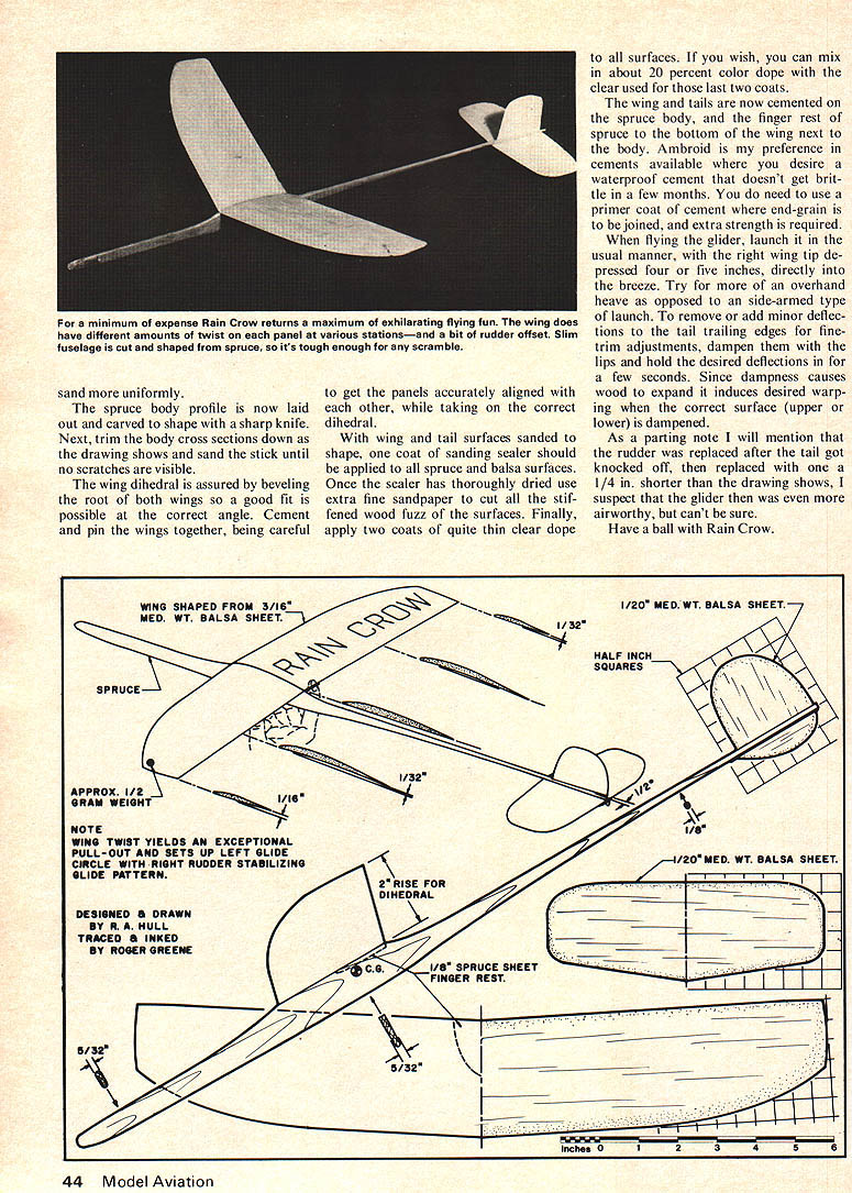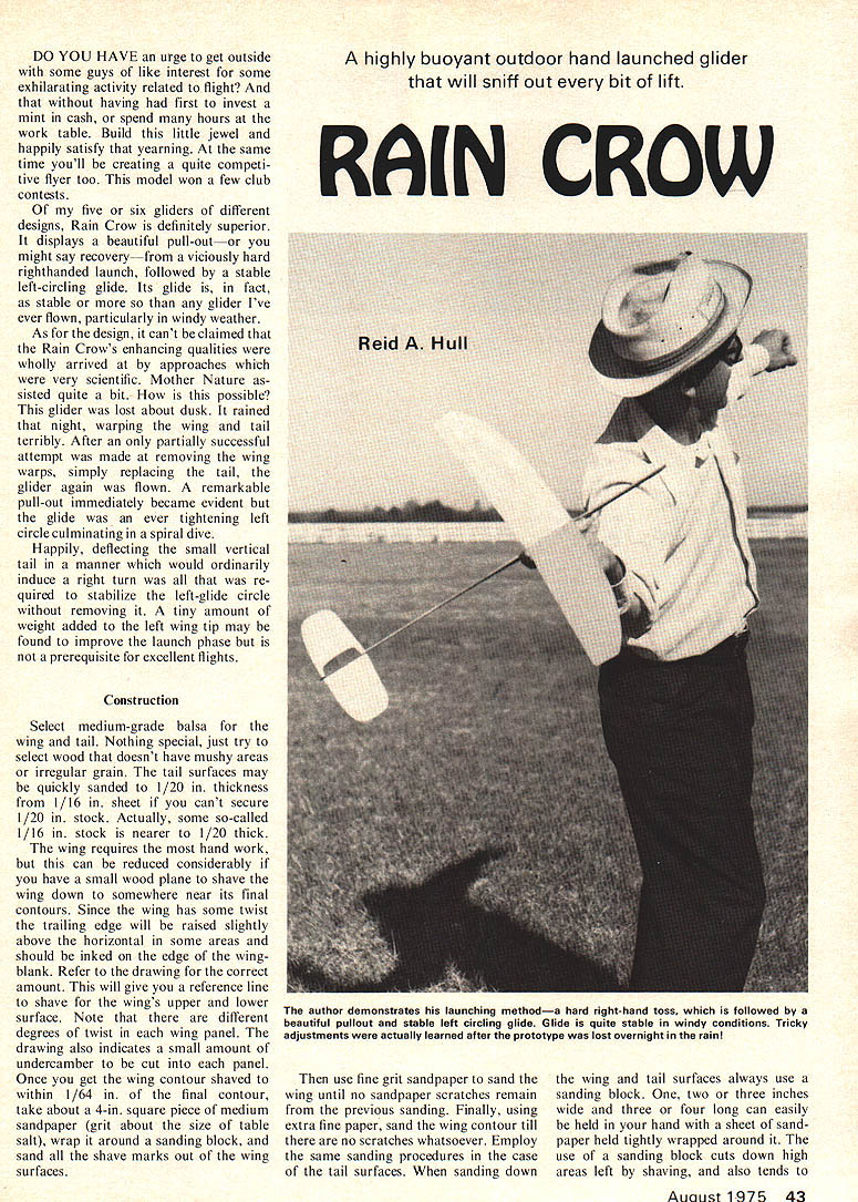 DO YOU HAVE urge get outside some guys like interest some exhilarating activity related flight having first invest mint cash spend hours work table Build little jewel happily satisfy yearning same time youll creating quite competi tive flyer too model won few club contests five six gliders different designs Rain Crow definitely superior displays beautiful pull-outor might say recovery viciously hard righthanded launch followed stable left-circling glide Its glide fact stable glider Ive ever flown particularly windy weather As design cant claimed Rain Crows enhancing qualities wholly arrived approaches very scientific Mother Nature sisted quite bit possible glider lost about dusk rained night warping wing tail terribly After partially successful attempt made removing wing warps simply replacing tail glider again flown remarkable pull-out immediately became evident glide ever tightening left circle culminating spiral dive Happily deflecting small vertical tail manner would ordinarily induce right turn was re quired stabilize left-glide circle removing tiny amount weight added left wing tip may found improve launch phase prerequisite excellent flights Construction Select medium-grade balsa wing tail Nothing special just try select wood doesnt have mushy areas irregular grain tail surfaces may quickly sanded 1/20 thickness 1/16 sheet cant secure 1/20 stock Actually some so-called 1/16 stock nearer 1/20 thick wing requires hand work can reduced considerably have small wood plane shave wing down somewhere near its final contours Since wing has some twist trailing edge will raised slightly above horizontal some areas should inked edge wingblank Refer drawing correct amount will give reference line shave wings upper lower surface Note different degrees twist wing panel drawing also indicates small amount undercamber cut panel Once get wing contour shaved within 1/64 final contour take about 4-in square piece medium sandpaper grit about size table salt wrap around sanding block sand shave marks out wing surfaces highly buoyant outdoor hand launched glider will sniff out bit lift RAIN CROW use fine grit sandpaper sand wing until no sandpaper scratches remain previous sanding Finally using extra fine paper sand wing contour till no scratches whatsoever Employ same sanding procedures case tail surfaces sanding down wing tail surfaces always use sanding block two three inches wide three four long can easily held hand sheet sand paper held tightly wrapped around use sanding block cuts down high areas left shaving also tends August1975 43 author demonstrates launching methoda hard right-hand toss followed beautiful pullout stable left circling glide Glide quite stable windy conditions Tricky adjustments actually learned after prototype lost overnight rain sand uniformly spruce body profile now laid out carved shape sharp knife Next trim body cross sections down drawing shows sand stick until no scratches visible wing dihedral assured beveling root both wings good fit possible correct angle Cement pin wings together being careful get panels accurately aligned other taking correct dihedral wing tail surfaces sanded shape coat sanding sealer should applied spruce balsa surfaces Once sealer has thoroughly dried use extra fine sandpaper cut stif fened wood fuzz surfaces Finally apply two coats quite thin clear dope surfaces wish can mix about 20 percent color dope clear used last two coats wing tails now cemented spruce body finger rest spruce bottom wing next body Ambroid preference cements available desire waterproof cement doesnt get brit tle few months need use primer coat cement end-grain joined extra strength required flying glider launch usual manner right wing tip de pressed four five inches directly breeze Try overhand heave opposed side-armed type launch remove add minor deflec tions tail trailing edges finetrim adjustments dampen lips hold desired deflections few seconds Since dampness causes wood expand induces desired warp ing correct surface upper lower dampened As parting note will mention rudder replaced after tail got knocked off replaced 1/4 shorter drawing shows suspect glider airworthy cant sure Have ball Rain Crow WING SHAPED FROM 3/16..1/20 MED WT BALSA SHEET 32 HALF INCH SQUARES APPROX I/I NOTE WING TWIST YIELDS AM EXCEPTIONAL PULL-OUT AND SETS UP LEFT GLIDE CIRCLE WITH RIGHT RUDDER STABILIZING/20 MED WT BALSA SHEET GLIDE PATTERN DESIGNED S DRAWN_______ BY N HULL TRACED S INKED_______________ BY ROGER GREENE_______ CG1/6 SPRUCE SHEET 5/32 8/32________________ InchesO123456 44 Model Aviation minimum expense Rain LrOw returns maximum exhilarating flying fun wing does have different amounts twist panel various stationsand bit rudder offset Slim fuselage cut shaped spruce its tough enough scramble