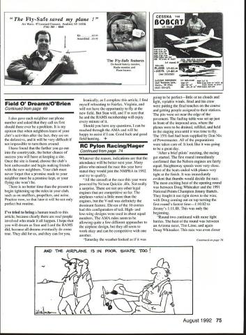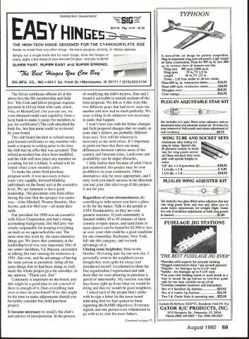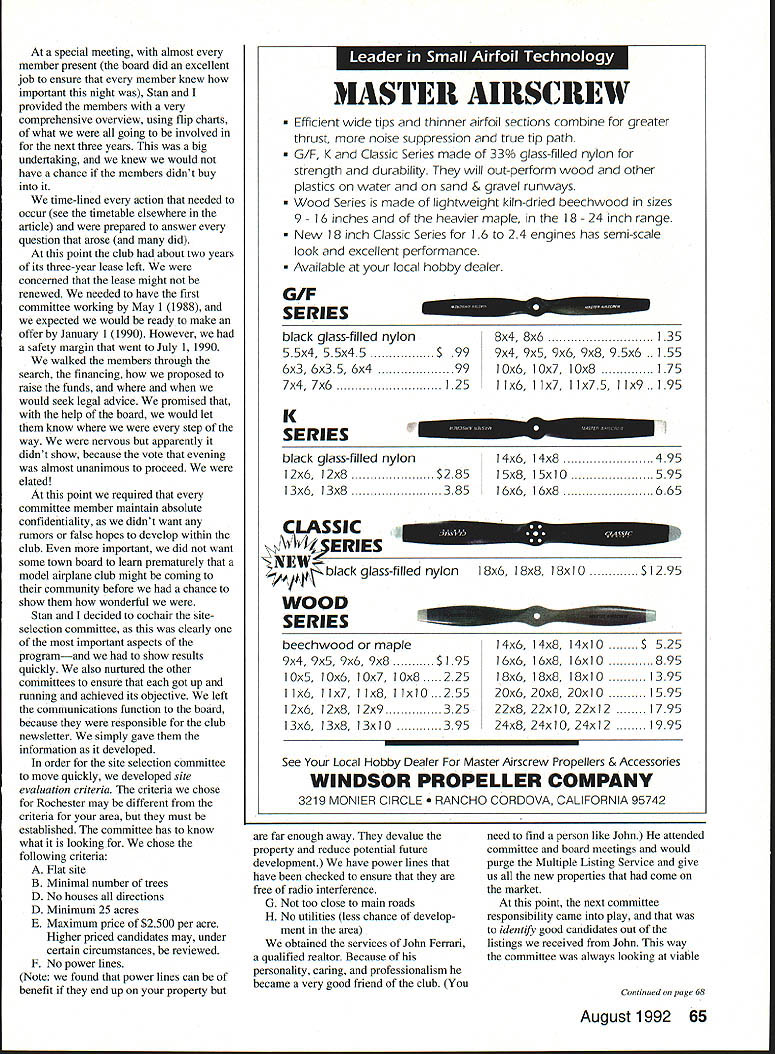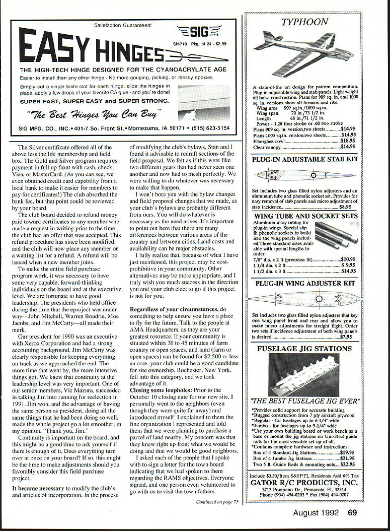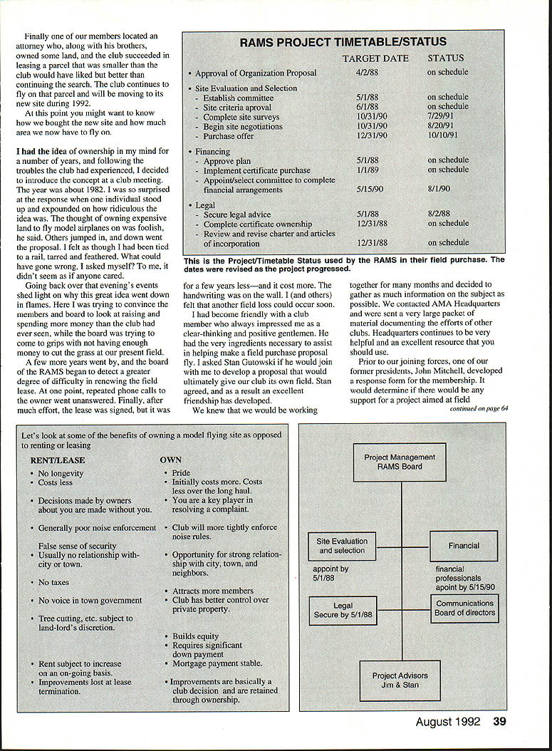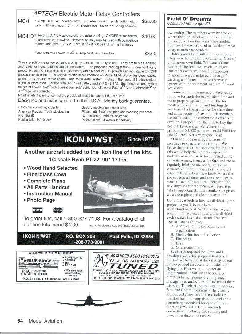 The RAMS airpark east urn urnuuniwu PUIL us inure s pienty OT room tor parking big contest scheduled Note power unus running ciagonally across left edge distance isolated homes SO MANY us belong model club have experienced trauma associated loss flying site know too well can result very long frustrating search locate new Very few clubs country make effort reduce chances happening clubs taking bold steps toward protecting interests members same time casting benchmark protecting hobby large Think about nothing now someone else will determine clubs destiny later So nothing now December issue MA read very interesting timely article story dreamer Joe Beshar efforts resulted development Bergen County Model Aerodrome New Jersey call Joe dreamer out disrespect because too believe power dream possession thing item achievement whatever enjoy today began somewhere dream Edison Bell Goddard Lindbergh NASA dreamed because dreams came true have benefitted Joe realized something done preserve enjoyment flying RC New Jersey ensure coming up ranks would also able pursue enjoy hobby future 38 Model Aviation What have just read nutshell sums up purpose article several ways reduce chances losing place fly am going take through procedures necessary own own flying site tell progressive club succeeded accomplishing just Before begin its necessary point out no guarantees life know Nothing forever owning own field can place club rather unique position can beneficial also very long-term also important note politics community unique different some communities governmental assistance may possible club does fit requirements own site county may good alternative Well talk about requirements later came Rochester New York early seventies too long after joined two clubs area called Rochester Aero Modeling Society RAMS nice field renting club made up approximately 60 members flew few years until about 1976 day entrance road blocked sign placed owner said Field closed no flying permitted shocked However shock soon wore off committee appointed quickly locate another field Three years slipped past peppered series successes failures membership dropped 18 things looking very good uctoer iu ii tne real estate closing HAMS new flying field L attorney RC Pattern pilot Ed Braiman RAMS President McCarty RAMS Treasurer John Anderson attorney seller author Finally members located attorney along brothers owned some land club succeeded leasing parcel smaller club would have liked better continuing search club continues fly parcel will moving its new site during 1992 point might want know bought new site much area now have fly idea ownership mind number years following troubles club experienced decided introduce concept club meeting year about 1982 surprised response individual stood up expounded ridiculous idea thought owning expensive land fly model airplanes foolish said Others jumped down went proposal felt though tied rail tarred feathered What could have gone wrong asked myself didnt seem anyone cared Going back over evenings events shed light great idea went down flames trying convince members board look raising spending money club ever seen board trying come grips having enough money cut grass present field few years went board RAMS began detect greater degree difficulty renewing field lease point repeated phone calls owner went unanswered Finally after much effort lease signed few years lessand cost handwriting wall others felt another field loss could occur soon become friendly club member always impressed clear-thinking positive gentlemen very ingredients necessary assist helping make field purchase proposal fly asked Stan Gutowski would join develop proposal would ultimately give club its own field Stan agreed result excellent friendship has developed knew would working together months decided gather much information subject possible contacted AMA Headquarters sent very large packet material documenting efforts other clubs Headquarters continues very helpful excellent resource should use Prior joining forces former presidents John Mitchell developed response form membership would determine would support project aimed field continued page 64 August1992 39 Project/Timetable Status used s revised project progressed APTECH Electric Motor Relay Controllers MO-i1 Amp BEC 45 V auto-cutoff propeller braking push button start switch 30 Amp fuse 10 x 17 circuit board 15 oz mci wiring harness $2500 MC-HD 1 Amp BEG 45 V auto-cutoff propeller braking ON/OFF motor control $4000 push button start switch Heavy duty relay may used competition motors unfused 17 x 23 circuit board 20 oz mci wiring harness Extra sets 4 Power Pol3O Amp Modular connectors $300 precision engineered units highly reliable easy use fully assembled ready flight include connectors propeller braking feature ideal folding props Model MO-i requires no adjustments Model MC-HD provides adjustable ON/OFF throttle stick threshold digital throttle servo interface Model MC-HD provides dependable glitch-free ON/OFF motor control its fail-safe system shuts off motor transmitter signal interrupted use 6 7 cell battery packs 72 84 V Both models come 0 full set Power Pole high current connectors choice Futaba G J Airtronics JRreceiver connector No other electric motor controllers provide features prices Designed manufactured USA Money back guarantee Send check money order American Precision Technologies Inc PO Box 53 Nutting Lake MA 01865 Wood Hand Selected Fiberglass Cowl Complete Plans Parts Handcut Instruction Manual Photo Page Specify receiver connector type Please add $400 shipping handling per order NJ residents Add 7% sales tax Please allow 2-4 weeks delivery order kits call 1-800-327-7198 catalog fine kits send $400 Idaho Residents Add 5% State Sales Tax WOODWORKING MACHINERY POWERMATICADVANCED AERO PRODUCTS eSAKuRAYS & OS SURPASS 120 ARTISANWJV -3538a also haveEXHAUST SYSTEMS FOR FRTTERN AIRCRAFT AND ULTIMATE BIFE $100woodworking ICONE COUPLERS AND TNL PIPES ALSO AVAILABLE 