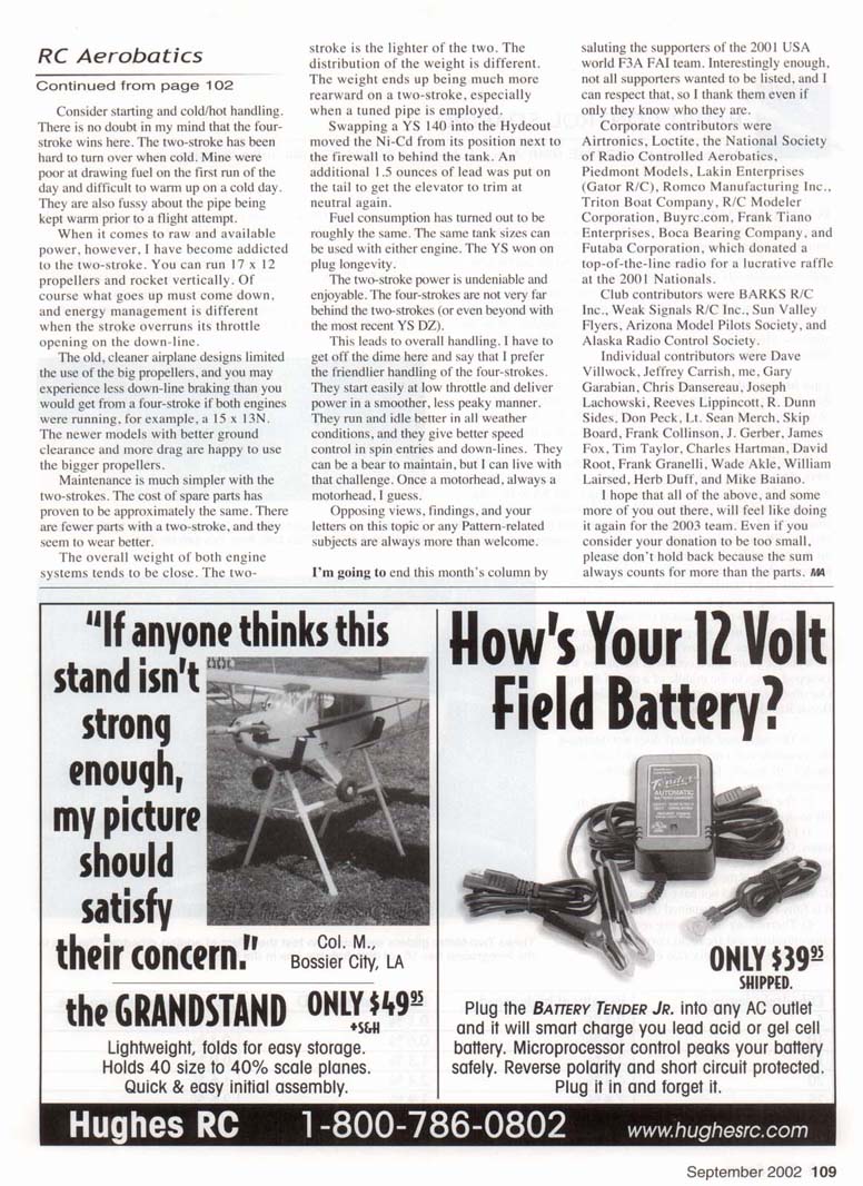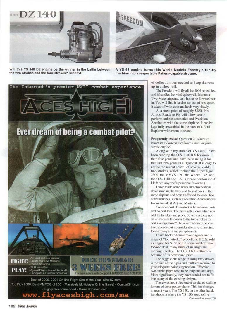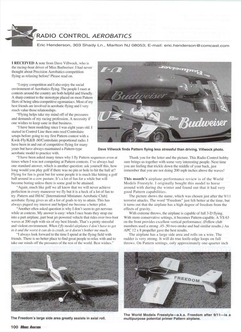 I RECEIVED A note from Dave Villwock, who is the racing-boat driver of Miss Budweiser. I had never thought about Precision Aerobatics-competition flying as relaxing before! Please read on. "I enjoy competition and I also enjoy the social environment of Aerobatics flying. The people I meet at contests around the country are both helpful and friendly. A sharp contrast to the stereotype placed on most Pattern fliers of being ultra-competitive egomaniacs. Most of my best friends are involved in aerobatic flying and I very much value those relationships. "Flying helps take my mind off of the pressures and demands of my racing profession. A necessity if one wishes to keep sane in that business. "I have been modeling since I was eight years old. I started in Control Line then onto reed Controlaire setups before going to my first Pattern contest with a Kwik-Fly/K&B .60/Controlaire proportional radio. I have been in and out of competitive flying for many years but have always maintained a Pattern-type aerobatic model to practice with. "I have been asked many times why I fly Pattern sequences even at times when I was not competing at Pattern contests. I've always had one standard answer, which is another question: ask yourself this, how long would you play golf if there was no pin or hole to hit the ball at? Flying for fun is great but for some people it is much like hitting a golf ball around in a cow pasture. It's a lot of fun for a while but will become boring unless there is some goal to be attained. "Again, much like golf we all know that we will never achieve perfection in every maneuver we fly but it is a heck of a lot of fun to try. Pattern and IMAC [International Miniature Aerobatic Club] aerobatic flying gives us all a list of goals to try to attain. This has always piqued my interest and helped me become a better pilot. "Another often asked question is why I don't seem to get nervous while at contests. My answer is easy: when I race boats they strap me into a part airplane, part boat jet-powered vehicle that rides over two-foot waves at 200 mph with six of my best friends. That's a pretty stressful and violent environment. When I fly model airplanes I don't have lo get in it and the worst it can do is crash, so it doesn 't bother me much. "I always look forward to the time I spend at the flying field with friends. There is no better place to find great people to relax with and to take our minds off the pressures of the rest of the world. Best wishes." Dave Villwock finds Pattern flying less stressful than driving. Villwock photo. Thank you for the letter and the picture. This Radio Control hobby sure brings us together with some very interesting people. Next time you are feeling that trickle down the middle of your back, just remember that you are not doing 200 mph inches above the waves! This month's airplane-performance review is of the World Models Freestyle. I originally bought this model to horse around with during the winter and found out that it had very good Pattern capabilities. The picture shows the name, which was chosen just after the 9/11 terrorist attacks. The word "Freedom" just felt better at the time, but it turns out that the airplane has a high degree of freedom from the effects of gravity. With extreme throws, the airplane is capable of full 3-D flying. With more conservative settings, it becomes Pattern-capable. A YS 63 on the front provides excellent vertical performance. (Fellow club members used a strong .45-.50 two-stroke and had similar results.) An APC 12x8 propeller gave the best results. The airplane has a large side area and rolls on a wire. The rudder is very strong. It will do true knife-edge loops on full throws. On Pattern settings, only approximately one-quarter inch The Freedom's large side area greatly assists in axial roll. Will this YS 140 DZ engine be the winner in the battle between the two-strokes and the four-strokes? See text. A YS 63 engine turns this World Models Freestyle fun-fly machine into a respectable Pattern-capable airplane. of deflection was needed to keep the nose up in a slow roll. The Freedom will fly all the 2002 schedules, and it handles the wind quite well. It is not a Two-Meter airplane, so it has to be flown closer in. You will find it hard to run out of box space. It takes off with ease and lands very slowly. At a street price of roughly $ 180, this Almost Ready to Fly will allow you to perform artistic aerobatics and Precision Aerobatics with the same airplane. It can be kept fully assembled in the back of a Ford Explorer with room to spare. Frequently-Asked Question 2: Which is better in a Pattern airplane: a two- or four-stroke engine? Along with my stable of YS 140s, I have been running the O.S. 1.40 RX for more than five years and have been using it for that last two years in a Hydeout. It is easy to notice the recent arrival of several viable two-strokes, which include the SuperTigre 2300, the MVVS 1.50, the Webra 1.45, and the O.S. 1.40 and 1.60. (Please pardon me if I left out anyone's personal favorite.) I have made some notes and observations about running the two- and four-strokes in the same airplane and how it affected the execution of the routines, such as Federation Aeronautique Internationale (FAI) and Masters. Consider cost. Two-strokes have fewer parts and do cost less. The price gets closer when you add the headers and pipes. So why is there not an immediate leap over to the two-strokes for cost savings alone? I believe that many people have already put a considerable investment into four-stroke parts and paraphernalia. I have backup four-stroke engines and a range of "four-stroke" propellers. If O.S. sold its engine for $250 or did some kind of two-for-one deal, many more of us might be running it today. The O.S. 1.60 is attractive because of its power and price. The biggest challenge in using two-strokes is the size of the pipes and mufflers required to give adequate noise suppression. Effective two-str