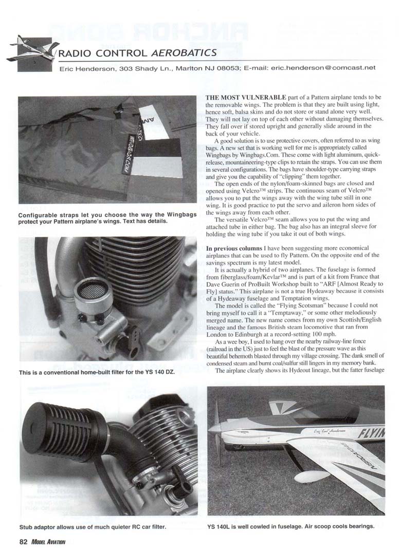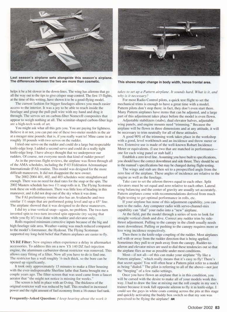 THE MOST VULNERABLE part of a Pattern airplane tends to be the removable wings. The problem is that they are built using light, hence soft, balsa skins and do not store or stand alone very well. They will not lay on top of each other without damaging themselves. They fall over if stored upright and generally slide around in the back of your vehicle. A good solution is to use protective covers, often referred to as wing bags. A new set that is working well for me is appropriately called Wingbags by Wingbags.Com. These come with light aluminum, quick-release, mountaineering-type clips to retain the straps. You can use them in several configurations. The bags have shoulder-type carrying straps and give you the capability of "clipping" them together. The open ends of the nylon/foam-skinned bags are closed and opened using Velcro™ strips. The continuous seam of Velcro™ allows you to put the wings away with the wing tube still in one wing. It is good practice to put the servo and aileron horn sides of the wings away from each other. The versatile Velcro™ seam allows you to put the wing and attached tube in either bag. The bag also has an integral sleeve for holding the wing tube if you take it out of both wings. In previous columns I have been suggesting more economical airplanes that can be used to fly Pattern. On the opposite end of the savings spectrum is my latest model. It is actually a hybrid of two airplanes. The fuselage is formed from fiberglass/foam/Kevlar™ and is part of a kit from France that Dave Guerin of ProBuilt Workshop built to "ARF [Almost Ready to Fly] status." This airplane is not a true Hydeaway because it consists of a Hydeaway fuselage and Temptation wings. The model is called the "Flying Scotsman" because I could not bring myself to call it a "Temptaway," or some other melodiously merged name. The new name comes from my own Scottish/English lineage and the famous British steam locomotive that ran from London to Edinburgh at a record-setting 100 mph. As a wee boy, I used to hang over the nearby railway-line fence (railroad in the US) just to feel the blast of the pressure wave as this beautiful behemoth blasted through my village crossing. The dank smell of condensed steam and burnt coal/sulfur still lingers in my memory bank. The airplane clearly shows its Hydeout lineage, but the fatter fuselage helps it be a bit slower in the down-lines. The wing has ailerons that go all the way out to the tips to give crisper snap control. The first 15 flights, at the time of this writing, have shown it to be a good-flying model. The current fashion for bigger fuselages allows you much easier access to the interior. It was a joy to be able to reach inside the fuselage and grasp the pull-pull wire with my hand and drag it through. The servos set on carbon-fiber Nomex® composites that appear to weigh nothing at all. The scimitar-shaped carbon-fiber legs are a high-tech work of art. You might ask what all this gets you. You are paying for lightness. Believe it or not, you can put one of these two-meter models in the air at a meager nine pounds: that is, if you really want to! Mine came in at roughly 10 pounds with two servos on the rudder. I tried one servo on the rudder and could do a large but respectable knife-edge loop. 1 added a second servo and could do a really tight knife-edge loop. I have always thought that we underpower our rudders. Of course, not everyone needs that kind of rudder power! As in the previous flight reviews, the airplane was flown through all of the AMA schedules, including the P-03 Federation Aeronautique Internationale (FAI) routine. This model was designed for the more difficult maneuvers. It did not disappoint the new owner. The 2(K)2-2(X)4 401,402. and 403 schedules were straightforward enough. There was no need for dual rates for the snap or the spin. The 2002 Masters schedule has two I '/!> snap rolls in it. The Flying Scotsman took these on with enthusiasm. There was little loss of heading in this maneuver, and it did not drop out of the sky when it was done. The FAI preliminary routine also has an Avalanche and two similar 1'/: snaps that are performed going level and up a 45° line. The airplane showed that it was designed to do these maneuvers. I did try a true vertical snap—again, no problem. The two-turn inverted spin to two-turn inverted spin opposite (try saying that while you fly it!) was done with rudder and elevator only. Rolls required minimum corrective inputs because of the big and high fuselage side area. Weather-vaning was much reduced compared to the model's forerunner, the Hydeout. The Flying Scotsman supported my long-held belief that Pattern airplanes are easier to fly. YS DZ Filter: New engines often experience a delay in aftermarket accessories. To address this on a new YS 140 DZ fuel-injection engine, the aluminum carburetor-throat restrictor was removed. This allows easy fitting of a filter. Now all you have to do is find one. The restrictor has a wall roughly '/K-inch thick, so the bore can be opened up significantly. It took only approximately 15 minutes to make a filter housing with the ever-indispensable Sherline lathe that Santa brought me a couple years ago. The filter-screen that was used came from a faucet aerator that "she might not notice is missing for weeks." The screen is held in place with an O-ring. The thickness of the original restrictor wall was reduced by half. This resulted in increased power and the right amount of fuel economy from a 16-ounce fuel tank. Frequently-Asked Question: / keep hearing cihout the work it lakes to set up a Pattern airplane. It sounds hard. What is it, and why is it necessary? For most Radio Control pilots, a quick test flight to set the mechanical trims is enough to have a great time with a model. Pattern pilots don't stop there; in fact, they don't even start there. Many Pattern airplanes have items that can be adjusted, and a large part of this adjustment takes place bef
