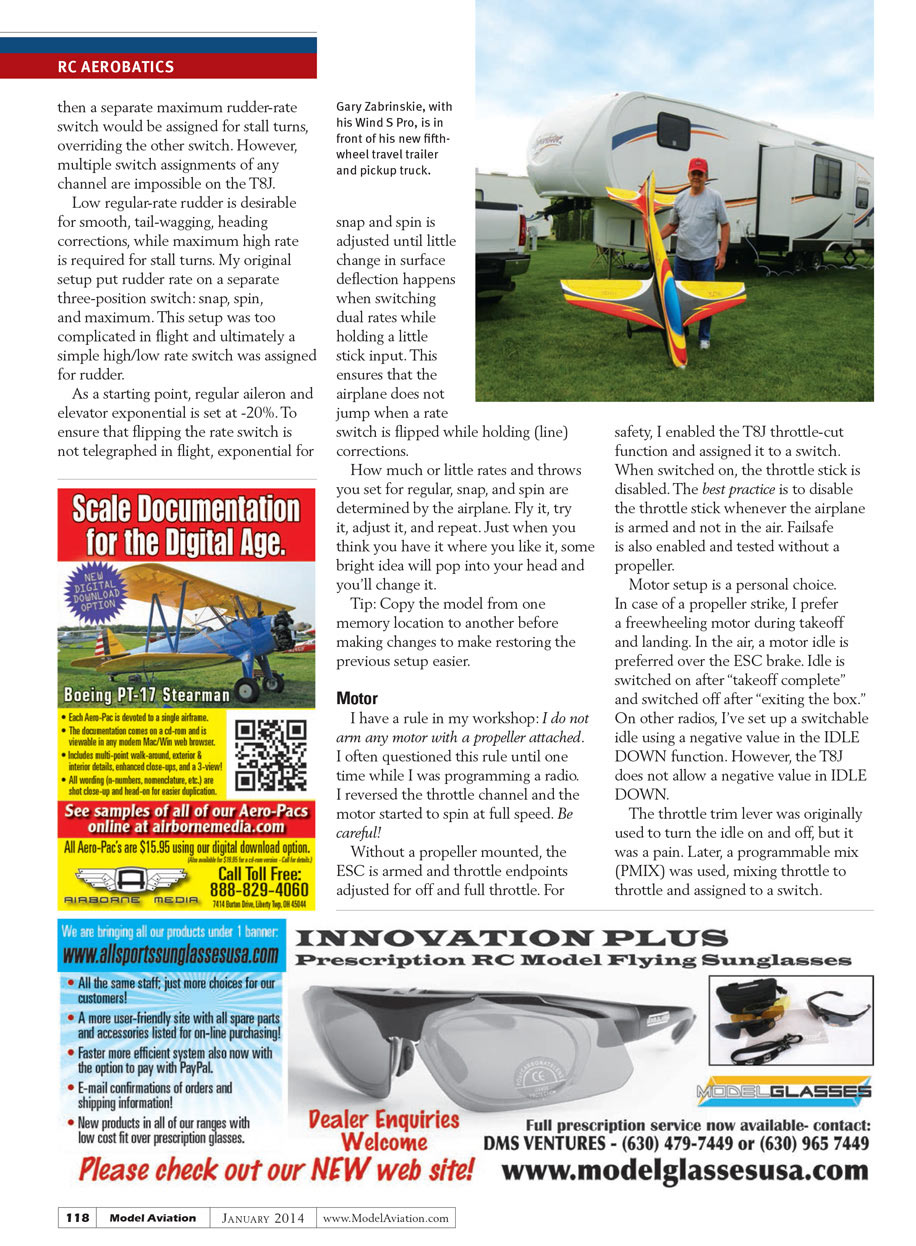 This was my first try at setting up a sport radio for Pattern use. Your radio setup may—and probably will—be different. Do not be afraid to experiment. It’s another part of our wonderful hobby.