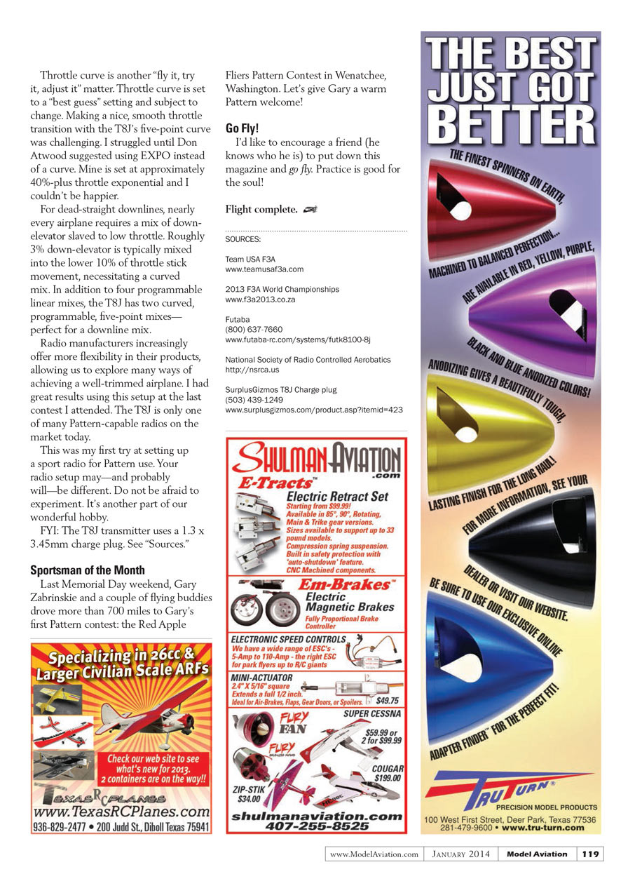Radio manufacturers increasingly offer more flexibility in their products, allowing us to explore many ways of achieving a well-trimmed airplane. I had great results using this setup at the last contest I attended. The T8J is only one of many Pattern-capable radios on the market today.
