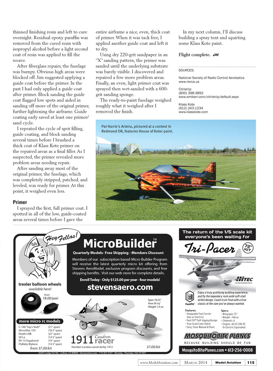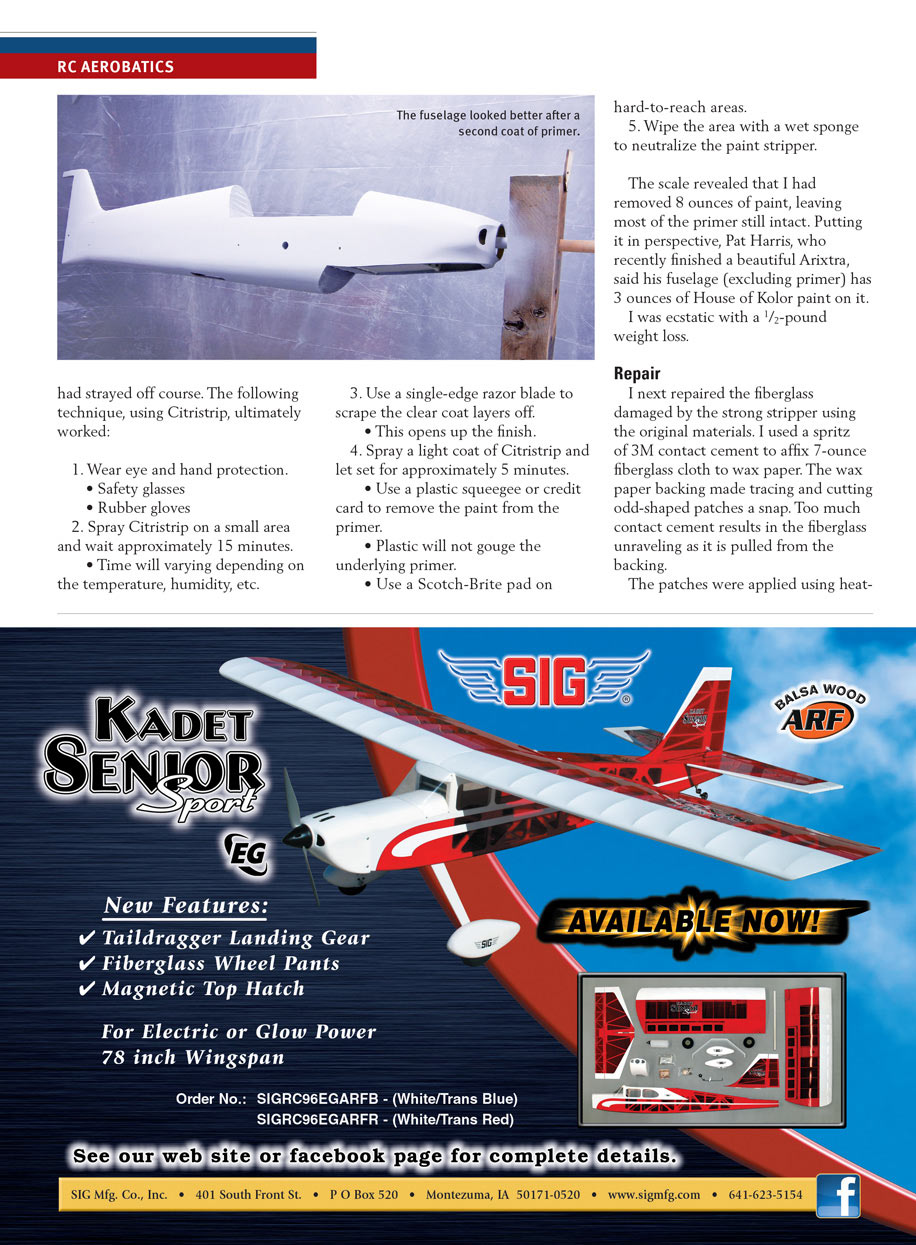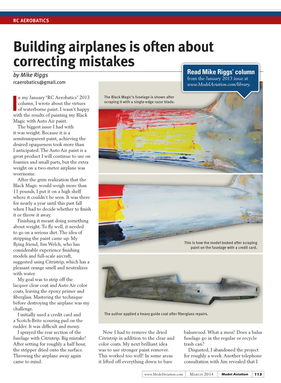 Paint stripping: In my January “RC Aerobatics” 2013 column, I wrote about the virtues of waterborne paint. I wasn’t happy with the results of painting my Black Magic with Auto Air paint.