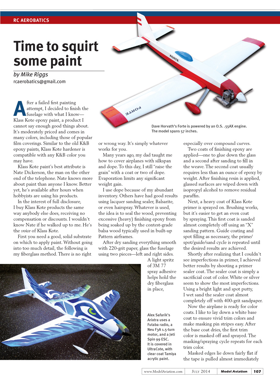 After a failed first painting attempt, I decided to finish the fuselage with what I know—Klass Kote epoxy paint, a product I cannot say enough good things about. It’s moderately priced and comes in many colors, including those of popular film coverings. Similar to the old K&B epoxy paints, Klass Kote hardener is compatible with any K&B color you may have.