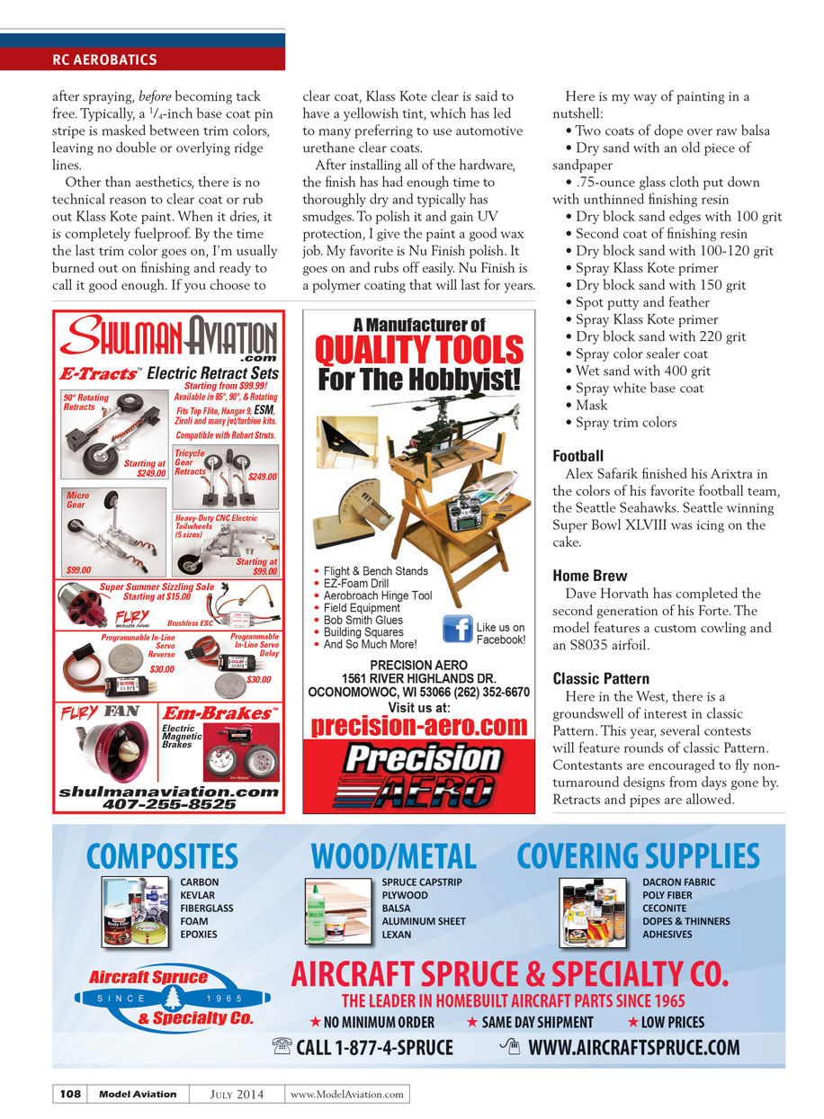 I use dope because of my abundant inventory. Others have had good results using lacquer sanding sealer, Balsarite, or even hairspray. Whatever is used, the idea is to seal the wood, preventing excessive (heavy) finishing epoxy from being soaked up by the contest-grade balsa wood typically used in built-up Pattern airframes.