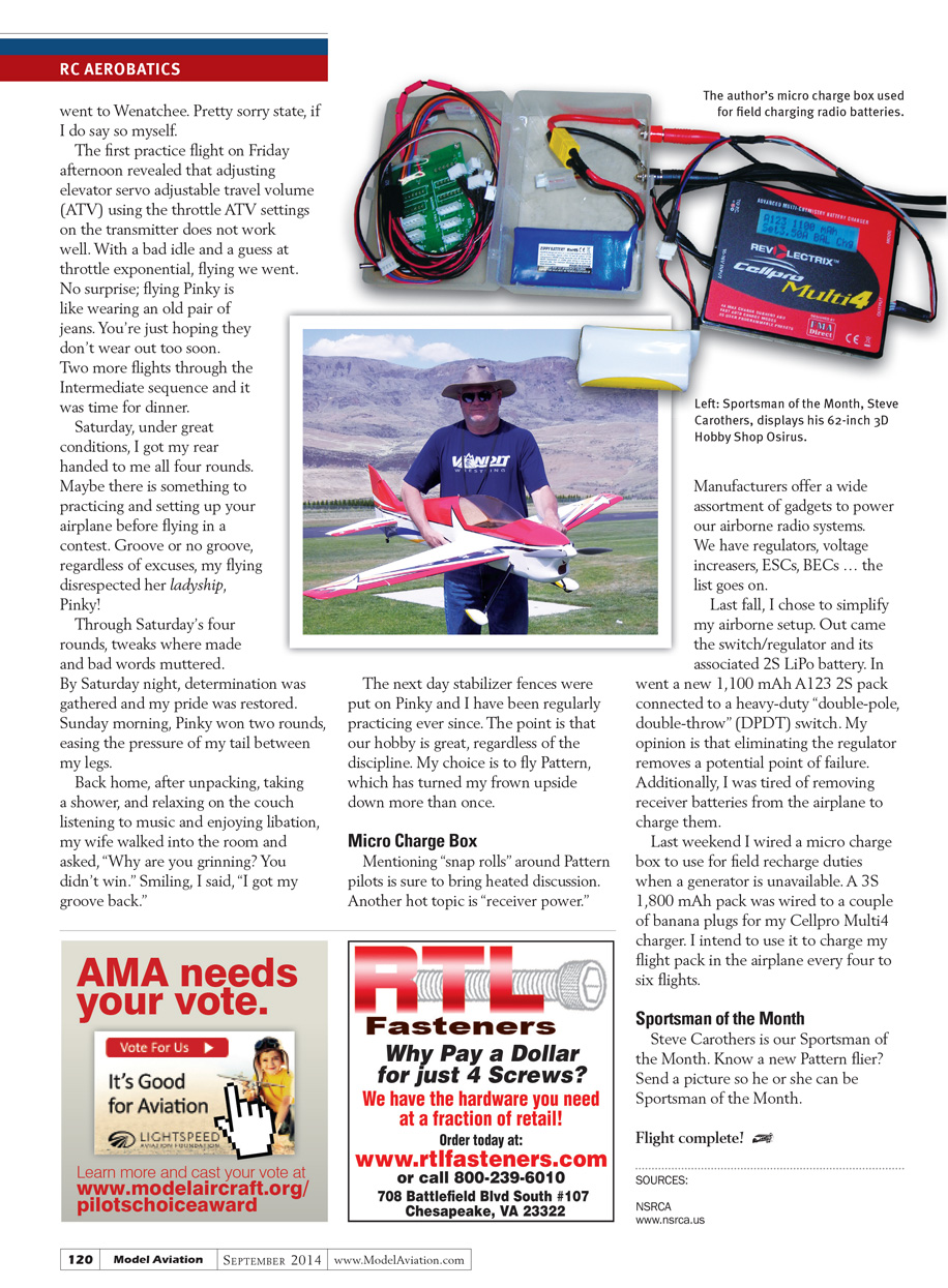 The next day stabilizer fences were put on Pinky and I have been regularly practicing ever since. The point is that our hobby is great, regardless of the discipline. My choice is to fly Pattern, which has turned my frown upside down more than once.
