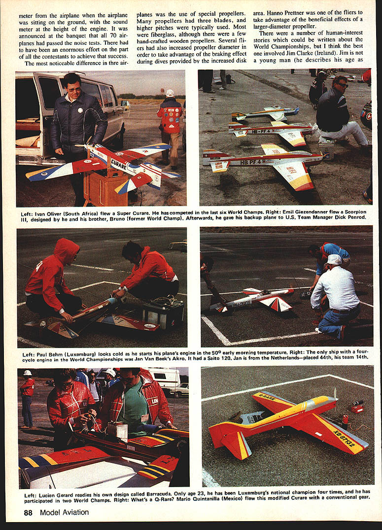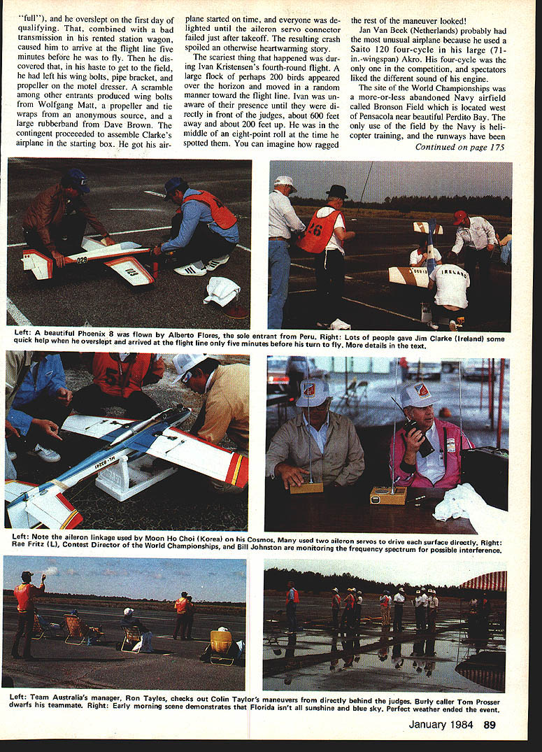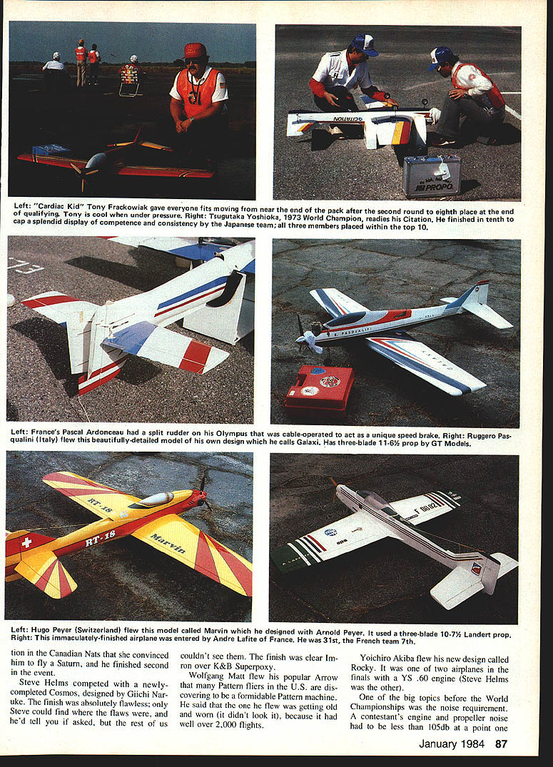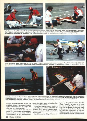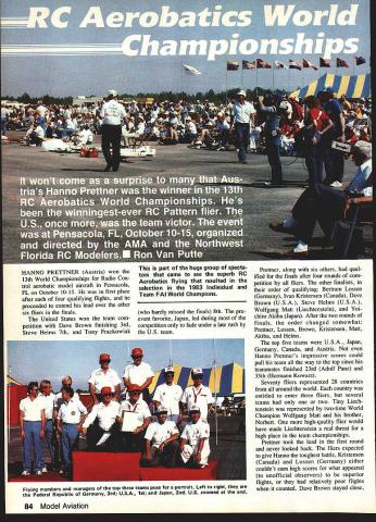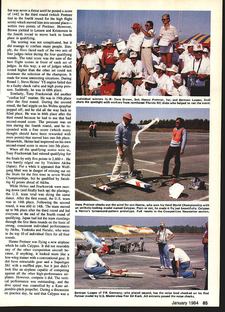 HANNO PRETTNER Austria won 13th World Championships Radio Con trol aerobatic model aircraft Pensacola FL October 10-15 first place after four qualifying flights proceeded extend lead over other six fliers finals United States won team com petition Dave Brown finishing 3rd Steve Helms 7th Tony Frackowiak C I / part huge group specta tors came see superb RC Aerobatics flying resulted selection 1983 Individual Team FAI World Champions barely missed finals 8th pre event favorite Japan led during competition fade under late rush US team H Flying members managers top three teams pose portrait Left right Federal Republic Germany 3rd USA 1st Japan 2nd US zoomed end 84 Model Aviation Prettner along six others qual ified finals after four rounds com petition fliers other finalists order qualifying Bertram Lossen Germany Ivan Kristensen Canada Dave Brown USA Steve Helms USA Wolfgang Matt Liechtenstein Yoi chiro Akiba Japan After two rounds finals order changed somewhat Prettner Lossen Brown Kristensen Matt Akiba Helms top five teams USA Japan Germany Canada Austria Hanno Prettners impressive scores could pull team way top since teammates finished 23rd Adolf Panz 35th Hermann Kowarz J Seventy fliers represented 28 countries around world country entitled enter three fliers several teams two Tiny Liech tenstein represented two-time World Champion Wolfgang Matt brother Norbert high-quality flier would have made Liechtenstein real threat high place team championships Prettner took lead first round never looked back fliers expected give Hanno toughest battle Kristensen Canada Lossen Germany either couldnt earn high scores what appeared unofficial observers superior flights relatively poor flights counted Dave Brown stayed close never threat until posted score 1442 third round Prettner tied fourth round high flight score moved him second place within two points Prettner However Brown yielded Lossen Kristensen fourth round move back fourth place qualifying scoring complicated did manage confuse people Sim ply fliers faced two sets four judges twice during four qualifying rounds total score sum best flight scores front set judges way set judges scored higher other set could dominate selection champion made some interesting situations During Round 1 Steve Helms YS engine failed due faulty check valve high pump pres sure Suddenly 68th place Similarly Tony Frackowiak did another cardiac kid routine 19th place after first round During second round fuel nipple Webra spraybar popped off slid way back 62nd place 64th place after third round because use bad second-round score pressure him during fourth round re sponded fine score thought should have rewarded points moved him 8th place Meanwhile Helms improved own second-round score move 5th place qualifying scores Tony Frackowiak missed qualifying finals five points 2600 barely edged out Yoichiro Akiba Japan appeared Wolf gang Matt danger missing out finals first time seven World Championships qualified finish ing 42 points ahead Akiba Helms Frackowiak mov ing down finally back up placings US team total doing same dance After first round US team 14th place Following second round still 14th team moved up 9th place after third round led everyone end fourth round qualifying Japan led team standings through first three rounds basis strong consistent individual performances Akiba Yoshioka Naruke top 10 individual fliers four rounds Hanno Prettner flying new airplane calls Calypso did resemble other competition aircraft because anything looked like low-wing trainer conventional gear did have retractable gear Supertigre S61 muffled pipe just didnt look like airplane capable competing against other high-performance air planes However compete did verti cal performance outstanding dive speed controlled Kato ad justable-pitch propeller During discussion practice day said Calypso January 1984 85 Individual winners L-R Dave Brown 3rd Hanno Prettner 1st Bertram Lossen 2ndl share spotlight workers northwest Florida RC clubs helped run event Hans Prettner checks out wind for-son Hanno won third World Championship unlikely-looking model named Calypso Plain made fly lust beautifully Calypso Hannos turnaround-pattern prototype Full results Competition Newsletter section Bertram Lossen FR Germany placed second has noise level checked Red Palmer model US Master-class flier Ed Keck entrants passed noise checks Left Many sidelines thought Canadas Ivan Kristensen deserved better fourth-place finish judges didnt agree Ivan flew Citation Yoshiokas design magnificently Right Dave Browns Illusion took him third place wife Sally responded Now ye got go through another two years thisl Dave has US RC Aerobatics team times always places high Left When Steve Helms engine died early Round 1 flight prompted immediate transplant details text Right Gale Helms hustles son Steves plane runway during finals competition Steve flying Cosomos design Japans Giichi Naruke Left Two-time World Champs winner Wolfgang Matt Liechtenstein showed still has touch qualifying finals seventh straight time Plane Arrow Webra Racing LS engine turning Kato variable-pitch prop Right airplane three Japanese fliers absolutely beautiful Voichiro Akibas entry named Rocky Akiba Japanese finals prototype what will fly new FAT turnaround pattern turnaround-pattern airplane will larger Calypso will look very much same other top fliers new air planes too Second-place finisher Bertram Lossen flying new design calls Red Palmer generously contoured didnt appear flat place anywhere airplane Dave Brown flew Illusion modified Tiporare less anhedral horizontal tail appears have thinner wing pipe molded bottom fuselage Ivan Kristensen flying Citation de signed Tsugutaka Yoshioka 1973 World Champion us accus tomed seeing him fly versions popular Saturn design big surprise Ivan flies Citation well beaten Dave Brown 1983 Nats airplane way wife concerned might damage Cita 86 Model Aviation Left Cardiac Kid Tony Frackowiak gave everyone fits movi
