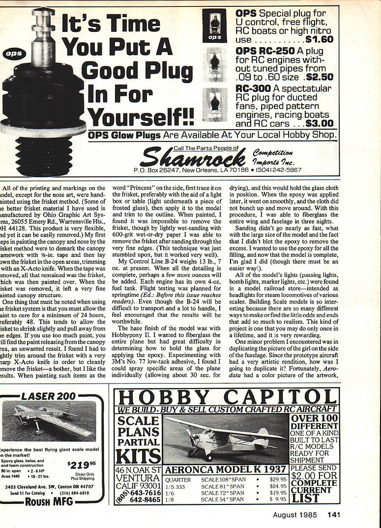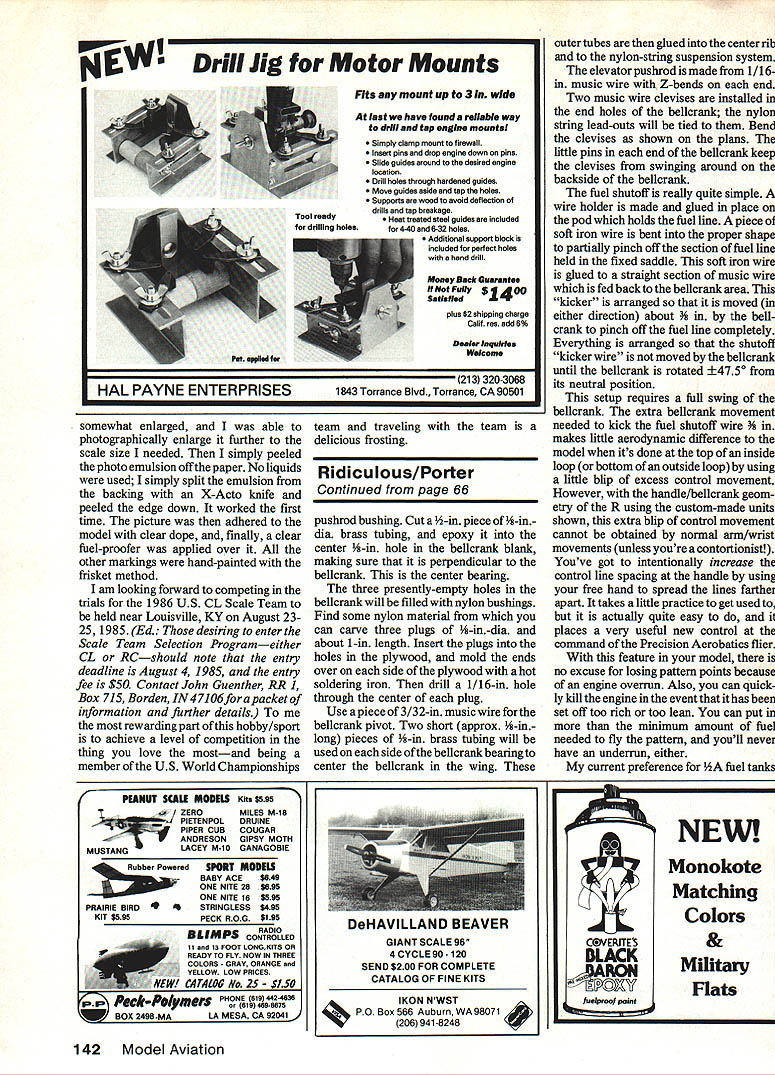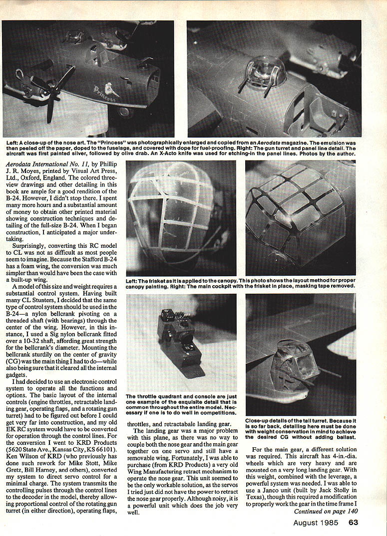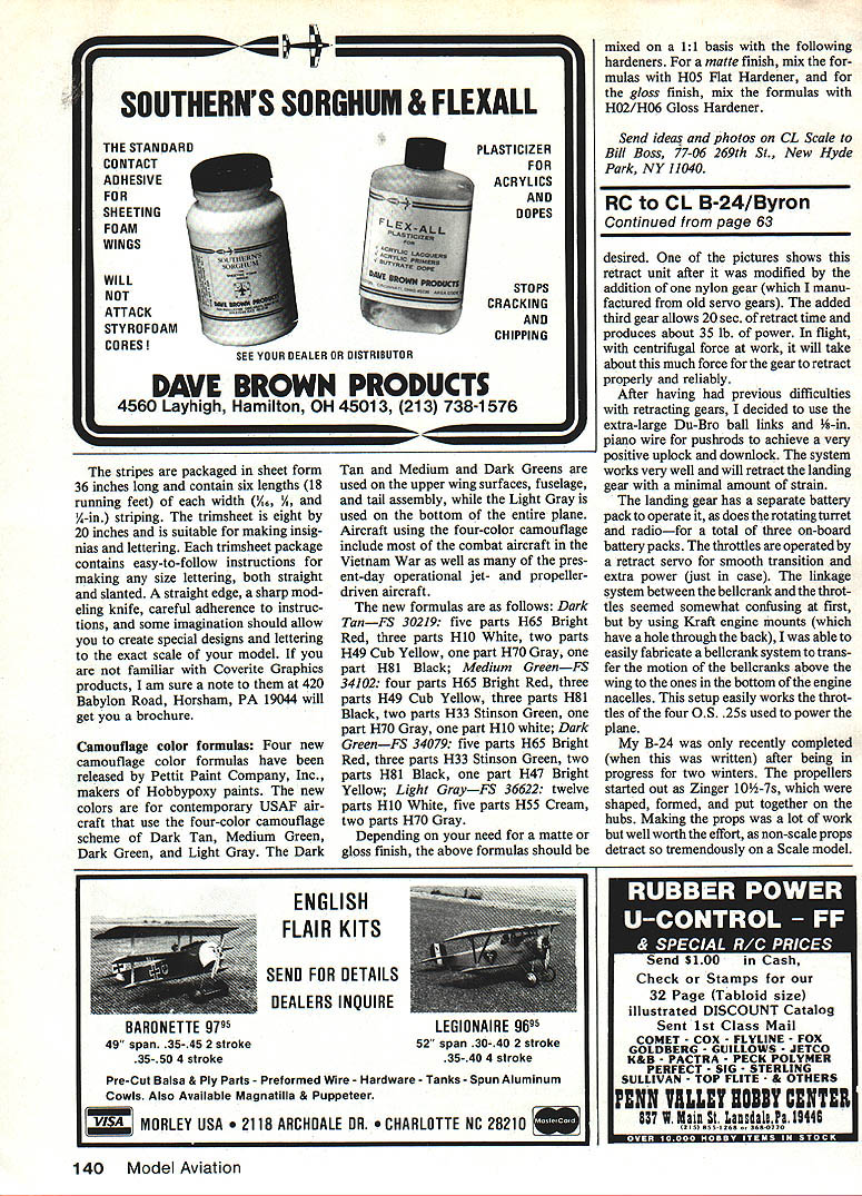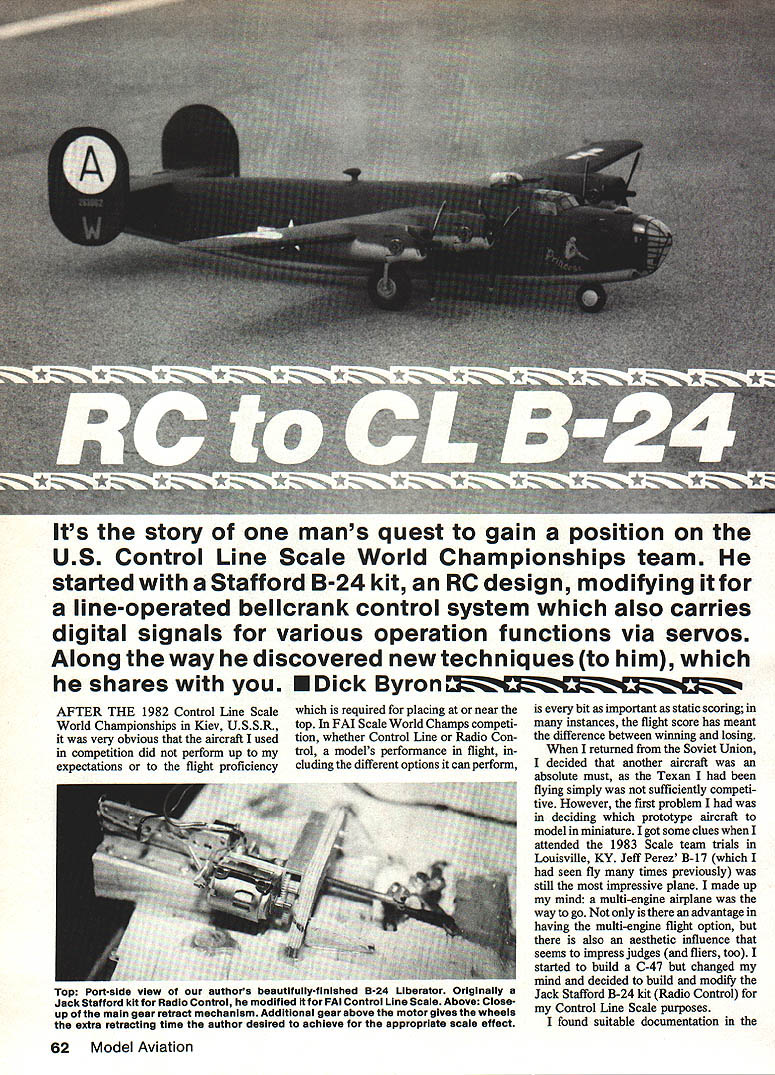 Its story mans quest gain position US Control Line Scale World Championships team started Stafford B-24 kit RC design modifying itfor line-operated bellcrank control system also carries digital signals various operation functions via servos Alongthewayhediscovered newtechniquesto him shares U Dick Byron R THE 1982 Control Line Scale World Championships Kiev USSR very obvious aircraft used competition did perform up expectations flight proficiency required placing near top FAI Scale World Champs competi tion whether Control Line Radio Con trol models performance flight cluding different options can perform bit important static scoring instances flight score has meant difference between winning losing returned Soviet Union decided another aircraft absolute must Texan flying simply sufficiently competi tive However first problem deciding prototype aircraft model miniature got some clues attended 1983 Scale team trials Louisville KY Jeff Perez B-17 seen fly times previously still impressive plane made up mind multi-engine airplane way go advantage having multi-engine flight option also aesthetic influence seems impress judges fliers too started build C-47 changed mind decided build modify Jack Stafford B-24 kit Radio Control Control Line Scale purposes found suitable documentation 62 Model Aviation Top Port-side view authors beautifullyfinished B-24 Liberator Originaiiy Jack Stafford kit Radio Controi modified FAI Controi Line Scale Above Close up main gear retract mechanism Additionai gear above motor gives wheels extra retracting time author desired achieve appropriate scaie effect 4 Left close-up nose art Princess photographically enlarged copied Aerodata magazine emulsion peeled off paper doped fuselage covered dope fuel-proofing Right gun turret panel line detail aircraft first painted silver followed olive drab An X-Acto knife used etching-in panel lines Photos author Aerodata International No 11 Phillip J R Moyes printed Visual Art Press Ltd Oxford England colored threeview drawings other detailing book ample good rendition B-24 However didnt stop spent hours substantial amount money obtain other printed material showing construction techniques de tailing full-size B-24 began construction anticipated major under taking Surprisingly converting RC model CL difficult people seem imagine Because Stafford B-24 has foam wing conversion much simpler would have case built-up wing model size weight requires substantial control system Having built CL Stunters decided same type control system should used B-24a nylon bellcrank pivoting threaded shaft bearings through center wing However stance used Sig nylon bellcrank fitted over 10-3 2 shaft affording great strength bellcranks diameter Mounting bellcrank sturdily center gravity CG main thing dowhile also being sure cleared internal gadgets decided use electronic control system operate functions options basic layout internal controls engine throttles retractable land ing gear operating flaps rotating gun turret figured out before oould get very far construction old EK RC system would have converted operation through control lines conversion went KRD Products 5620 State Ave Kansas City KS 66101 Ken Wilson KRD previously has done such rework Mike Stott Mike Gretz Bill Hamey others converted system direct servo control minimal charge system transmits controlling pulses through control lines decoder model thereby allow ing proportional control rotating gun turret either direction operating flaps throttles retractabale landing gear landing gear major problem plane no way couple both nose gear main gear together servo still have removable wing Fortunately able purchase KRD Products very old Wing Manufacturing retract mechanism operate nose gear unit seemed workable solution servos tried just did have power retract nose gear properly Although noisy powerful unit does job very well main gear different solution required aircraft has 4-in-dia wheels very heavy mounted very long landing gear weight combined leverage powerful system needed able use Janco unit built Jack Stolly Texas though required modification properly work gear time frame Continued page 140 August 1985 63 Left frisketas applied tothe canopy photo showsthe layout method proper canopy painting Right main cockpit frisket place masking tape removed throttle quadrant console just example exquisite detail common throughout entire model Nec essary well competitions Close-up details tail turret Because 1880 far back detailing must done weight conservatIon mind achieve desired CG adding ballast stripes packaged sheet form 36 inches long contain six lengths 18 running feet width A6 I, -in striping trimsheet eight 20 inches suitable making insig nias lettering trimsheet package contains easy-to-follow instructions making size lettering both straight slanted straight edge sharp mod eling knife careful adherence instruc tions some imagination should allow create special designs lettering exact scale model familiar Coverite Graphics products am sure note 420 Babylon Road Horsham PA 19044 will get brochure Camouflage color formulas Four new camouflage color formulas have released Pettit Paint Company Inc makers Hobbypoxy paints new colors contemporary USAF air craft use four-color camouflage scheme Dark Tan Medium Green Dark Green Light Gray Dark PLASTICIZER FOR ACRYLICS AND DOPES STOPS CRACKING AND CHIPPING Tan Medium Dark Greens used upper wing surfaces fuselage tail assembly Light Gray used bottom entire plane Aircraft using four-color camouflage include combat aircraft Vietnam War well pres ent-day operational jet- propellerdriven aircraft new formulas follows Dark TanFS 30219 five parts H65 Bright Red three parts HlO White two parts H49 Cub Yellow part H70 Gray part H81 Black Medium GreenFS 34102 four parts H65 Bright Red three parts H49 Cub Yellow three parts H81 Black two parts H33 Stinson Green part H70 Gray part HlO white Dark GreenES 34079 five parts H65 Bright Red three parts H33 Stinson Green