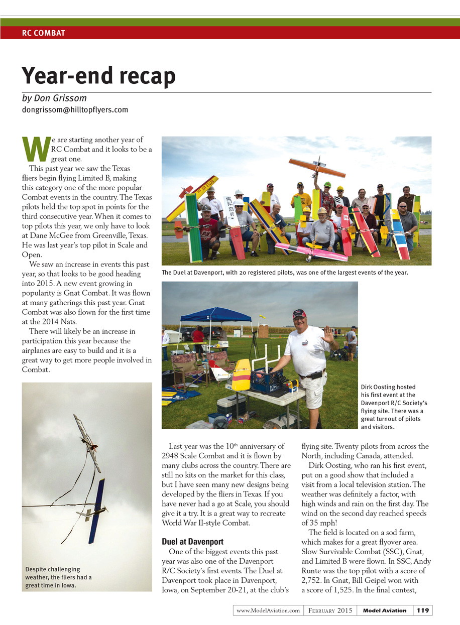 I am always looking for new ideas and solutions to problems that I have had. Last year, Dane McGee came up with a great way to communicate with other Combat pilots by using a Facebook group as a way to convey ideas and event reports. The group can be found by doing a search on Facebook for “RC Combat.”