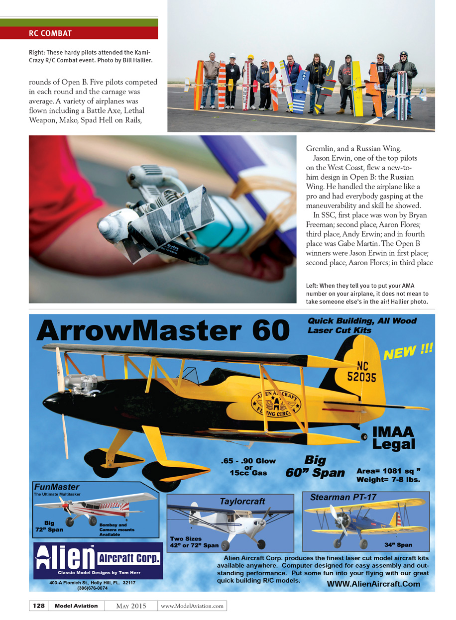 The Fresno Radio Modelers held one of the first contests of the year. The Kami-Crazy RC Combat event was held on January 24, 2015. The Fresno Radio Modelers club has been bitten by the Combat bug—especially Dale Soutas. The club has four contests scheduled for later this year.