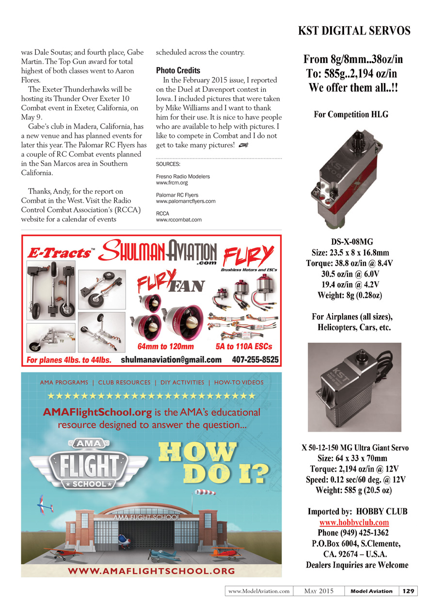 Gabe’s club in Madera, California, has a new venue and has planned events later this year. The Palomar RC Flyers has a couple of RC Combat events planned in the San Marcos area in Southern California.