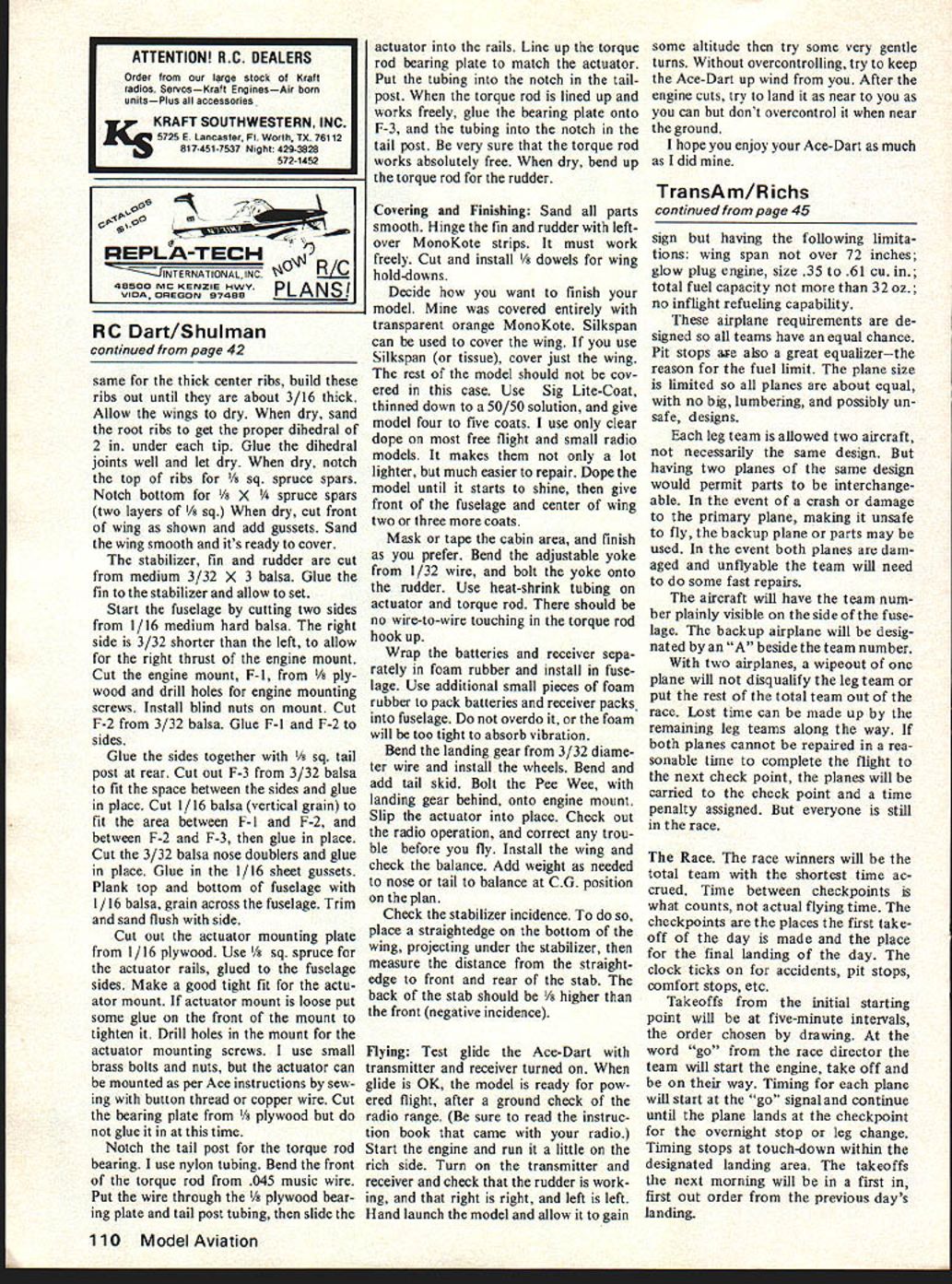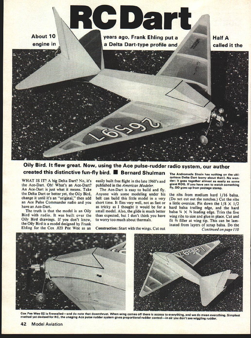 Oily Bird flew great Now using Ace pulse-rudder radio system author created distinctive fun-fly bird U Bernard Shulman WHAT IS IT big Delta Dart No its Ace-Dart Oh Whats Ace-Dart An Ace-Dart just what means Take Delta Dart better yet Oily Bird change until its original add Ace Pulse Commander radio have Ace-Dart truth model Oily Bird radio built over Oily Bird drawings dont know Oily Bird model designed Frank Ehling Cox 020 Pee Wee easily built free flight late 1960s published American Modeler Ace-Dart easy build fly Anyone some modeling under belt can build little model very short time flies very well fast tricky thought would small model Also glide much better expected dont think have worry too much about thermals Construction Start wings Cut out Andromeda Strain has nothing ubi quitous Delta Dart sorry about No won der goes together almost easily some giant ROG have yen watch something fly DO goes up postage stamp ribs medium hard 1/16 balsa cut out notches Cut ribs little oversize Pin down 1/8 hard balsa trailing edge hard balsa leading edge Trim five wing ribs size glue place Cut fit 3/s filler wing tip can lam inated layers scrap balsa Continued page 110 42 Model Aviation Cox Pee Wee 02 firewalledand note downthrust wing comes off access everything mean everything Simplest method yet devised RC unaging Ace pulse rudder system gives proportional rudder controlin air dont see wiggling rudder RC Dart/Shulman continued page 42 same thick center ribs build ribs out until about 3/16 thick Allow wings dry dry sand root ribs get proper dihedral 2 under tip Glue dihedral joints well let dry dry notch top ribs /8 sq spruce spars Notch bottom /s X ce spars two layers /8 sq dry cut front wing shown add gussets Sand wing smooth its ready cover stabilizer fin rudder cut medium 3/32 x 3 balsa Glue fin stabilizer allow set Start fuselage cutting two sides 1/16 medium hard balsa right side 3/32 shorter left allow right thrust engine mount Cut engine mount F-i /8 ply wood drill holes engine mounting screws Install blind nuts mount Cut F-2 3/32 balsa Glue F-I F-2 sides Glue sides together /8 sq tail post rear Cut out F-3 3/32 balsa fit space between sides glue place Cut 1/16 balsa vertical grain fit area between F-l F-2 between F-2 F-3 glue place Cut 3/32 balsa nose doublers glue place Glue 1/16 sheet gussets Plank top bottom fuselage 1/16 balsa grain across fuselage Trim sand flush side Cut out actuator mounting plate 1/16 plywood Use /s sq spruce actuator rails glued fuselage sides Make good tight fit actu ator mount actuator mount loose put some glue front mount tighten Drill holes mount actuator mounting screws use small brass bolts nuts actuator can mounted per Ace instructions sew ing button thread copper wire Cut bearing plate plywood glue time Notch tail post torque rod bearing use nylon tubing Bend front torque rod 045 music wire Put wire through plywood bear ing plate tail post tubing slide actuator rails Line up torque rod bearing plate match actuator Put tubing notch tail post torque rod lined up works freely glue bearing plate onto F-3 tubing notch tail post very sure torque rod works absolutely free dry bend up torque rod rudder Covering Finishing Sand parts smooth Hinge fin rudder left over MonoKote strips must work freely Cut install /i dowels wing hold-downs Decide want finish model Mine covered entirely transparent orange MonoKote Silkspan can used cover wing use Silkspan tissue cover just wing rest model should cov ered case Use Sig Lite-Coat thinned down 50/50 solution give model four five coats use clear dope free flight small radio models makes lot lighter much easier repair Dope model until starts shine give front fuselage center wing two three coats Mask tape cabin area finish prefer Bend adjustable yoke 1/32 wire bolt yoke onto rudder Use heat-shrink tubing actuator torque rod should no wire-to-wire touching torque rod hook up Wrap batteries receiver sepa rately foam rubber install fuse lage Use additional small pieces foam rubber pack batteries receiver packs fuselage overdo foam will too tight absorb vibration Bend landing gear 3/32 diame ter wire install wheels Bend add tail skid Bolt Pee Wee landing gear behind onto engine mount Slip actuator place Check out radio operation correct trou ble before fly Install wing check balance Add weight needed nose tail balance CG position plan Check stabilizer incidence place straightedge bottom wing projecting under stabilizer measure distance straight edge front rear stab back stab should /s higher front negative incidence Flying Test glide Ace-Dart transmitter receiver turned glide OK model ready pow ered flight after ground check radio range sure read instruc tion book came radio Start engine run little rich side Turn transmitter receiver check rudder work ing right right left left Hand launch model allow gain some altitude try some very gentle turns Without overcontrolling try keep Ace-Dart up wind After engine cuts try land near you can dont overcontrol near ground hope enjoy Ace-Dart much did Tra nsA m/R ichs continued page 45 sign having following limita tions wing span over 72 inches glow plug engine size 35 61 cu total fuel capacity 32oz no inflight refueling capability airplane requirements de signed teams have equal chance Pit stops ae also great equalizerthe reason fuel limit plane size limited planes about equal no big lumbering possibly un safe designs leg team allowed two aircraft necessarily same design having two planes same design would permit parts interchange able event crash damage primary plane making unsafe fly backup plane parts may used event both planes dam aged unflyable team will need some fast repairs aircraft will have team num ber plainly visible side fuse lage backup airplane will desig nated beside team number two airplanes wipeout plane will disqualify leg team put rest total team out race Lost time can made up remaining leg teams along way both planes cannot repaired rea sonable time complete flight 