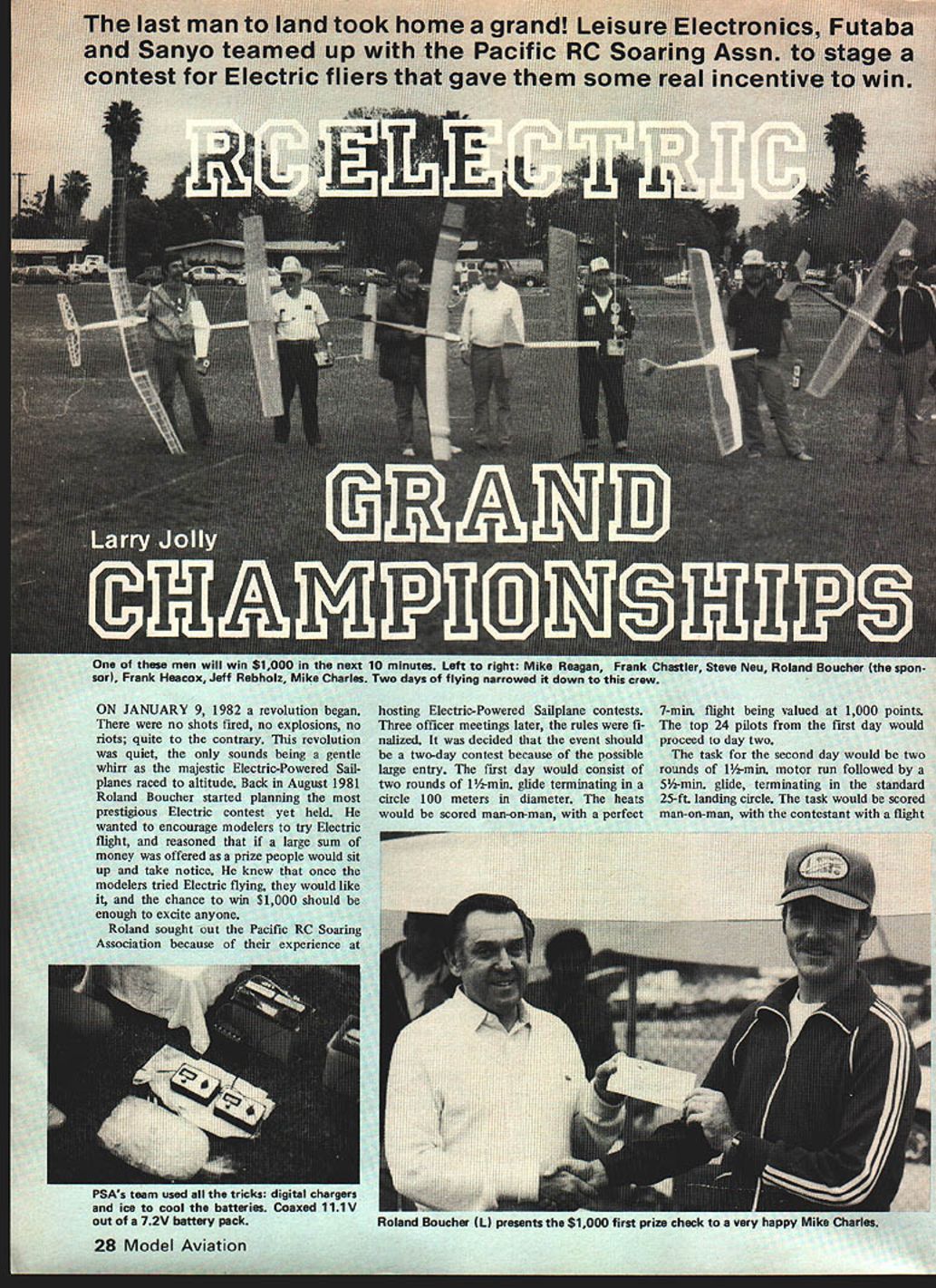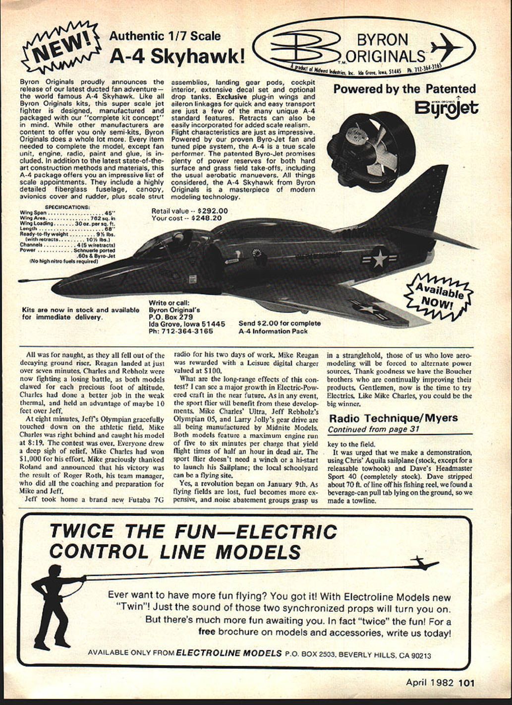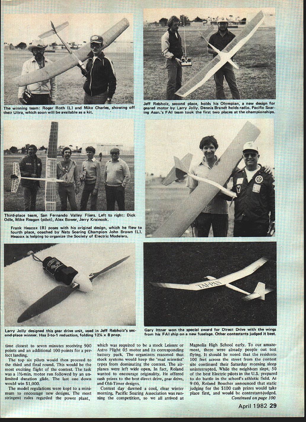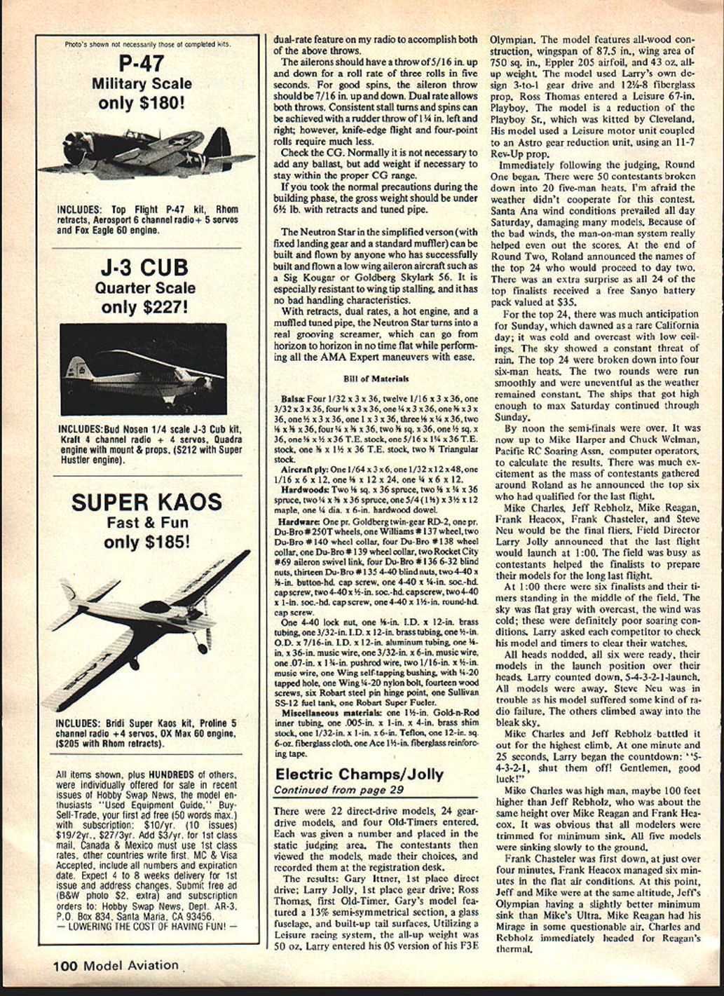 ha next 10 minutes Left right Mikerra Charles Two days flying narrowed down crew ON JANUARY 9 1982 revolution began no shots fired no explosions no riots quite contrary revolution quiet sounds being gentle whirr majestic Electric-Powered Sailplanes raced altitude Back August 1981 Roland Boucher started planning prestigious Electric contest yet held wanted encourage modelers try Electric flight reasoned large sum money offered prize people would sit up take notice knew once modelers tried Electric flying would like chance win $1000 should enough excite anyone Roland sought out Pacific RC Soaring Association because experience PSAs team used tricks digital chargers ice cool batteries Coaxed 111 V out 72V battery pack hosting Electric-Powered Sailplane contests Three officer meetings later rules fi nalized decided event should two-day contest because possible large entry first day would consist two rounds lA-min glide terminating circle 100 meters diameter heats would scored man-on-man perfect 7-mm flight being valued 1000 points top 24 pilots first day would proceed day two task second day would two rounds l/z-min motor run followed 5A-min glide terminating standard 25-ft landing circle task woi ac man-on-man contestant time closest seven minutes receiving 900 points additional 100 points per fect landing top six pilots would proceed third final round would exciting flight contest task 1A-min motor run followed un limited duration glide last down would win $1000 model regulations kept mini mum encourage new designs stringent rules regarded power plant required stock Leisure Astro Flight 05 motor its corresponding battery pack organizers reasoned stock systems would keep mad scientist types dominating contest air planes left wide open fact Roland wanted encourage originality offered cash prizes best direct drive gear drive Old-Timer designs Contest day dawned cool clear winter morning Pacific Soaring Association run ning competition arrived Magnolia High School early amaze ment aiready people out test flying should noted residents 100 feet across street contest site continued Saturday morning sleep uninterrupted neighbors slept 50 best Electric plots US prepared battie schools athletic field 900 Roland Boucher announced static judging $100 cash prizes would take place first would contestant-judged Continued page 100 April 1982 29 o team lan 1-ernando Valley Hiers Left right Dick Reagan pilot Alex Bower Jerry Krainock Heacox RI poses original design flew place coached Nats Soaring Champion John Brown LI ix is helping organize Society Electric Modelers Larry Jolly designed gear drive unit used Jeff Rebholzs sec ond-place winner Has 3-to-i reduction folding 12% x 8 prop Gary lffner won special award Direct Drive wings FAI ship new fuselage Other contestants judged best Photo s shown necessarily completed kits P47 Military Scale $180 INCLUDES Top Flight P-47 kit Rhom retracts Aerosport 6 channel radio 5 servos Fox Eagle 60 engine J-3 CUB Quarter Scale $227 INCLUDESBud Nosen 1/4 scale J3 Cub kit Kraft 4 channel radio rvos auadra engine mount & props $212 Super Hustler engine SUPER KAOS Fast & Fun $185 INCLUDES Bridi Super Kaos kit Proline 5 channel radio 4 servos OX Max 60 engine $205 Rhom retracts items shown plus HUNDREDS others individually offered tar sale recent issues Hobby Swap News model en thusiasts 'Used Equipment Guide BuySell-Trade first ad free 50 words ritax subscription $10/yr 10 issues $19/2yr $27/3yr Add $3/yr 1st class mail Canada & Mexico must use 1st class rates other countries write first MC & Visa Accepted include numbers expiration date Expect 4 B weeks delivery tor 1st issue address changes Submit free ad B&W photo $2 extra subscription orders Hobby Swap News Dept AR-3 PO Box 834 Santa Maria CA 93456 LOWERING THE COST OF HAVING FUN 0 dual-rate feature radio accomplish both above throws aiterons should have throw 5/16 up down roll rate three rolls five seconds good spins aileron throw should 7/16 up down Dual rate allows both throws Consistent stall turns spins can achieved rudder throw oft right however knife-edge flight four-point rolls require much less Check CG Normally necessary add ballast add weight necessary stay within proper CG range took normal precautions during building phase gross weight should under 6 lb retracts tuned pipe Neutron Star simplified versonwith fixed landing gear standard muffler can built flown anyone has successfully built flown low wing aileron aircraft such Sig Kougar Goldberg Skylark 56 especially resistant wingtip stalling has no bad handling characteristics retracts dual rates hot engine muffled tuned pipe Neutron Star turns real grooving screamer can go horizon horizon no time flat perform ing AMA Expert maneuvers ease Roll Materials Bals Four t/32 x 3 x 36 twelve t/16 x 3 x 36 3/32x3 x36four x3 x36 x3 x36one x3 x 36 x 36 1 x 3 x 36 three 36 two xPh x36four x x36twosqx36one sqx 36onexx36TEstockone5/t6xlx36TE stock x 36 TE stock two ngular stock AireraftplTOne l/64x3 x6onet/32x 12x48one l/t6 x 6 x 12 x 24 x 12 Hardwooda Two 36 spruce two 36 sprucetwoxx36spruceone5/41x3x12 maple x 6-in hardwood dowel Hardware pr Goldberg twin-gear RD-2 pr Du-Bro * 250T wheels Williams * 137 wheel two Du-Bro * 140 wheel collar four Du-Bro * 138 wheel collar Du-Bro * 139 wheel collar two Rocket City *69 aileron swivel link four Du-Bro #136 6-32 blind nuta thirteen Du-Bro * 135 4-40 blind nuts two 4-40 x -in button-hd cap screw 4-40 x -in soc-hd cap screw two 4-40 x -in soc-hd capscrew two4-40 x 1-in soc-hd cap screw 4-40 x 1-in round-hd cap screw 4-40 lock nut -in ID x 12-in brass tubing 3/32-in ID x 12-in brasstubing -in OD x7/16-in LD x 12-in aluminum tubing x 36-in music wire 3/32-in x 6-in music wire 07-in x 1-in pushrod wire two 1/16-in x -in music wire Wing self-tapping bushing -20 tapped hole Wing -20 nylon bolt fourteen wood screws six Robart steel pin hinge point Sullivan SS-12 fuel tank Robart Super Fueler Miseellaaeous materlals 1-in Gold-n-Rod i