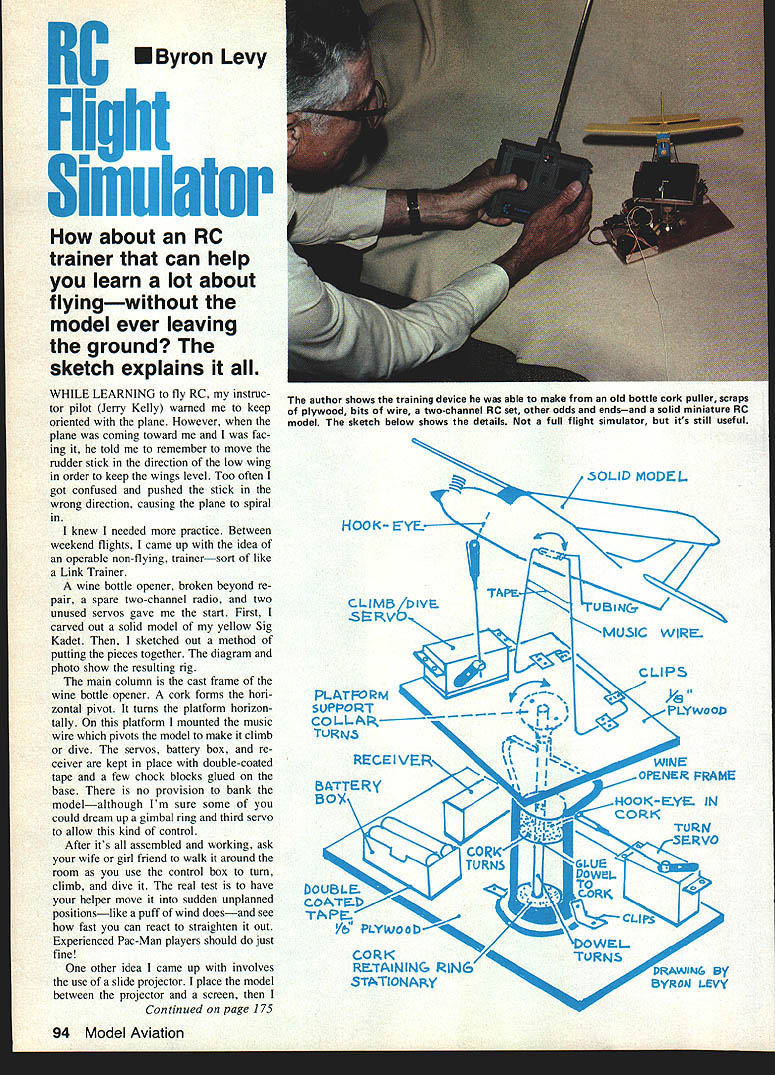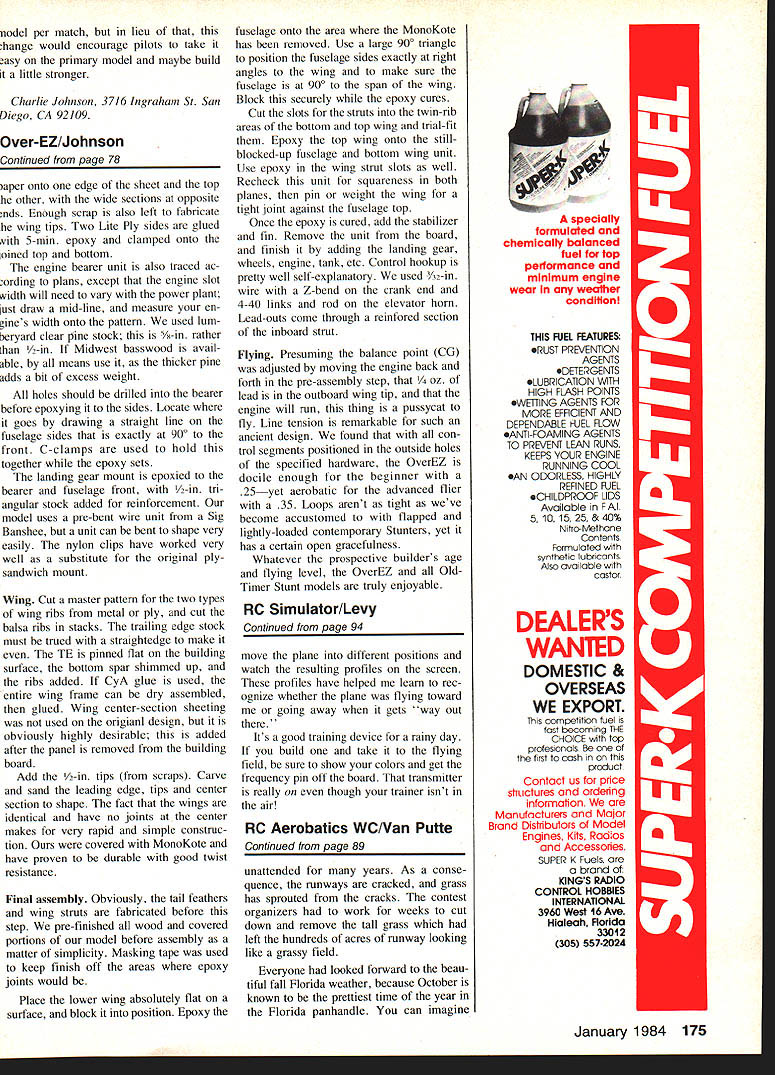 RC U Byron Levy FLight Simulator about RC trainer can help learn lot about flyingwithout model ever leaving ground sketch explains WHILE LEARNING fly RC instruc tor pilot Jerry Kelly warned keep oriented plane However plane coming toward fac ing told remember move rudder stick direction low wing order keep wings level Too often got confused pushed stick wrong direction causing plane spiral knew needed practice Between weekend flights came up idea operable non-flying trainersort like Link Trainer wine bottle opener broken beyond re pair spare two-channel radio two unused servos gave start First carved out solid model yellow Sig Kadet sketched out method putting pieces together diagram photo show resulting rig main column cast frame wine bottle opener cork forms hori zontal pivot turns platform horizon tally platform mounted music wire pivots model make climb dive servos battery box re ceiver kept place double-coated tape few chock blocks glued base no provision bank modelalthough Im sure some could dream up gimbal ring third servo allow kind control After its assembled working ask wife girl friend walk around room use control box turn climb dive real test have helper move sudden unplanned positionslike puff wind doesand see fast can react straighten out Experienced Pac-Man players should just fine other idea came up involves use slide projector place model between projector screen Continued page 175 SOLID MODEL PIJ\TFORM SUPPORTPLYwooD COLLAR RECEIVER 11-WlN \\I -OPENER FRAME STATIONARYDRAWING B /& PLYwoobCLIPS CO R 1 RETAINING lll6RNS BYROAJ LEV 94 Model Aviation author shows training device able make old bottle cork puller scraps plywood bits wire two-channel RC set other odds endsand solid miniature RC model sketch below shows details full flight simulator its still useful riodel per match lieu hange would encourage pilots take asy primary model maybe build little stronger Charlie Johnson 3716 graham Sr San iego CA 92109 Dver-EZ/Johnson continued paae 78 aper onto edge sheet top Lie other wide sections opposite nds Enough scrap also left fabricate wing tips Two Lite Ply sides glued vith 5-mm epoxy clamped onto oined top bottom engine bearer unit also traced ac ording plans except engine slot vidth will need vary power plant ust draw mid-line measure en ines width onto pattern used bin cryard clear pine stock T/0-in rather han -in Midwest basswood avail ible means use thicker pine sdds bit excess weight holes should drilled bearer before epoxying sides Locate goes drawing straight line fuselage sides exactly 900 front C-clamps used hold together epoxy sets landing gear mount epoxied bearer fuselage front -in tn angular stock added reinforcement model uses pre-bent wire unit Sig Banshee unit can bent shape very easily nylon clips have worked very well substitute original plysandwich mount Wing Cut master pattern two types wing ribs metal ply cut balsa ribs stacks trailing edge stock must trued straightedge make TE pinned flat building surface bottom spar shimmed up ribs added CyA glue used entire wing frame can dry assembled glued Wing center-section sheeting used origianl design obviously highly desirable added after panel removed building board Add -in tips scraps Carve sand leading edge tips center section shape fact wings identical have no joints center makes very rapid simple construc tion covered MonoKote have proven durable good twist resistance Final assembly Obviously tail feathers wing struts fabricated before step pre-finished wood covered portions model before assembly matter simplicity Masking tape used keep finish off areas epoxy joints would Place lower wing absolutely flat surface block position Epoxy fuselage onto area MonoKote has removed Use large 900 triangle position fuselage sides exactly right angles wing make sure fuselage 900 span wing Block securely epoxy cures Cut slots struts twin-rib areas bottom top wing trial-fit Epoxy top wing unto stillblocked-up fuselage bottom wing unit Use epoxy wing strut slots well Recheck unit squareness both planes pin weight wing tight joint against fuselage top Once epoxy cured add stabilizer fin Remove unit board finish adding landing gear wheels engine tank etc Control hookup pretty well self-explanatory used 3A2-in wire Z-bend crank end 4-40 links rod elevator horn Lead-outs come through reinfored section inboard strut Flying Presuming balance point CO adjusted moving engine back forth pre-assembly step / oz lead outboard wing tip engine will run thing pussycat fly Line tension remarkable such ancient design found con trol segments positioned outside holes specified hardware OverEZ docile enough beginner 25yet aerobatic advanced flier 35 Loops arent tight weve become accustomed flapped lightly-loaded contemporary Stunters yet has certain open gracefulness Whatever prospective builders age flying level OverEZ OldTimer Stunt models truly enjoyable RC Simulator/Levy Continued page 94 move plane different positions watch resulting profiles screen profiles have helped learn rec ognize whether plane flying toward going away gets out Its good training device rainy day build take flying field sure show colors get frequency pin off board transmitter really though trainer isnt air RC Aerobatics WC/Van Putte Continued page 89 unattended years As conse quence runways cracked grass has sprouted cracks contest organizers work weeks cut down remove tall grass left hundreds acres runway looking like grassy field Everyone looked forward beau tiful fall Florida weather because October known prettiest time year Florida panhandle can imagine THIS FUEL FEATURES ORUST PREVENTION AGENTS SDETERGENTS OLUBRICATION WITH HIGH FLASH POINTS eWEFlING AGENTS FOR MORE EFFICIENT AND DEPENDABLE FUEL FLOW OANTI-FOAMING AGENTS TO PREVENT LEAN RUNS KEEPS YOUR ENGINE RUNNING COOL OAN ODORLESS HIGHLY REFINED FUEL CHILDPROOF LIDS Available hAl 5 10 15 25 & 40% Nitro-Methane Contents Formulated synthetic lubricants Also aaiIabIe castor DEALERS WAN1ED DOMESTIC & OVERSE