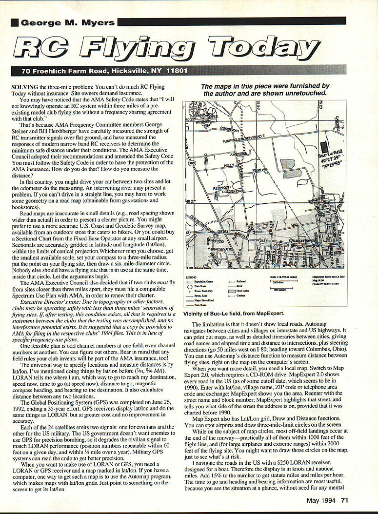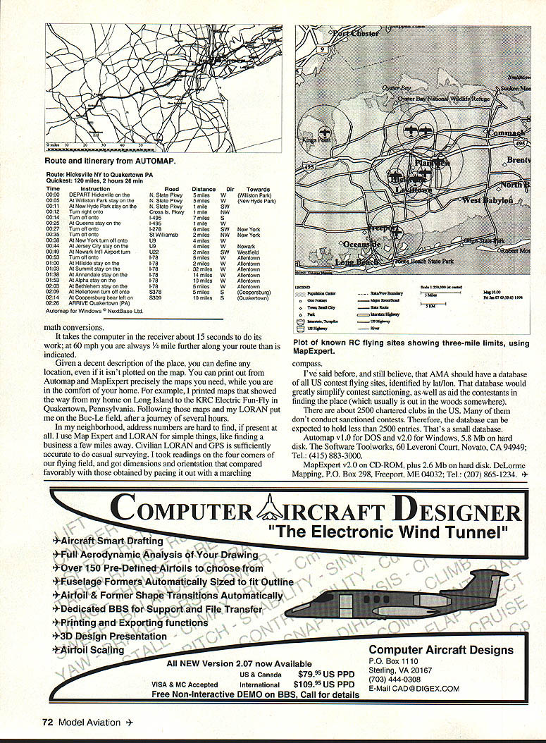 No OCR TEXT Route itinerary AUTOMAP Route Hicksville NY Ouskertown PA Quickest 120 miles 2 hours 26 mm Time truction 0000DEPART Hickaville 0005At Williston Park stay 0011At New Hyde Park stay 0012Turn right Onto 0014Turn off onto 0025At Queens stay 0027Turn off onto 0035Turn off onto 0038At New York turn ott onto 0044At Jersey City stay 0049At Newark Intl Airport turn 0053Turn off onto 0100At Hillside stay 0103At Summit stay 0138At Annandale stay 0153At Alpha stay 0203At Bethlehem stay 0209At Hellertown turn off onto 0214At Cooperahurg hear lefi 0226ARRIVE Osakertown PA Automap tor Windows0 NestBase Ltd math conversions Road N State Pkwy N State Pkar N State Pkwy Cross Pkwy 1-495 1-495 1-278 St Will iamsh U9 us U22 1-78 1-78 1-78 1-78 1-78 1-78 S378 S309 Distance 5 miles 5 miles 1 mile 1 mile 7 miles 1 mile 6 miles 2 miles 4 milen 4 milsa 2 miles 5 miles 2 miles 32 miles 14 miles tO miles 5 miles 5 miles 10 miles DirTowards WWilliston Park WNew Hyde Park SW NW S W SW NW W W SW W W W W W W S S New York New York Newark Weuttield Allentown Allentown Allentown Allentown Allentown Allentown Coopemburg Quakertown takes computer receiver about 15 seconds its work 60 mph always further along route indicated Given decent description place can define location isnt plotted map can print out Automap MapExpert precisely maps need comfort home example printed maps showed way home Long Island KRC Electric Fun-Fly Quakertown Pennsylvania Following maps LORAN put Buc-Le field after journey several hours neighborhood address numbers hard find present use Map Expert LORAN simple things like finding business few miles away Civilian LORAN GPS sufficiently accurate casual surveying took readings four corners flying field got dimensions orientation compared favorably obtained pacing out marching compass Ive sald before still believe AMA should have database US contest flying sites identified lat/lon database would greatly simplify contest sanctioning well aid contestants finding place usually out woods somewhere about 2500 chartered clubs US dont conduct sanctioned contests Therefore database can expected hold less 2500 entries Thats small database Automap vl0 DOS v20 Windows 58 Mb hard disk Software Toolworks 60 Leverom Court Novato CA 94949 Tel 415 883-3000 MapExpert v20 CD-ROM plus 26 Mb hard disk DeLorme Mapping PO Box 298 Freeport ME 04032 Tel 207 865-1234 4COMPUTER AIRCRAFT DESIGNER Electronic Wind Tunnel Aircraft Smart Drafting *FUIJ Aerodynamic Analysis 6f DrWing Over 150 Pre-Defined Airfoils cttoose Fuselage Formers Automatically SIZed fit Outline Airfoil & Former Shape Trarjtiqns Automatically Dedicated BBS Support file Transfer *Printing arid Exporting functiofl 3D Peslgn Presentation Airtbil ScalingComputer Aircraft Designs NEW Version207 now AvailablePO Box 1110 US & Canada $7995 US PPDSterling VA 20167 VISA & MC AcceptedInternational $1 PD703 444-0308 E-Mail CAD@DIGEXCOM Free Non-Interactive DEMO BBS Call details 72 Model Aviation 5h 1Z004M9 im tese FIiu95te93eet 1994 OoPa599a5od Tse95 ckt sseea Pk Plot known RC flying sites showing three-mile limits using MapExpert