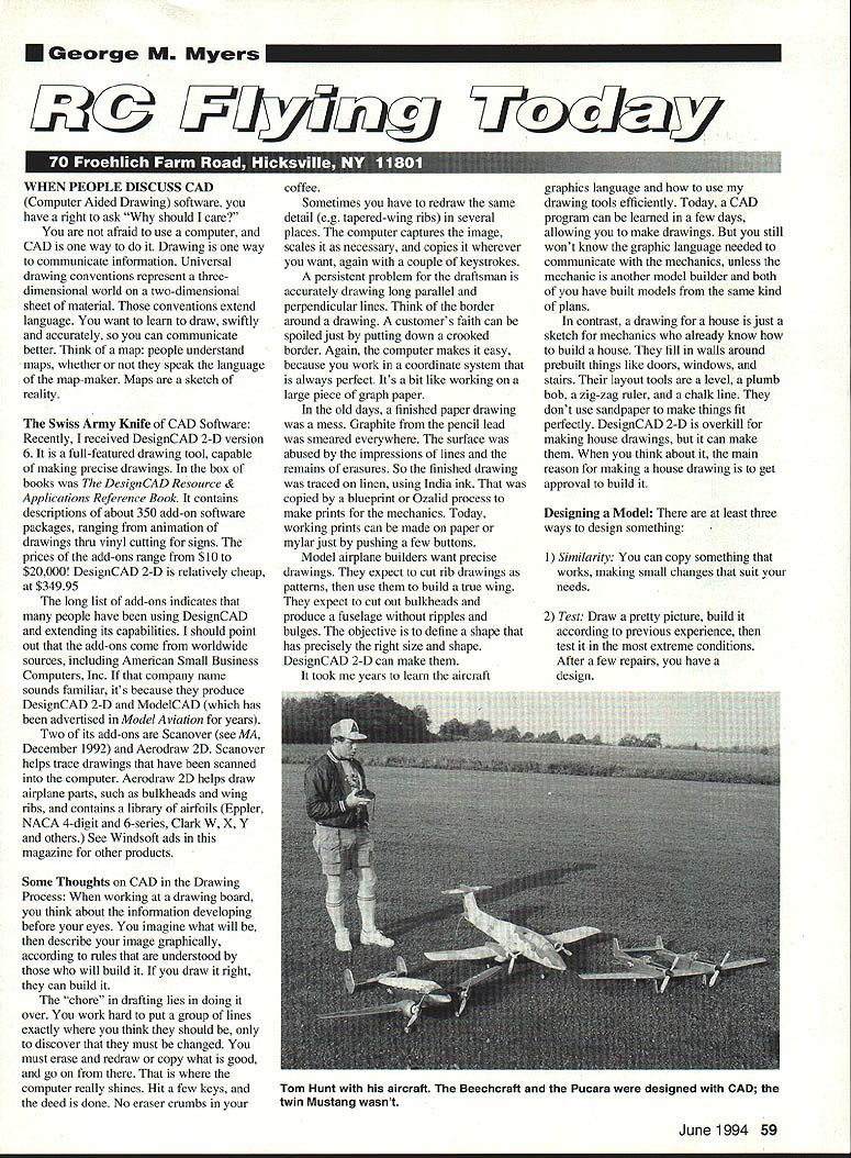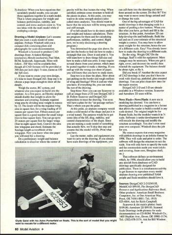 George M Myers 2@if1y7uuiy Hx3y WHEN PEOPLE DISCUSS CAD Computer Aided Drawing software have right ask should care afraid use computer CAD way Drawing way communicate information Universal drawing conventions represent threedimensional world two-dimensional sheet material conventions extend language want learn draw swiftly accurately can communicate better Think map people understand maps whether speak language map-maker Maps sketch reality Swiss Army Knife CAD Software Recently received DesignCAD 2-D version 6 full-featured drawing tool capable making precise drawings box books Design CAD Resource & Applications Reference Book contains descriptions about 350 add-on software packages ranging animation drawings thru vinyl cutting signs prices add-ons range $10 $20000 DesignCAD 2-D relatively cheap $34995 long list add-ons indicates people have using DesignCAD extending its capabilities should point out add-ons come worldwide sources including American Small Business Computers Inc company name sounds familiar its because produce DesignCAD 2-D ModelCAD has advertised Model Aviation years Two its add-ons Scanover see MA December 1992 Aerodraw 2D Scanover helps trace drawings have scanned computer Aerodraw 2D helps draw airplane parts such bulkheads wing ribs contains library airfoils Eppler NACA 4-digit 6-series Clark W X Y others See Windsoft ads magazine other products Some Thoughts CAD Drawing Process working drawing board think about information developing before eyes imagine what will describe image graphically according rules understood will build draw right can build chore drafting lies doing over work hard put group lines exactly think should discover must changed must erase redraw copy what good go computer really shines Hit few keys deed done No eraser crumbs coffee Sometimes have redraw same detail eg tapered-wing ribs several places computer captures image scales necessary copies wherever want again couple keystrokes persistent problem draftsman accurately drawing long parallel perpendicular lines Think border around drawing customers faith can spoiled just putting down crooked border Again computer makes easy because work coordinate system always perfect Its bit like working large piece graph paper old days finished paper drawing mess Graphite pencil lead smeared everywhere surface abused impressions lines remains erasures So finished drawing traced linen using India ink copied blueprint Ozalid process make prints mechanics Today working prints can made paper mylar just pushing few buttons Model airplane builders want precise drawings expect cut rib drawings patterns use build true wing expect cut out bulkheads produce fuselage ripples bulges objective define shape has precisely right size shape DesignCAD 2-D can make took mc years learn aircraft graphics language use drawing tools efficiently Today CAD program can learned few days allowing make drawings still wont know graphic language needed communicate mechanics unless mechanic another model builder both have built models same kind plans contrast drawing house just sketch mechanics already know build house fill walls around prebuilt things like doors windows stairs layout tools level plumb bob zig-zag ruler chalk line dont use sandpaper make things fit perfectly DesignCAD 2-D overkill making house drawings can make think about main reason making house drawing get approval build Designing Model least three ways design something I Similarity can copy something works making small changes suit needs 2 Test Draw pretty picture build according previous experience test extreme conditions After few repairs have design June1994 59 Tom Hunt aircraft Beechcraft Pucara designed CAD twin Mustang wasnt 3 Analysis have equations accurately predict results can put equations together math model programs weight balance performance stability control stress analysis come test ideas math model d eveloping design Drawing Model Airplane Lets assume want scale model some airplane Perhaps Windsoft sold compact disk containing plans photographs scale documentation Windsoft licensed produce CAD drawings Aviation Heritage exclusive Hirsch exclusive Paul Matt RCM Scalecraft Superscale will follow TIF files will available first though CAD formats will provided 300 dots per inch dpi 1/2-size same 150 dpi full size want create own design its time learn DesignCAD Step choose page large enough show details Weigh motor RC system whatever else expect build airplane As first guess Electric airplane should double weight allow structure covering Estimate required wing area dividing total weight ounces 15 result will required wing area square feet wing loading 15 ounces per square foot Fifteen ounces per square foot good number small wings two four square feet can go up 25 ounces per square foot larger wings four eight square feet Convert area wingspan chord Estimate fuselage length two/thirds wingspan Now know what size paper will need drawing preliminary weight balance calculation discover center gravity will locates wing satisfied estimate some structure hold pieces place point may want some strength analysis also called stress analysis should want know structure will strong enough stiff enough Ive left unsaid stress analysis weight balance calculations programs calculating performance stability control Right now discussing drawing program determined page size above So get books find out make rectangle size Draw print will learn draw things full-size make full-size print may require several sheets printer must pasted together make drawing end up wrong size sheet paper will know have study Step two draw plans about just putting border rough outlines wing fuselage Print see what have everything fits can make rest drawing Step three Now can use Scanover call image CD DesignCAD 2D Follow Scanover DesignCAD instructions trace drawing soon will have plan air passage surface Thats put paint point airplane company would make solid model shape put wind tunnel purpose wou
