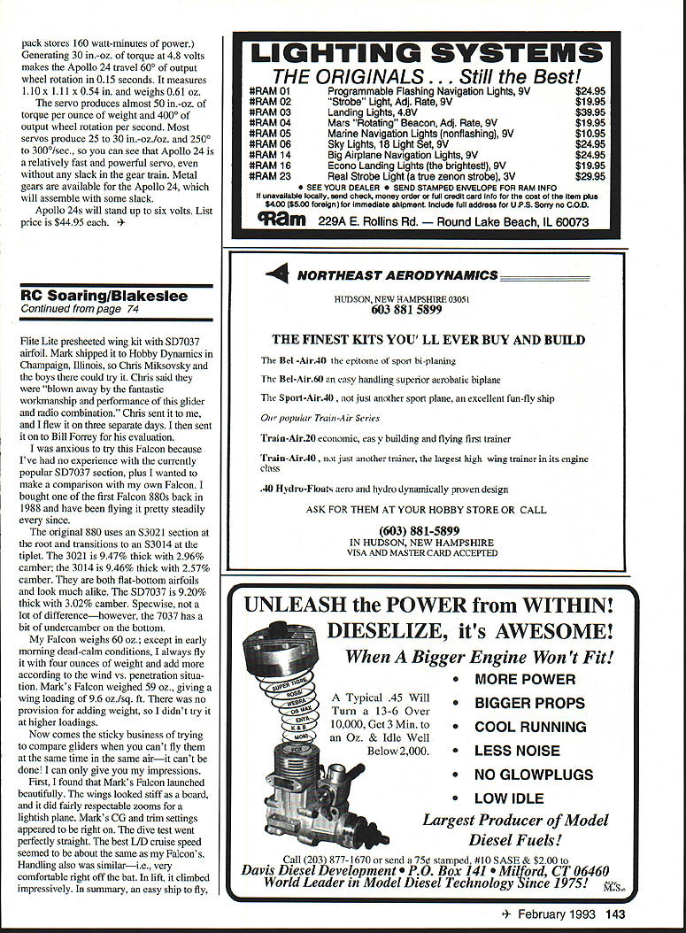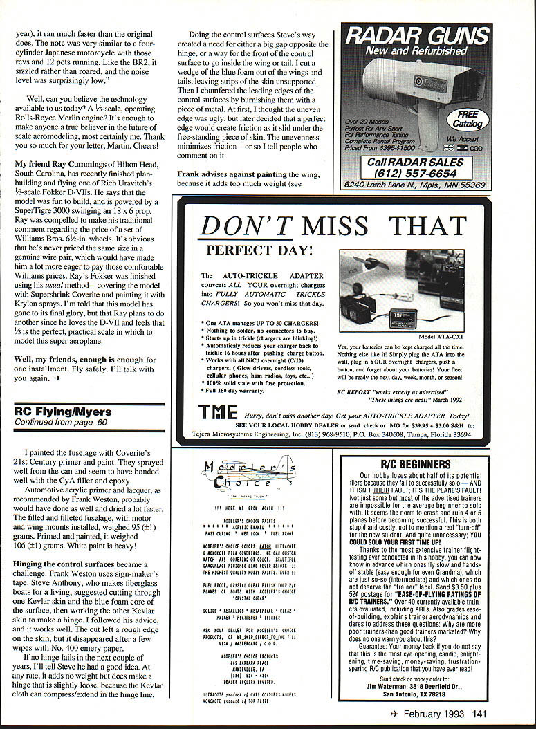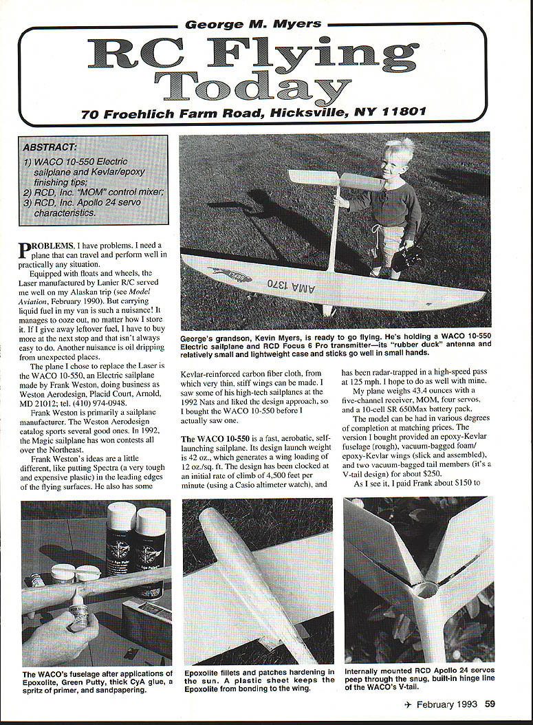 George RI Myers PROBLEMS have problems need plane can travel perform well practically situation Equipped floats wheels Laser manufactured Lanier RIC served well Alaskan trip see Model Aviation February 1990 carrying liquid fuel van such nuisance manages ooze out no matter store give away leftover fuel have buy next stop isnt always easy Another nuisance oil dripping unexpected places plane chose replace Laser WACO 10-550 Electric sailplane made Frank Weston doing business Weston Aerodesign Placid Court Arnold MD 21012 tel 410 974-0948 Frank Weston primarily sailplane manufacturer Weston Aerodesign catalog sports several good ones 1992 Magic sailplane has won contests over Northeast Frank Westons ideas little different like putting Spectra very tough expensive plastic leading edges flying surfaces also has some Kevlar-reinforced carbon fiber cloth very thin stiff wings can made saw some high-tech sailplanes 1992 Nats liked design approach bought WACO 10-550 before actually saw WACO 10-550 fast aerobatic selflaunching sailplane Its design launch weight 42 oz generates wing loading 12 oz/sq ft design has clocked initial rate climb 4500 feet per minute using Casio altimeter watch has radar-trapped high-speed pass 125 mph hope well plane weighs 434 ounces five-channel receiver MOM four servos 10-cell SR 65OMax battery pack model can various degrees completion matching prices version bought provided epoxy-Kevlar fuselage rough vacuum-bagged foam epoxy-Kevlar wings slick assembled two vacuum-bagged tail members its V-tail design about $250 As see paid Frank about $150 February 1993 59 RC 70 Froehlich Farm Road HicksviIIe NY 11801 Georges grandson Kevin Myers ready go flying Hes holding WACO 10-550 Electric sailplane RCD Focus 6 Pro transmitterits rubber duck antenna relatively small lightweight case sticks go well small hands WACOs fuselage after applications Epoxolite Green Putty thick CyA glue spriti primer sandpapering Epoxolite fillets patches hardening Internally mounted RCD Apollo 24 servos sun plastic sheet keeps peep through snug built-in hinge line Epoxolite bonding wing WACOs V-tail vacuum-bag flying surfaces take risk dont come out right can grab new parts off shelf again spoil wing vacuum-bagging process have buy another kit also purchased power plant package Frank another $150 contains Freudenthaler 8 x 5 folding propeller Astro cobalt FAI 15 STW speed con troller BEC Battery Eliminator Circuit receiver servos 10-cell Sanyo N- lOO0AR battery pack motor power Frank pieces placeothers didnt Finishing model relatively simple Just grind off epoxy/Kevlar flash tough stuffuse 80-grit sandpaper mount motor install tail boom fill sand prime paint fuselage cut out hinge control surfaces install receiver four servos mount wing tails put assorted structural items pushrods wiring like some painting decorating must mount two servos inside wing ailerons two inside V-tail elevators yep inside Servos mounted inside tail surfaces common ducted-fan jet models rare sailpianes servo cases provide strength mount tail instal lation Following suggestion Ron Farkas made servo installation silicone glue easy removal should become necessary fuselage essentially two-piece pod-and-boom design pod made two parts over male mold split along bottom centerline pulled off seam being taped Keviar epoxy tail boom pushed nose glued place joint tapered seam-taping process left rough exterior Kevlar threads sticking out few wrinkles some epoxy runsall smoothed out Notice cut Kevlar furry threads left sticking out tough cut off keep ducking away cutting edge resorted stiffening CyA glue shaving off razor blade worked Note also sanding KeyIa/epoxy doesnt give itch way sanding fiberglass does just wear off soft little fibers Keviar roll off skin pesky fibers made sneeze tells use face mask So after rough-sanding away fuse lage blemishes time some Sig Epoxolite didnt like wing-to-fuselage fit built fillet out Epoxolite Epoxolite first mixed like butter An hour later becomes stiff enough can wet finger smooth surface until becomes like glass Wait another two hours will rubbery can minor surgery sharp knife scissors Wait another three hours will hard week-old bagel can saw file grind Dremel tool generally treat like wood Next something done about rough surfaces Keviar cloth came through epoxy after sandpapering Keviar cloth very coarse compared fiberglass know its because catches skin run finger over tried Squadron Green Putty filler didnt work very well Fellow SEFLI Silent Electric Fliers Long Island club member Steve Anthony put wise idea wipe acetone softens epoxy enough give Green Putty pretty good grip Frank told Cyanoacrylate CyA adhesive loves Kevlar skin recommended Bob Smith Industries Super-Gold CyA talked about September 92 issue adhesive made structural installations extrathick gap-filling odorless Maxi-Cure variety 10- 25-second-hardening worked great Inspiration Use gap-filling CyA glue filler spread smooth possible using glue bottle nozzle squeegee let cure Spraying hardener just makes lumps must grind off afterward also dissolves blue foam under Keviar few hours later sleeping Grinding down hardened CyA No 400 wet/dry sandpaper used wet hard work resorted scraping off high spots file used singleedge razor blade held perpendicular surface made short work lumps Wet sanding No 400 emery cloth produced very tough smooth surface similar Plexiglass stops bullets know treatment quick inexpensive light Bob Smith CyA bottle marked /2 ounce 142 grams verified weighing full bottle empty least half CyA added filler wound up being scraped ground off Using CyA both glue real tough filler added about seven grams weight model Thats equal weight two 6-32 wing bolts T-nuts After installed motor found 40mm spinner should about 3A6 away front fuselage order match curves So made adapter moving propeller forward put ring nose fuselage fill gap reasons takes long produce model never seem leave well enough alone Someone told finishin