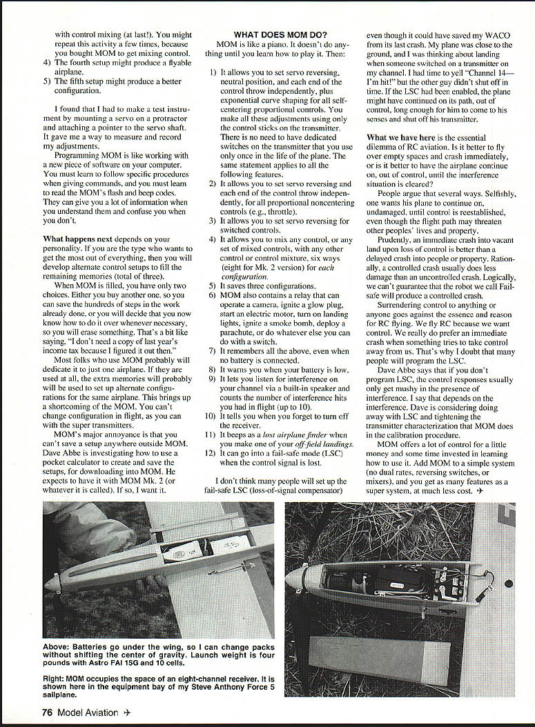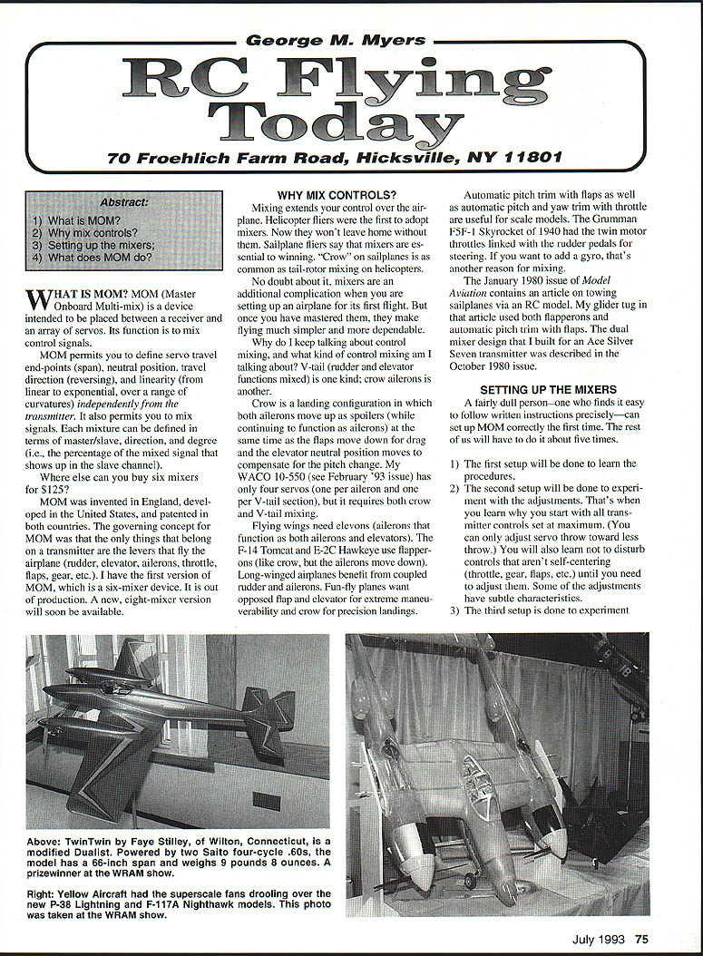 George RE Afyers WHAT IS MOM MOM Master Onboard Multi-mix device intended placed between receiver array servos Its function mix control signals MOM permits define servo travel end-points span neutral position travel direction reversing linearity linear exponential over range curvatures independently transmitter also permits mix signals mixture can defined terms master/slave direction degree ie percentage mixed signal shows up slave channel else can buy six mixers $125 MOM invented England devel oped United States patented both countries governing concept MOM things belong transmitter levers fly airplane rudder elevator ailerons throttle flaps gear etc have first version MOM six-mixer device out production new eight-mixer version will soon available WHY MIX CONTROLS Mixing extends control over air plane Helicopter fliers first adopt mixers Now wont leave home Sailplane fliers say mixers es sentiai winning Crow sailplanes common tail-rotor mixing helicopters No doubt about mixers additional complication setting up airplane its first flight once have mastered make flying much simpler dependable keep talking about control mixing what kind control mixing am talking about V-tail rudder elevator functions mixed kind crow ailerons another Crow landing configuration both ailerons move up spoilers continuing function ailerons same time flaps move down drag elevator neutral position moves compensate pitch change WACO 10-550 see February 93 issue has four servos per aileron per V-tail section requires both crow V-tail mixing Flying wings need elevons ailerons function both ailerons elevators F- 14 Tomcat E-2C Hawkeye use flapper ons like crow ailerons move down Long-winged airplanes benefit coupled rudder ailerons Fun-fly planes want opposed flap elevator extreme maneu verability crow precision landings Automatic pitch trim flaps well automatic pitch yaw trim throttle useful scale models Grumman F5F-l Skyrocket 1940 twin motor throttles linked rudder pedals steering want add gyro thats another reason mixing January 1980 issue Model Aviation contains article towing sailplanes via RC model glider tug article used both flapperons automatic pitch trim flaps dual mixer design built Ace Silver Seven transmitter described October 1980 issue SETTING UP THE MIXERS fairly dull personone finds easy follow written instructions preciselycan set up MOM correctly first time rest us will have about five times 1 The first setup will done learn procedures 2 The second setup will done experi ment adjustments Thats learn start trans mitter controls set maximum can adjust servo throw toward less throw will also learn disturb controls arent self-centering throttle gear flaps etc until need adjust Some adjustments have subtle characteristics 3 The third setup done experiment Right Yellow Aircraft superscale fans drooling over new P-38 Lightning F-117A Nighthawk models photo taken WRAM show July1993 75 RU F1yig Tdy 70 Froehiich Farm Road Hicks viii NY 11801 Above TwinTwin Faye Stilley Wilton Connecticut modified Dualist Powered two Saito four-cycle 60s model has 66-inch span weighs 9 pounds 8 ounces prizewinner WRAM show control mixing last might repeat activity few times because bought MOM get mixing control 4 The fourth setup might produce flyable airplane 5 The fifth setup might produce better configuration found make test instru ment mounting servo protractor attaching pointer servo shaft gave way measure record adjustments Programming MOM like working new piece software computer must learn follow specific procedures giving commands must learn read MOMs flash beep codes can give lot information understand confuse you dont What happens next depends personality type wants get out everything will develop alternate control setups fill remaining memories total three MOM filled have two choices Either buy another can save hundreds steps work already done will decide now know over whenever necessary will erase something Thats bit like saying dont need copy last years income tax because figured out Most folks use MOM probably will dedicate just airplane used extra memories will probably will used set up alternate configu rations same airplane brings up shortcoming MOM cant change configuration flight can super transmitters MOMs major annoyance cant save setup anywhere outside MOM Dave Abbe investigating use pocket calculator create save setups downloading MOM expects have MOM Mk 2 whatever called want WHAT DOES MOM DO MOM like piano doesnt thing until learn play 1 It allows set servo reversing neutral position end control throw independently plus exponential curve shaping selfcentering proportional controls make adjustments using control sticks transmitter no need have dedicated switches transmitter use once life plane same statement applies following features 2 It allows set servo reversing end control throw indepen dently proportional noncentering controls eg throttle 3 It allows set servo reversing switched controls 4 It allows mix control set mixed controls other control control mixture six ways eight Mk 2 version configuration 5 It saves three configurations 6 MOM also contains relay can operate camera ignite glow plug start electric motor turn landing lights ignite smoke bomb deploy parachute whatever else can switch 7 It remembers above no battery connected 8 It warns battery low 9 It lets listen interference channel via built-in speaker counts number interference hits flight up 10 10 It tells you forget turn off receiver 11 It beeps lost airplane finder make off-field landings 12 It can go fail-safe mode LSC control signal lost dont think people will set up fail-safe LSC loss-of-signal compensator though could have saved WACO its last crash plane close ground thinking about landing someone switched transmitter channel time yell Channel 14 Im hit other guy didnt shut off time LSC enabled plane might have continued its path out control long enough him come senses shut off transmitter What have essential dilemma RC aviati