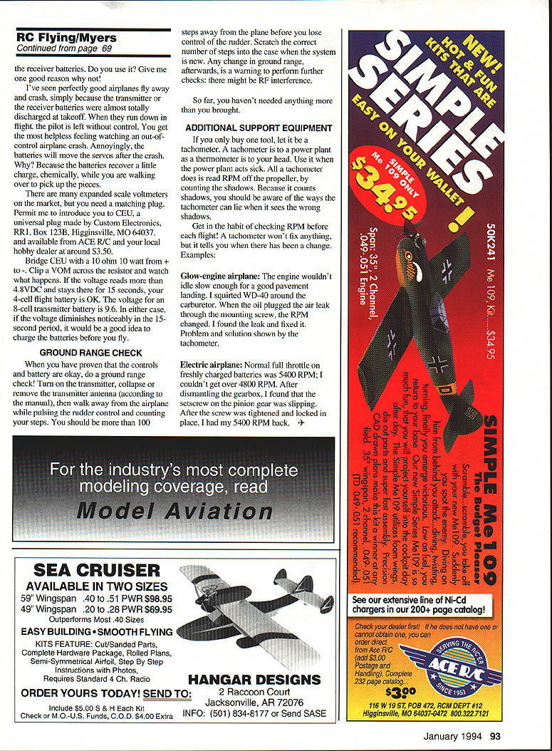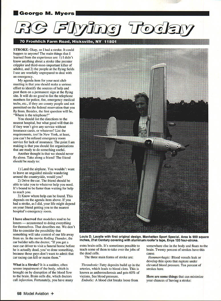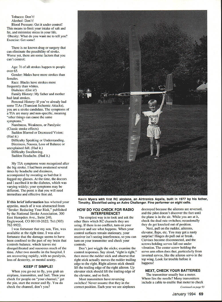 George M Myers 53@ Uyz7uijg H3y STROKE Okay stroke could happen anyone main things learned experience 11 didnt know anything about stroke premier crippler third-most-important killer adults 2 people flying fields use woefully unprepared deal emergency agenda item next club meeting should make serious effort identify sources help post permanent sign flying site will no good list telephone numbers police fire emergency medical techs etc county people permitted federal reservation fly Besides first question will telephone should list directions nearest hospital what good will wont give service insurance cards whatever List requirements too New York least cant refused emergency room service lack insurance point am making should list organizations ready something useful Another thought should never fly alone Take along friend friend should ready 1 Land airplane wouldnt want leave unguided missile wandering around countryside would 2 Drive car friend should able take whatever help need Its bound faster waiting help reach 3 Know help can found depends agenda item above stroke did life might depend friend getting nearest hospitals emergency room have observed modelers tend loners stomed doing everything themselves describes dont like consider possibility something will take control life away us movie Rolling Thunder car builder tells doctor get race car driver visit funeral home before actually dead youve done something because guys dont want admit car racing can kill maim What Stroke sudden often severe impairment body brought disruption blood flow brain Brain cells die doctors call infarction Fortunately have extra brain cells Its sometimes possible teach some take over jobs dead cells three main forms stroke Thrombotic Fatty deposits build up arteries leads blood clots known antherosclerosis gets 60% victims See blood pressure Embolic blood clot breaks loose somewhere else body floats brain Twenty percent strokes have cause Hemmorrhagic Blood vessels leak develop thin spots rupture under elevated blood pressure Ten percent strokes some things can minimize chances having stroke 68 Model Aviation s D Lavalle first original design Manhattan Sport Special Area 900 square inches 21st Century covering aluminum roofers tape Enya 120 four-stroke Tobacco Dont Alcohol Dont Blood Pressure Get under control means limit intake salt fat minimize stress life Obesity What want tell Exercise Get some no known drug surgery can eliminate possibility stroke Worse yet some factors cant control Age 2A strokes happen people over 65 Gender Males have strokes females Race Blacks have strokes frequently whites Diabetes Got Family History father mother fatal strokes Personal History youve already some TIAs Transient Ischemic Attacks stroke candidate symptoms TIA non-specific meaning other things can cause same symptoms Numbness Weakness Paralysis Classic stroke effects Sudden Blurred Decreased Vision Difficulty Speaking Understanding Dizziness Nausea Loss Balance unexplained fall Difficulty Swallowing Sudden Headache TIA symptoms recognized after big stroke awakened several times headache dizziness accompanied sweating bad fogged glasses time doctors ascribed diabetes varying widely symptoms may different point will need immediate effective first aid brief information has whetted appetite much abstracted Stroke Reducing Risk published National Stroke Association 300 East Hampden Ave Suite 240 Englewood CO 80110-2622 Tel303 762-9922 fortunate son Tim available right time also fortunate damage seems have confined part brain controls balance leaves disequilibrated nauseous much time After two months hospital am recovering rapidly no paralysis loss dexterity mental acuity KEEP IT SIMPLE go out fly grab airplane transmitter fuel check people channel get pin start motor fly check channel dont HOW DO YOU CHECK FOR RADIO INTERFERENCE simplest way look ask other fliers RC channels using no conflict turn receiver see what happens control surfaces remaln stationary receiver isnt seeing interference can turn transmitter check controls Dont just wiggle sticks examine control responses Say aloud right right move rudder stick observe right stick actually moves rudder trailing edge right Right aileron stick should lift trailing edge right aileron Up elevator stick should lift trailing edge elevator forth Most transmitters have reversing switches Never assume correct position year see airplanes destroyed because ailerons reversed pilot doesnt discover fact until plane air check dual rate switches occasionally get knocked out position Next pull rudder allerons elevator flaps etc may get nasty surprise Hinges pull out break Clevises become disconnected screws holding servos fall out under vibration center screw holding servo arm often does particularly inverted servos like aileron servo top wing Look trouble before happens NEXT CHECK YOUR BATTERIES transmitter usually has meter lies needle transmitters include cable enable meter check Continued page 93 January 1994 69 Kevin Myers first RC airplane Airtronics Aquila built 1977 father Timothy Electrified using Astro Challenger Fine performer eight cells RC FlyinglMyers Continued page 69 receiver batteries use Give good reason Ive seen perfectly good airplanes fly away crash simply because transmitter receiver batteries almost totally discharged takeoff run down flight pilot left control get helpless feeling watching out-ofcontrol airplane crash Annoyingly batteries will move servos after crash Because batteries recover little charge chemically walking over pick up pieces expanded scale voltmeters market need matching plug Permit introduce CEU universal plug made Custom Electronics RRl Box 123B Higginsville MO 64037 available ACE RIC local hobby dealer around $350 Bridge CEU 10 ohm 10 watt VOM across resistor watch what happens voltage reads 48VDC stays 15 seconds 4-cell flight battery OK voltage 8-cell transmitter battery 96 either case voltage diminishes noticeably 15second period would g