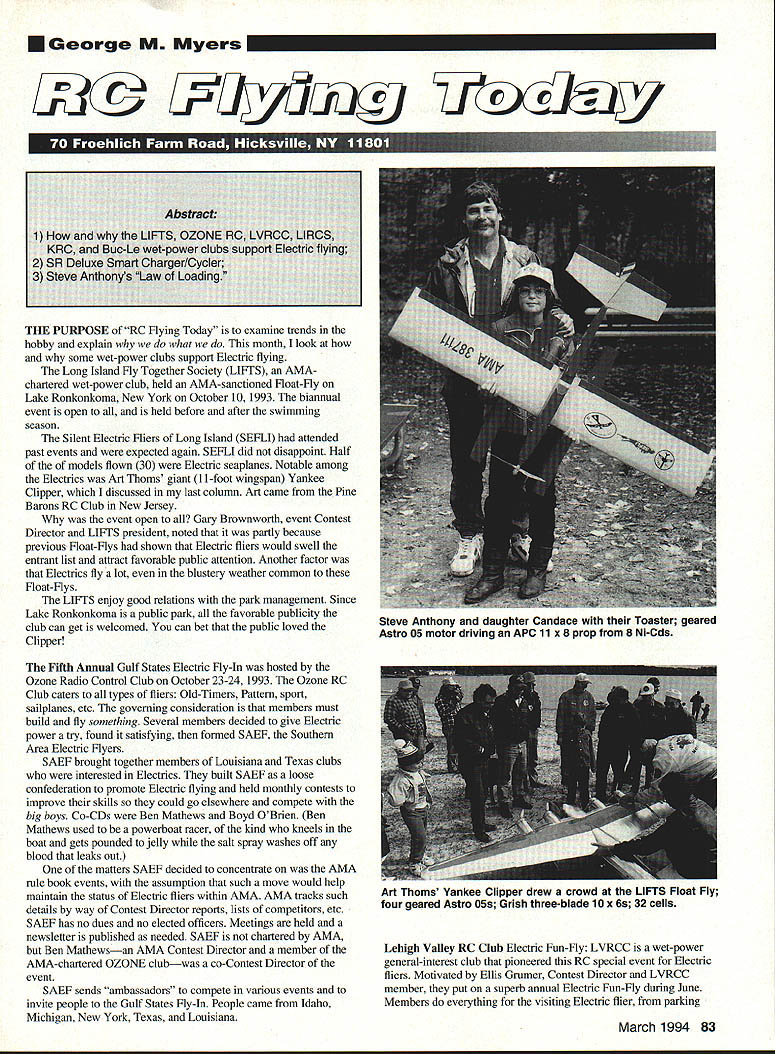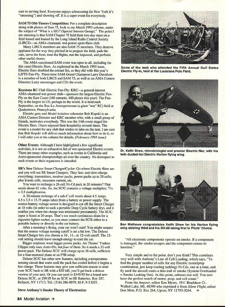 George M Myers Abstract 1 How LLFTS OZONE RO LVRCC LIROS KRC Buc-Le wet-power clubs support Electric flying 2 SR Deluxe Smart Charger/Cycler 3 Steve Anthonys Law Loading THE PURPOSE RC Flying Today examine trends hobby explain what month look some wet-power clubs support Electric flying Long Island Fly Together Society LIFTS AMAchartered wet-power club held AMA-sanctioned Float-fly Lake Ronkonkoma New York October 10 1993 biannual event open held before after swimming season Silent Electric fliers Long Island SEFLI attended past events expected again SEFLI did disappoint Half models flown 30 Electric seaplanes Notable among Electrics Art Thorns giant 11-foot wingspan Yankee Clipper discussed last column Art came Pine Barons RC Club New Jersey event open Gary Brownworth event Contest Director LIFTS president noted partly because previous float-Flys shown Electric fliers would swell entrant list attract favorable public attention Another factor Electrics fly lot blustery weather common float-flys LIFTS enjoy good relations park management Since Lake Ronkonkoma public park favorable publicity club can get welcomed can bet public loved Clipper Fifth Annual Gulf States Electric fly-In hosted Ozone Radio Control Club October 23-24 1993 Ozone RC Club caters types fliers Old-Timers Pattern sport sailplanes etc governing consideration members must build fly something Several members decided give Electric power try found satisfying formed SAEF Southern Area Electric Flyers SAEF brought together members Louisiana Texas clubs interested Electrics built SAEF loose confederation promote Electric flying held monthly contests improve skills could go elsewhere compete big boys Co-CDs Ben Mathews Boyd OBrien Ben Mathews used powerboat racer kind kneels boat gets pounded jelly salt spray washes off blood leaks out matters SAEF decided concentrate AMA rule book events assumption such move would help maintain status Electric fliers within AMA AMA tracks such details way Contest Director reports lists competitors etc SAEF has no dues no elected officers Meetings held newsletter published needed SAEF chartered AMA Ben Mathewsan AMA Contest Director member AMA-chartered OZONE clubwas co-Contest Director event SAEF sends ambassadors compete various events invite people Gulf States Fly-In People came Idaho Michigan New York Texas Louisiana Lehigh Valley RC Club Electric Fun-fly LVRCC wet-power general-interest club pioneered RC special event Electric fliers Motivated Ellis Grumer Contest Director LVRCC member put superb annual Electric Fun-fly during June Members everything visiting Electric flier parking March 1994 83 Steve Anthony daughter Candace Toaster geared Astro 05 motor driving APC 11 x 8 prop 8 Ni-Cds Art Thoms Yankee Clipper drew crowd LIFTS Float Fly four geared Astro OSs Grish three-blade lOx 6s 32 cells cars serving food Everyone enjoys schmoozing New York its smoosing showing off super event everybody SAM 75 Old-Timers Competition complete description along photos Sam 75 look March 1993 column under subject What SIG Special Interest Group point am stressing SAM Chapter 75 held two-day meet field leased loaned Long Island Radio Control Society LIRCSan AMA-chartered wet-power sport-fliers club LIRCS members also SAM 75 members deserve applause way pitched prepare field park cars serve food time flights run impound perform other useful chores AMA-sanctioned SAM event open including case Electric fliers As explained March 1993 issue Electric fliers doubled entrant list did years LIFTS Fun-Fly Three-time SAM Grand Champion Larry Davidson member both LLRCS SAM 75 well AMA Contest Director Larry encourages CDs event Keystone RC Club Electric Fun-Fly KRCa general-interest AMA-chartered wet-power clubsponsors largest Electric FunFly East Coast 160 entrants 400 planes year FunFly largest US perhaps world held September Buc-Le Aerosportsman giant wet RC field Quakertown Pennsylvania Electric guru Model Aviation columnist Bob Kopski AMA Contest Director KRC member small group friends motivates everybody 14th event staged Electric fliers have enjoyed hospitality several times event model club wishes take task am sure Bob Kopski will deliver much information about will refer column details [February 1993 issue] Other Events Although have highlighted few significant activities exhaustive list wet-sponsored Electric events other examples such events California Astro-sponsored championships over country No disrespect such events organizers intended SRs New Deluxe Smart Charger/Cycler Go Electric fliers will see SR Smart Chargers fast- slow-charge everything transmitters receiver packs power packs up 28 cells plus tests cells measures current etc want recharge 28-cell Ni-Cd pack 20 minutes needs about 42 volts So SC/C contains voltage multiplier 42A2 35 multiplication 20-minute recharge sub-C cell wants about 45 Amps 45 x 35 amps taken battery power supply source-battery voltage sensor designed cut off Smart Charger 10 volts order suck portable Deep Cycle battery dry notifies charge terminated prematurely SC/C input fused 20 amps Thats too much continuous drain cigarette-lighter socket must connect SC/S either portable battery directly car battery After mornings flying car wont start might suspect source voltage sensing cutoff set bit low Deluxe Smart Charger lets choose 10- 11- 12-volt cutoff 12volt setting should leave enough energy start car Bigger airplanes want bigger power packs Art Thoms Yankee Clipper uses Astro OSs four So needs 32-cell power pack Deluxe SC/C will charge up 36 cells sufficient four-motored plane F5B setup Deluxe SC/C has other new features including temperature sensing circuit waits until pack has cooled before begins fast charge features may give sufficient reason send SC/C back SR $50 bill youll get back deluxe version unit can send $34995 brand new Deluxe SC/C 29995 SC/C SR Batteries Box 287 Bellport NY 11713 Tel 516 286-0079 M-F 9-5 EST Steve Anthonys Smoke Theory Electronics electronic