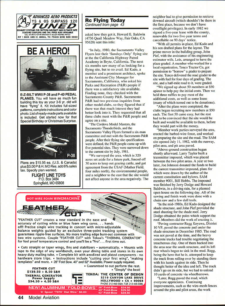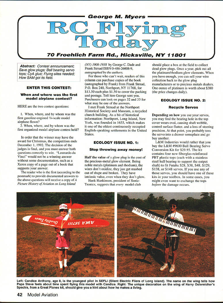 Abstract Contest announcement Save glow plugs Ball bearing senio tops CyA glue Flying sites needed SAM got its field ENTER THIS CONTEST first model airplane contest HERE two contest questions 1 When first gasoline-engined 114-scale model airplane flown 2 When first organized model airplane contest held order winner may have award Christmas competition ends December 1 1992 decision judges final must answer both questions correctly win Leonardo da Vinci would winning answer some documentation such Xerox copy page out book supports answer reader first according postmark provide documented answers above questions will receive copy Picture History ofAviation Long Island NY 1908-1938 George C Dade Frank Strnad ISBN 0-486-26008-9 autographed authors cant wait readers column can purchase copies book autographed Frank Frank Strnad PO Box 240 Northport NY 11768 $1350 plus $150 cover packing postage Tell him George sent Purchasers can look pages 32 33 what may answers met Frank Strnad Northport Historical Society Museum recycled church building As bit historical information Northport Long Island New York founded 1655 makes oldest continuously occupied English-speaking settlements United States ECOLOGY ISSUE NO 1 Stop throwing away money Half value glow plug cost precious-metal glow element Being noble metals platinum rhodium wires dont oxidize just get mashed out shape broken have intrinsic value dont glow Hank Hankinson president Sonic Tronics suggests model club should place box field collect dead glow plugs Once year pick out platinum/rhodium glow elements have enough can sell wire collection back glow plug manufacturers precious metals dealers ounce platinum worth about $380 price changes daily ECOLOGY ISSUE NO2 Recycle Servos Depending use servos may find bearing hole top cover wears oval causing shaft wobble control surface flutter loss steering precision point probably toss servo drawer someplace go buy another L&M Industries would rather buy L&M #9600 Ball Bearing Servo Conversion Kit $2995 kit contains four new fiberglas-reinforced PBT plastic tops stainless steel ball bearing support output shaft fit Futaba S28 S38 S48 S 129 S138 S148 servos use servos should have kits toolbox some cases might want exchange tops before damage occurs Left Candice Anthony age 8 youngest pilot SEFLI Silent Electric Fliers Long Island name wing tells Papa Steve feels about time spent flying model Candice Right unique decoration wing Harry Ostereichers Spectra Great Planes kit should give hint about makes living 42 Model Aviation George M Myers 70 Froehlich Farm Rd HicksviIIe NY 11801 ECOLOGY ISSUE NO3 Use instant glue facts CyA glue now people know some cyanoacrylate CyA adhesives have unpleasant odor others dont Some thick some thin Some attack plastics others dont Some harden bottle almost immediately pick whatever bottle labeled use intend make use till doesnt work Bob Smith Bob Smith Industries Atascadero California thinks can better first place label bottle CyA glue plainly says Store cool dry place CyA adhesive first hit market called Eastman 910 1950s stored refrigerator Some people stored freezer learned hardened almost immediately warmed up learned CyA hardened bottle left out sunlight spite what did some bottles could used till empty others couldnt So manufacturers began selling smaller bottles learned moisture air hardened CyA could breathe joint make CyA harden quicker soaking water no help Boiling water releases bond metal will reattach cools also learned certain alkali salts like baking soda could harden CyA almost immediately could used fill gaps Heat can harden CyA too too much heat destroys Practically anything speed up hardening process also makes CyA brittle learned certain amines could harden CyA quickly causing excessive embrittlement amines smell bad Now have have hardeners like Bob Smith Insta-Set smell vanilla Age biggest enemy bottled CyA glue stuff will harden bottle after couple years no matter what Bob Smith Industries claims sell freshest CyA market dealers shelf less month after made USA addition labels bottles thin aluminum exclude much light practical Bob Smith CyA has guaranteed shelf life two years Theres problem Bobyou forgot date bottles ask him nicely hobby dealer will probably write date box CyA puts shelf sale will give both him some idea long can expect store stuff before throw out puts CyA bright sunlight someplace temperature changes lot buy somewhere else Preserving vanishing flying site Several clubs send newsletters month go unmentioned am grateful people think enough column send am ashamed appear uncaring care Thats mention Prop Wash newsletter Cape May New Jersey WASPs contains note outside cover saying need new field because lease will expire three years serious look ask now well find what need can Give credit looking early Some people just give up hobby lose field Perhaps reader will see need expressed inspired something about about Contact club secretary Tor Anderson PO Box 11 Cape May Court House NJ 08210 Thunderbolts Albany Oregon have already lost field seeking another letter says part being pushed out cityowned field have flown 20 years Babes woods comes approaching people find new flying site need advice agree Model Aviation can should help us other clubs fix printing articles get field sent Rod Rickel secretary/treasurer Thunderbolts RC Club 3800 Mountain View Drive SP 109 Albany OR 97321 Give Rod suggestions Editors note editor must psychic having scheduled publication RAMS Club Field Dreams August 1992 issue article dealt detail club got its new flying site RMcM HOW THE SACRAMENTO AREA MODELERS GOT THEIR FIELD visited Sacramento Area Modelers SAM field September 1987 guest George P Steiner impressed nice facility enjoy September1992 43 Ed Gandorf electric-powered Playboy Cabina fine competitor Old-Timer event built Leisure kit ECOLOGY ISSUE NO4 Continued page 44 Heres pit area Sacramento Area Modelers field stirring saga paving operation construction s
