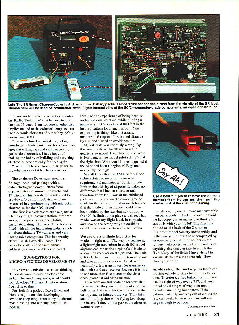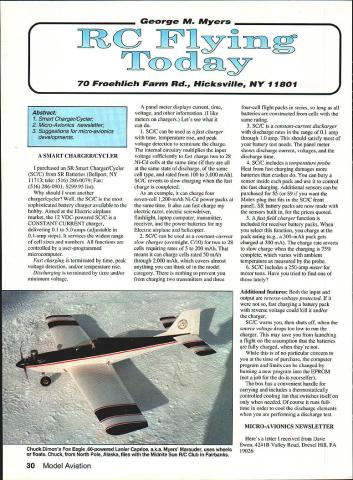 George M Myers JIcZ ZLyfizzi 70 Froehlich Farm Rd Hicksville NY 11801 SMART CHARGER/CYCLER purchased SR Smart Charger/Cycler SC/C SR Batteries Beilport NY 11713 tele 516 286-0079 Fax 516 286-0901 $29995 list should want another charger/cycler Well SC/C sophisticated battery charger available hobby Aimed Electric airplane market 12 VDC-powered SC/C CONSTANT CURRENT charger delivering 01 50 amps adjustable 01-amp steps services widest range cell sizes numbers functions controlled user-programmed microcomputer Fast charging terminated time peak voltage detection and/or temperature rise Discharging terminated time and/or minimum voltage panel meter displays current time voltage other information like meters chargers Lets see what can 1 SC/C can used fast charger time temperature rise peak voltage detection terminate charge internal circuitry multiplies input voltage sufficiently fast charge two 28 Ni-Cd cells same time same state discharge same cell type rated 100 5000 mAh SC/C reverts slow charging fast charge completed As example can charge four seven-cell 1 200-mAh Ni-Cd power packs same time also can fast charge electric razor electric screwdriver flashlight laptop computer transmitter receiver power batteries Electric airplane helicopter 2 SC/C can used constant-current slow charger overnight C/l0 two 28 cells requiring rates 5 200 mAh means can charge cells rated 50 mAh through 2000 mAh covers almost anything can think model category nothing prevent charging two transmitters three four-cell flight packs series long batteries constructed cells same rating 3 SC/C constant-current discharger discharge rates range 01 amp through 10 amp should satisfy battery test needs panel meter shows discharge current voltages discharge time 4 SC/C includes temperature probe Heat fast charging damages batteries crashes can bury sensor inside pack use control fast charging Additional sensors can purchased $5 $9 want Molex plug fits SC/C front panel SR battery packs now made sensors built prices quoted 5 fast field charger function included receiver battery packs select function charge pack rating eg 300-mAh pack gets charged 300 mA charge rate reverts slow charge charging 75% complete varies ambient temperature measured probe 6 SC/C includes 250-amp meter motor tests Have tried find lately Additional features Both input output reverse-voltage protected fast charging battery pack reverse voltage could kill and/or charger SC/C warns shuts off source voltage drops too low run charger may save launching flight assumption batteries folly charged theyre no particular concern time purchase computer program limits can changed burning new program EPROM job do-it-yourselfer box has convenient handle carrying includes thermostatically controlled cooling fan switches itself needed course runs fulltime order cool discharge elements performing discharge test MICRO-AVIONICS NEWSLETTER Heres letter received Dave Ewen 4241B Valley Road Drexel Hill PA 19026 30 Model Aviation Abstract 1 Smart Charger/Cycler 2 Micro-Avionics newsletter 3 Suggestions micro-avionics developments LfluCK vimons Iox Eagle 60-powered Lanier Caprice aka Myers Marauder uses wheels floats Chuck North Pole Alaska flies Midnite Sun R/C Club Fairbanks read interest historical notes Radio Technique has existed past 16 years am sure whether implies end columns emphasis electronic elements hobby No doesn tGMM have enclosed initial copy newsletter intended RCers have willingness skills necessary get inside electronics have hopes making hobby building servicing electronics economically feasible again will write again 16 years say whether has success enclosure Dave mentioned 52-page loose-leaf package color-photograph cover letters experimenters around world 17 articles newsletter intended provide forum hobbyists interested experimenting microsize electronics RC aircraft first issue addresses such subjects telemetry flight instrumentation airborne video microprocessors gliding parachute testing back book filled ads interesting gadgets such microminiature TV cameras very inexpensive computers worthy effort wish Dave success projected cost $5 semiannual publication two newsletters per year SUGGESTIONS FOR MICRO-AVIONICS DEVELOPMENTS Dave Ewens mission set thinking people want develop electronic gadgets model airplanes what should develop Im asked question time time first project Dave Ewen friends might consider developing device keep large man-carrying aircraft crashing tiny hard-to-see models Ive bad experience being head-on Stearman biplane piloting man-carrying Cessna 172 800 feet landing pattern small airport expect stupid things like around uncontrolled airports estimated distance size started avoidance turn estimate seriously wrong time realized Stearman quarter-size model too close avoid Fortunately model pilot split-Sed right time What would have happened pilot beginner Beginners always fly too high know AMA Safety Code states some insurance requirements mandates 400-ft altitude limit vicinity airports makes no difference altimeter therefore knew published pattern altitude correct ground track airport makes no difference modelers insurance would have voided fact above 400-ft limit place time model flight level path headed wrong way collision could have disastrous both us could use altitude telemetry modelsright now way visualize lightweight transmitter RC model airplane can report airplanes altitude scanning receiver ground club Safety Officer can monitor transmissions take appropriate action club would need few transmitters transmitter channels receiver because rare see five planes air once except Sailplane meets full-scale helicopters fly anywhere want know police helicopter came back hole canopy injured observer hit small bird grebe flying low along beach theyd hit goose observer would dead Birds general maneuverable models bird couldnt avoid helicopter what makes think can model first rule printed back Grumman Engineers Model Society membership car
