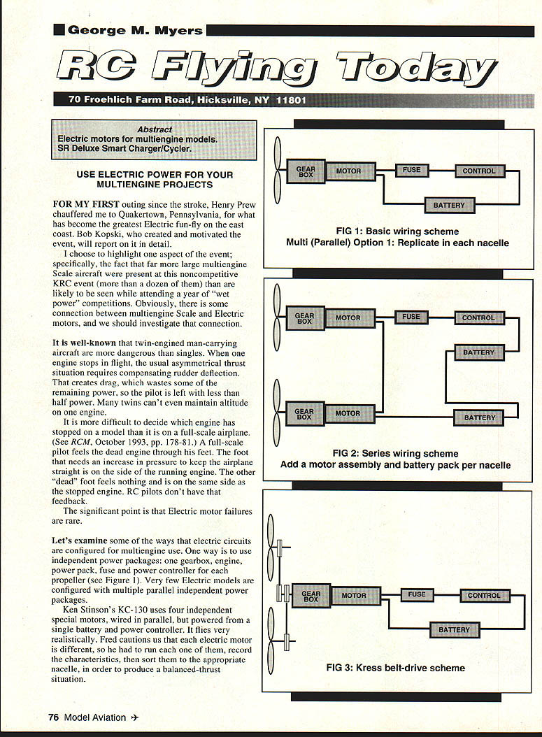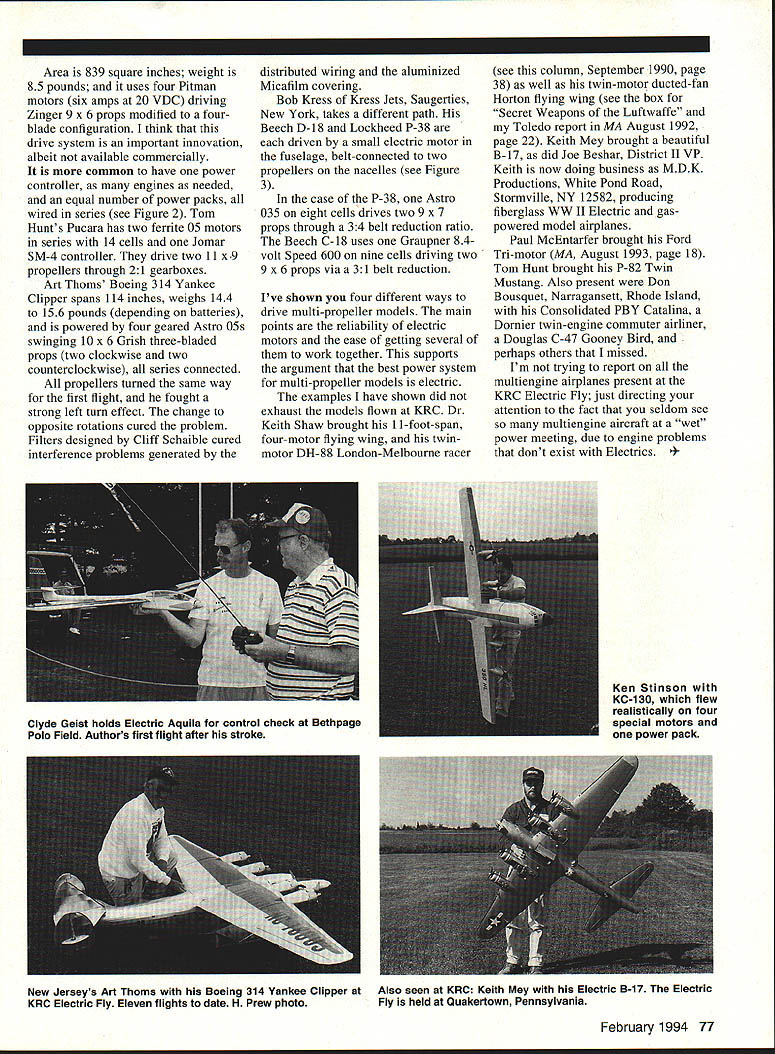 U George M Myers 53@ &U7L17 H3% USE ELECTRIC POWER FOR YOUR MULTIENGINE PROJECTS FOR MY FIRST outing since stroke Henry Prew chauffered Quakertown Pennsylvania what has become greatest Electric fun-fly east coast Bob Kopski created motivated event will report detail choose highlight aspect event specifically fact far large multiengine Scale aircraft present noncompetitive KRC event dozen likely seen attending year wet power competitions Obviously some connection between multiengine Scale Electric motors should investigate connection well-known twin-engined man-carrying aircraft dangerous singles engine stops flight usual asymmetrical thrust situation requires compensating rudder deflection creates drag wastes some remaining power pilot left less half power twins cant maintain altitude engine difficult decide engine has stopped model full-scale airplane See RCM October 1993 pp 178-81 full-scale pilot feels dead engine through feet foot needs increase pressure keep airplane straight side running engine other dead foot feels nothing same side stopped engine RC pilots dont have feedback significant point Electric motor failures rare Lets examine some ways electric circuits configured multiengine use way use independent power packages gearbox engine power pack fuse power controller propeller see Figure 1 Very few Electric models configured multiple parallel independent power packages Ken Stinsons KC-130 uses four independent special motors wired parallel powered single battery power controller flies very realistically Fred cautions us electric motor different run record characteristics sort appropriate nacelle order produce balanced-thrust situation 76 Model Aviation mart FIG 1 Basic wiring scheme Multi Parallel Option 1 Replicate nacelle FIG 2 Series wiring scheme Add motor assembly battery pack per nacelle F FIG 3 Kress belt-drive scheme Area 839 square inches weight 85 pounds uses four Pitman motors six amps 20 VDC driving Zinger 9 x 6 props modified fourblade configuration think drive system important innovation albeit available commercially common have power controller engines needed equal number power packs wired series see Figure 2 Tom Hunts Pucara has two ferrite 05 motors series 14 cells Jomar SM-4 controller drive two 11 x 9 propellers through 21 gearboxes Art Thoms Boeing 314 Yankee Clipper spans 114 inches weighs 144 156 pounds depending batteries powered four geared Astro OSs swinging 10 x 6 Grish three-bladed props two clockwise two counterclockwise series connected propellers turned same way first flight fought strong left turn effect change opposite rotations cured problem Filters designed Cliff Schaible cured interference problems generated distributed wiring aluminized Micafilm covering Bob Kress Kress Jets Saugerties New York takes different path Beech D-18 Lockheed P-38 driven small electric motor fuselage belt-connected two propellers nacelles see Figure 3 case P-38 Astro 035 eight cells drives two 9 x 7 props through 34 belt reduction ratio Beech C-iS uses Graupner 84volt Speed 600 nine cells driving two 9 x 6 props via 31 belt reduction Ive shown four different ways drive multi-propeller models main points reliability electric motors ease getting several work together supports argument best power system multi-propeller models electric examples have shown did exhaust models flown KRC Dr Keith Shaw brought 11-foot-span four-motor flying wing twinmotor DH-88 London-Melbourne racer see column September 1990 page 38 well twin-motor ducted-fan Horton flying wing see box Secret Weapons Luftwaffe Toledo report MA August 1992 page 22 Keith Mey brought beautiful B-17 did Joe Beshar District II VP Keith now doing business MDK Productions White Pond Road Stormville NY 12582 producing fiberglass WW LI Electric gaspowered model airplanes Paul McEntarfer brought Ford Tn-motor MA August 1993 page 18 Tom Hunt brought P-82 Twin Mustang Also present Don Bousquet Narragansett Rhode Island Consolidated PBY Catalina Dornier twin-engine commuter airliner Douglas C-47 Gooney Bird perhaps others missed Im trying report multiengine airplanes present KRC Electric Fly just directing attention fact seldom see multiengine aircraft wet~ power meeting due engine problems dont exist Electrics 4February 1994 77 Clyde Geist holds Electric Aquila control check Bethpage Polo Field Authors first flight after stroke Ken Stinson KC-1 30 flew realistically four special motors power pack New Jerseys Art Thorns Boeing 314 Yankee Clipper KRC Electric Fly Eleven flights date H Prew photo Also seen KRC Keith Mey Electric B-17 Electric Fly held Quakertown Pennsylvania